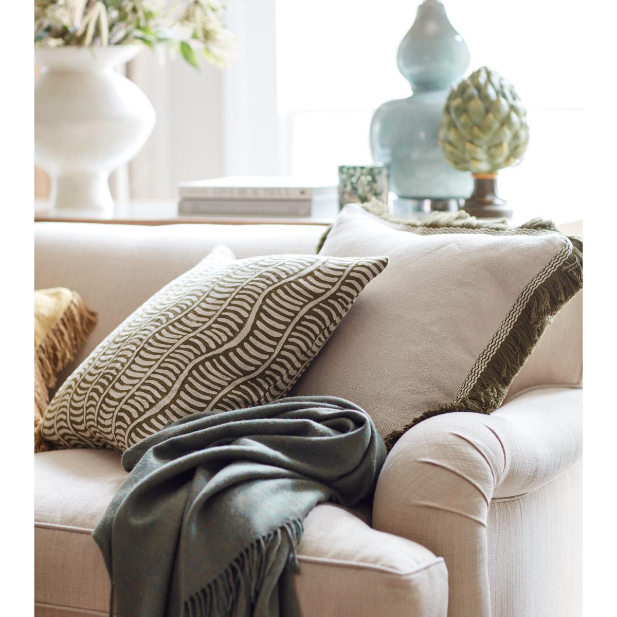 I love this cushion cover for its relaxed yet refined look. The natural tones combined with the green add a fresh, earthy feel that works really well in both contemporary and traditional settings. It’s particularly versatile-ideal for layering on a sofa or armchair in a living room with neutral or muted colour schemes, helping to add texture and visual interest. Practical styling tips include pairing it with other cushions in similar earthy tones or mixing it with patterned ones for a more eclectic vibe. The fringed edge also lends a casual, tactile element that invites touch and adds an inviting finish to your interior.