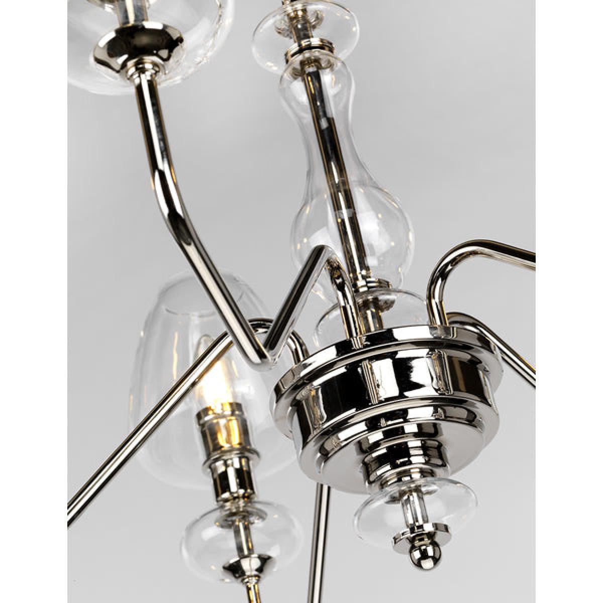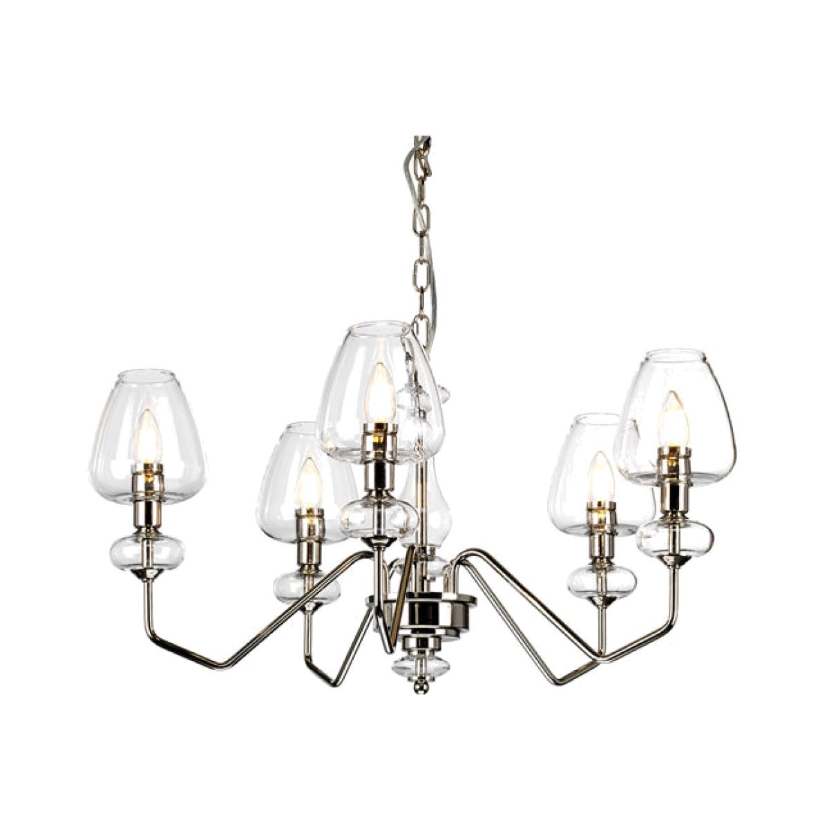 This beautiful Armand Chandelier from Elstead Lighting will make a statement in any room. It takes a creatively angular silhouette and makes exciting use of polished nickel and clear glass. In add. View More. This beautiful Armand Chandelier from Elstead Lighting will make a statement in any room. It takes a creatively angular silhouette and makes exciting use of polished nickel and clear glass. In addition to the five goblet-shaped shades, globular glass accents feature beneath each fitting, around the central stem and above the finial - each helping to fill your room with shimmer and sparkle. The Armand is a substantial and impressive chandelier that can add style and glamour to a variety of rooms. Other sizes, matching wall lights, and an alternative Aged Brass finish are also available. This fixture has a diameter of 73. 2cm.