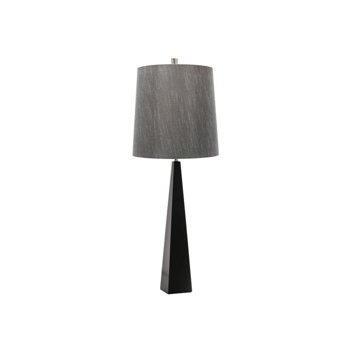For clean, contemporary elegance this Ascent table lamp from Elstead Lighting is hard to beat. It celebrates simplicity and timeless functionality. Its tall tapering steel-constructed column is alm. View More. For clean, contemporary elegance this Ascent table lamp from Elstead Lighting is hard to beat. It celebrates simplicity and timeless functionality. Its tall tapering steel-constructed column is almost monolithic, reminiscent of Cleopatra's Needle, and expresses an uncluttered geometric precision. Above the black-painted base, a slim stem glinting of polished nickel supports the bulb fitting and a grey faux silk shade with a subtle diagonal grain. The Ascent's simple elegance can add some real character to your home environment. The Ascent range also includes matching floor lamps and both are available in alternative finishes (white or polished nickel). This table lamp stands 64cm high overall.