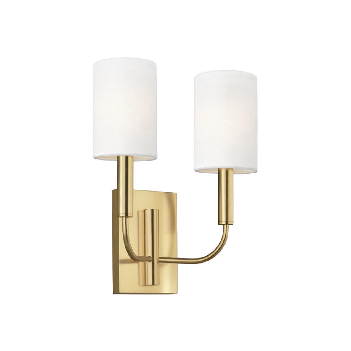 The delightful Brianna wall light goes for an entirely modern minimalism with clear lines and sleek finishes. The tall slim simplicity of the design endows it with an uplifting grace like that the Statue of Liberty holding aloft its torch - but with none of the baggage. With tubular arms outstretched, the 2-light Brianna wall fixture promises to light up even the most monochrome of rooms. The finish on this piece is Burnished Brass but the same design is also available in Polished Nickel. The shades are cylinders of white linen. There are also matching single light sconces and chandeliers available in this style. *Moot Trading Ltd is not a lender and acts only as an introducer. The credit product is provided by Klarna Bank AB (publ). Credit is only available to permanent UK residents aged 18 and over, subject to status. Terms and conditions apply. Please note that the following products are not regulated by the FCA: Pay in 30 days and Pay in 3 instalments. Read More.