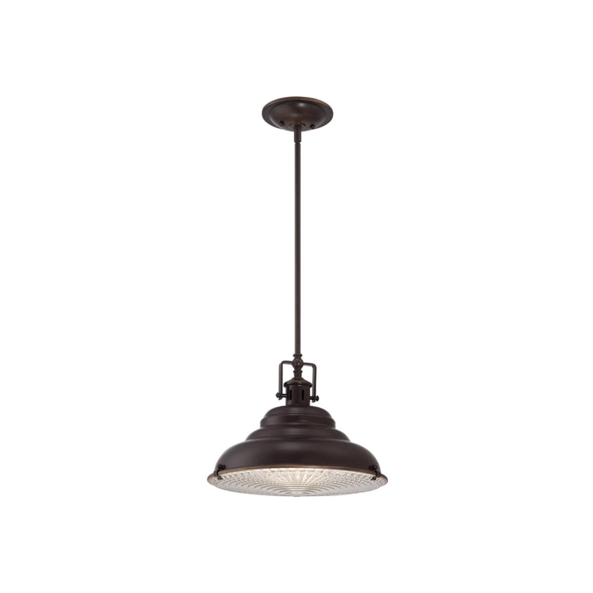 The East Vale pendant sets out to meld classic industrial design with contemporary technology and achieves it beautifully. The East Vale pendant can provide an artistic style statement within an ur. View More. The East Vale pendant sets out to meld classic industrial design with contemporary technology and achieves it beautifully. The East Vale pendant can provide an artistic style statement within an urban décor or serve a purely utilitarian lighting solution in a kitchen, bar, library or workshop. The lamp is from Elstead's Quoizel collection and is finished in high quality Palladian Bronze. The fitting is designed to take a single 60W E27 light bulb (not included) and the bottom is fitted with a dappled glass diffuser to eliminate glare and scatter light evenly. The pendant hangs on rods that can be adjusted in length.