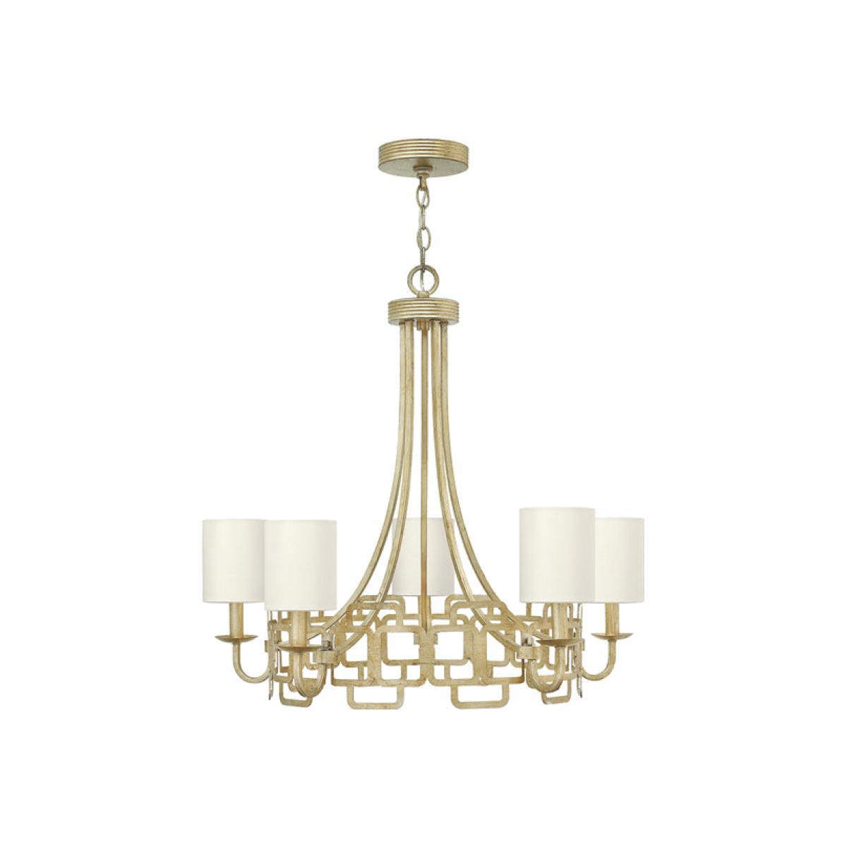 Putting a new spin on the traditional design on the chandelier is the artistic Sabina 5 light silver leaf chandelier. The Sabina range utilises geometric shapes between the arms of the chandelier, creating a fantastic silhouette against the lamps. The 5 individual lamps each have their own eggshell silk shade, diffusing the light beautifully. The distressed gold varnish across the entirety of the metal work provides a glistening finish, as well as an overall highly opulent feel. The Sabina chandelier has a diameter of 71. 1cm and height of 66cm, and a capacity of 5 E14 bulbs, which are not included. *Moot Trading Ltd is not a lender and acts only as an introducer. The credit product is provided by Klarna Bank AB (publ). Credit is only available to permanent UK residents aged 18 and over, subject to status. Terms and conditions apply. Please note that the following products are not regulated by the FCA: Pay in 30 days and Pay in 3 instalments. Read More.