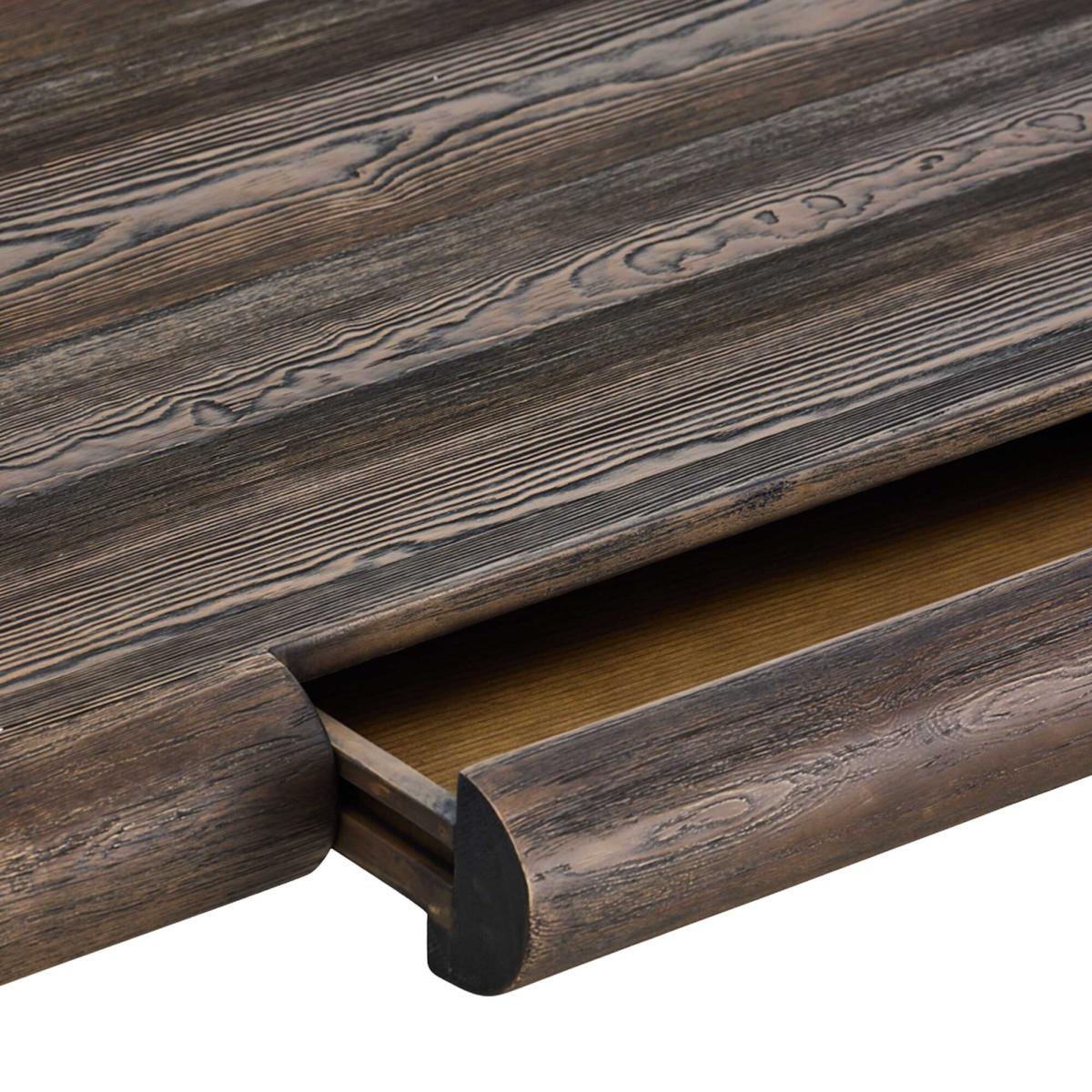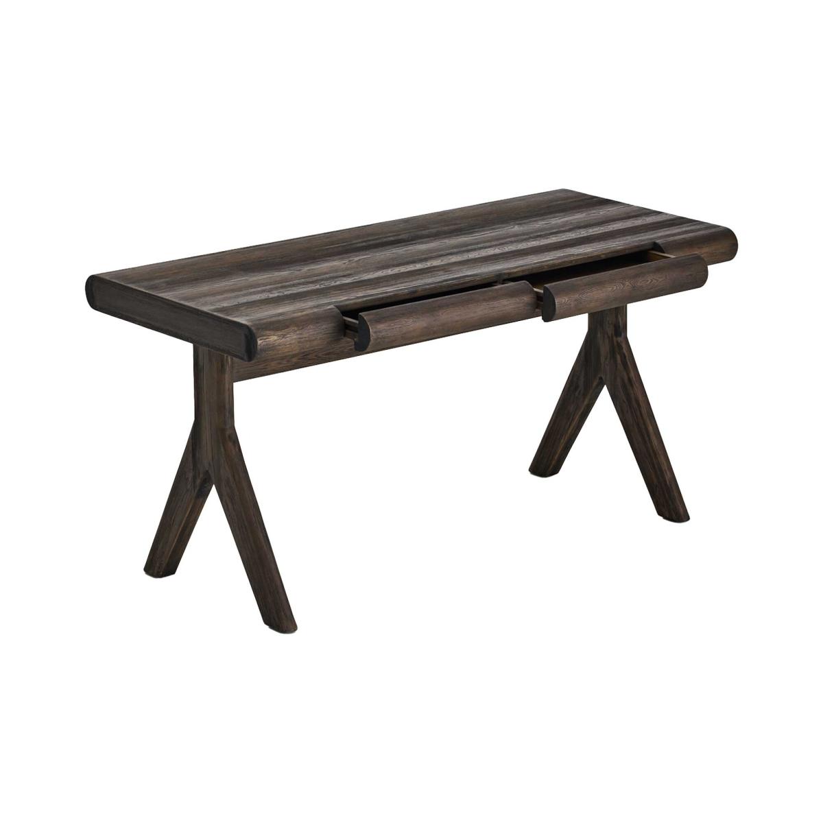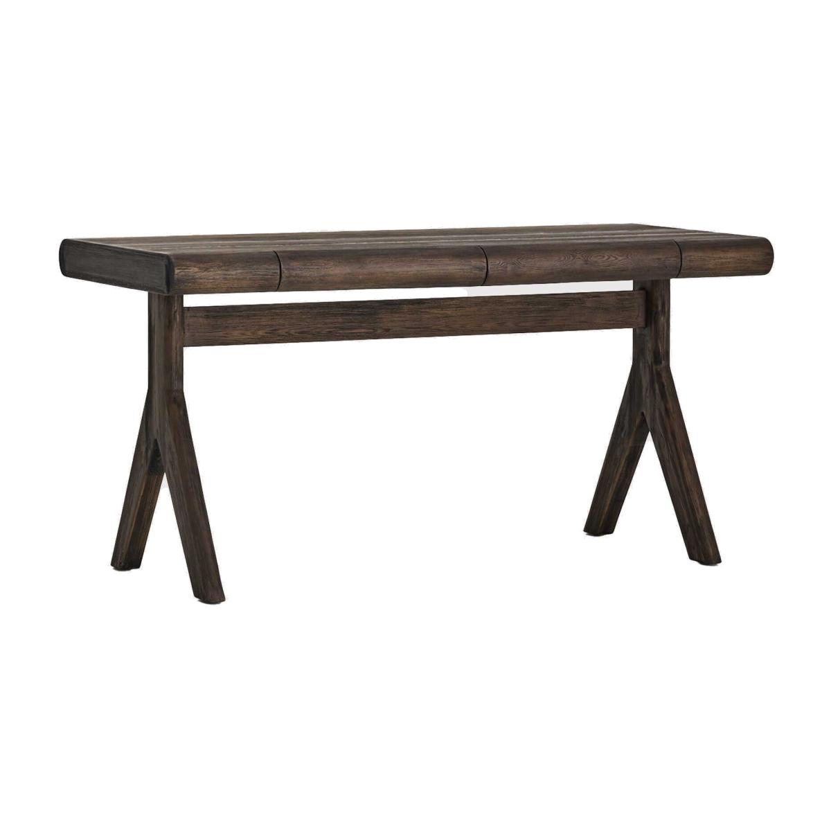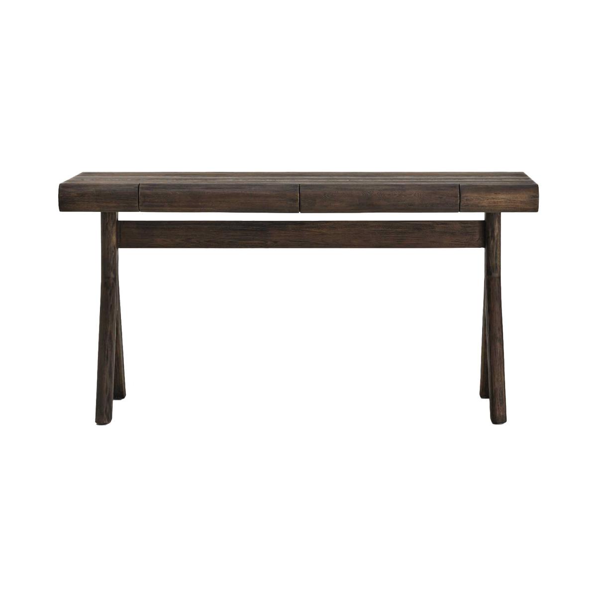 This slim office desk is crafted from pine with a brushed black/brown finish, offering a sleek, modern look with rustic character. Featuring two handy drawers for storing stationery and essentials, it combines style and function in a compact design—perfect for home offices or smaller workspaces.