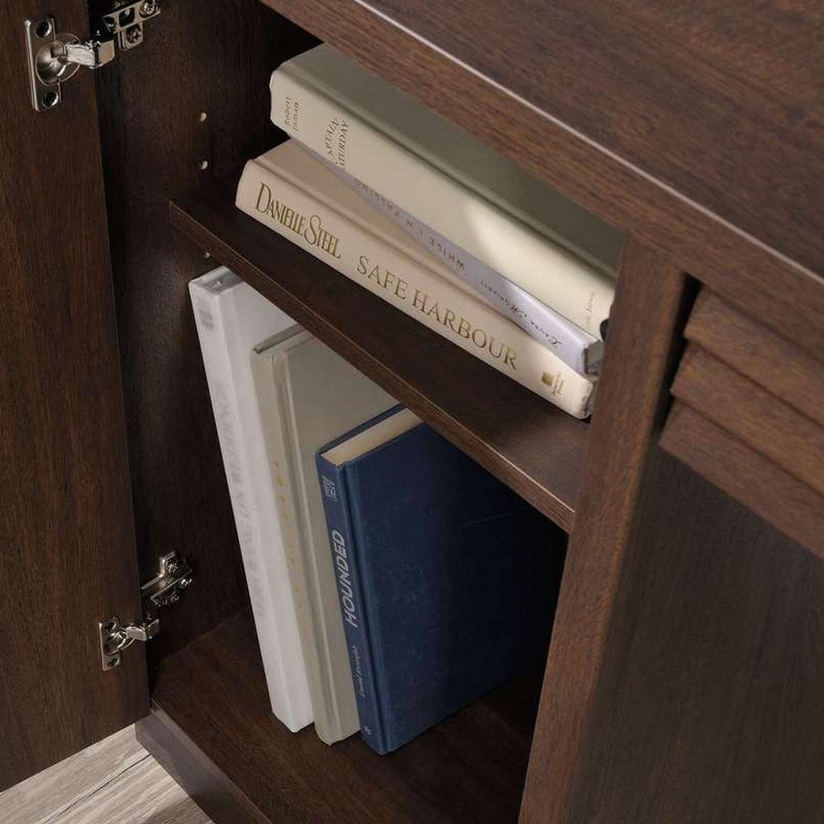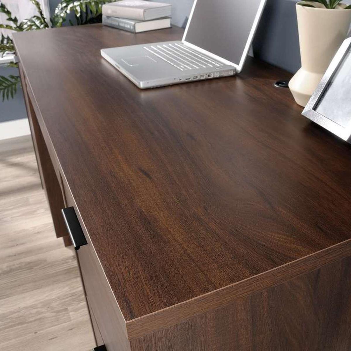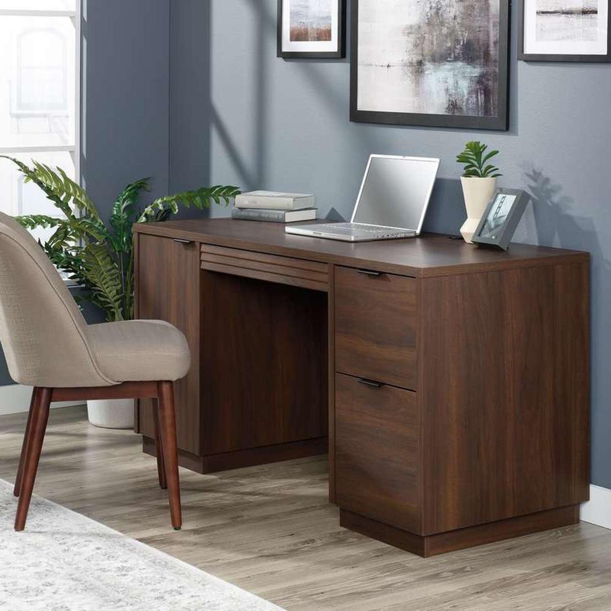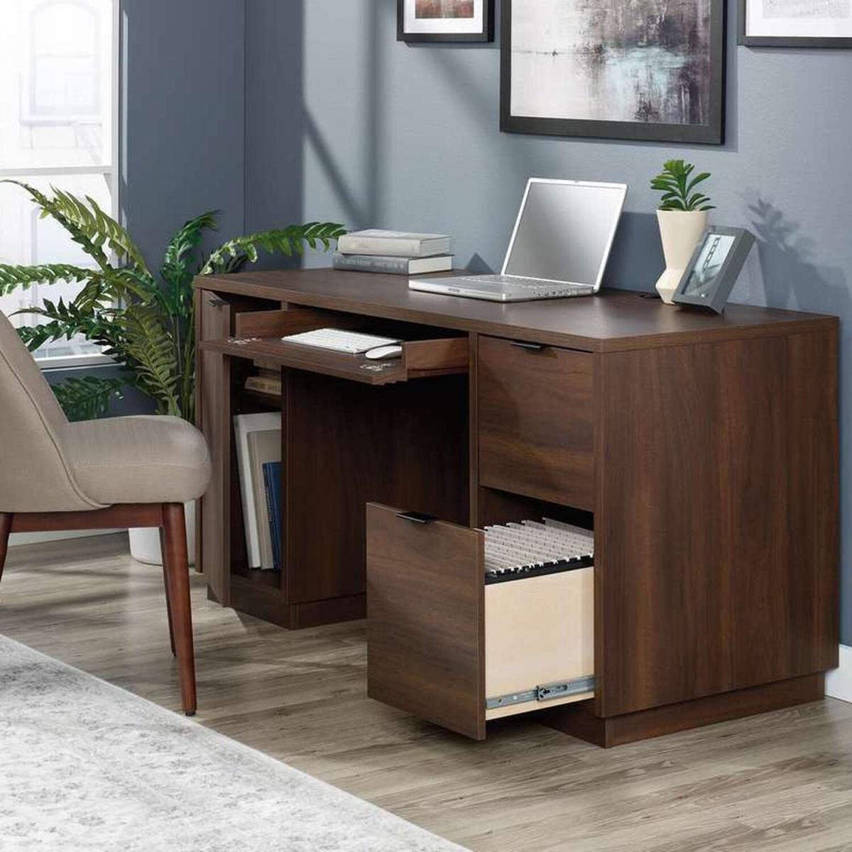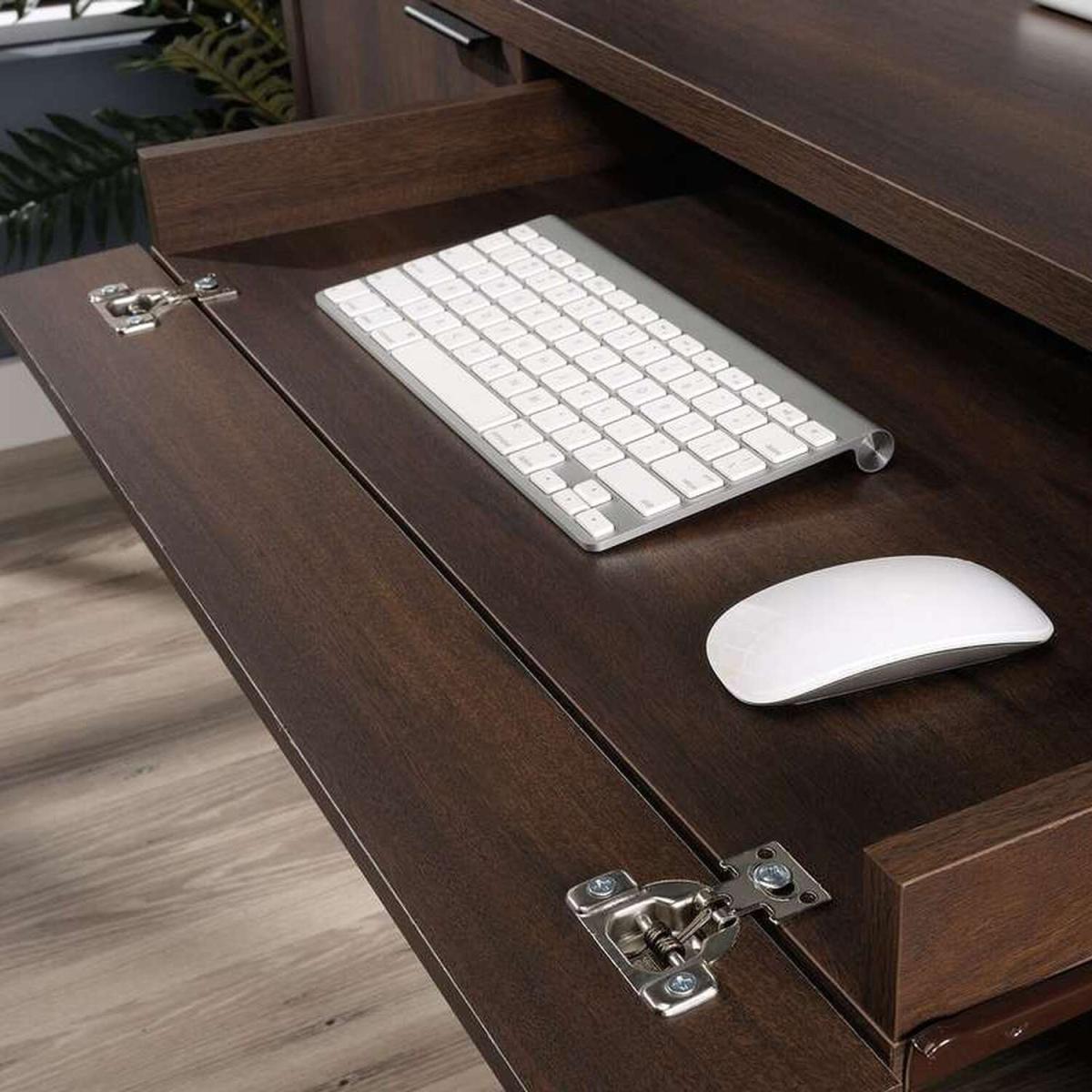 Teknik Office Elstree Double Pedestal Desk in a Spiced Mahogany finish features a slide-out shelf with metal runners, safety stops and a flip-down panel for keyboard/mouse storage, three drawers, a lockable filing drawer and an additional storage area for vertical CPU tower.