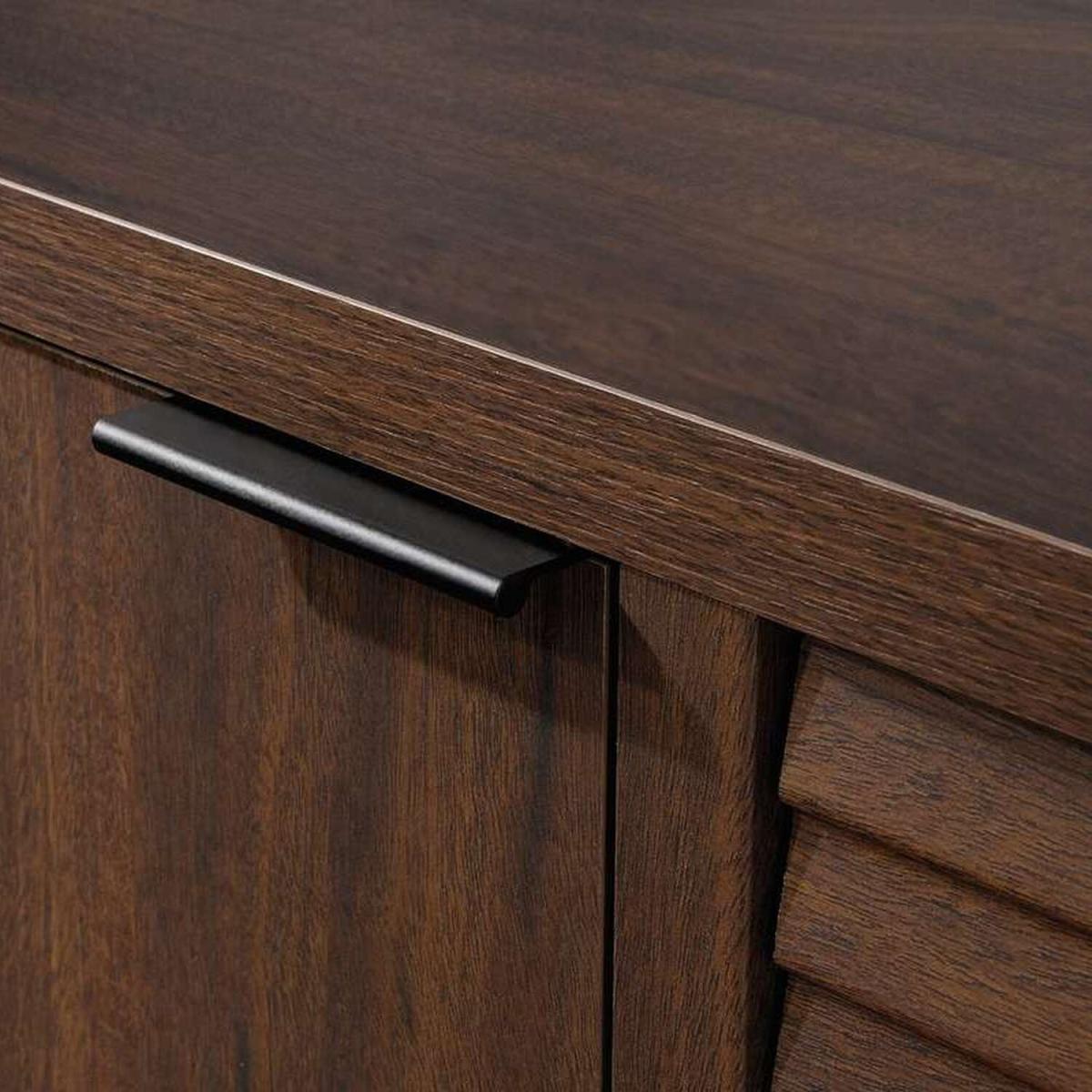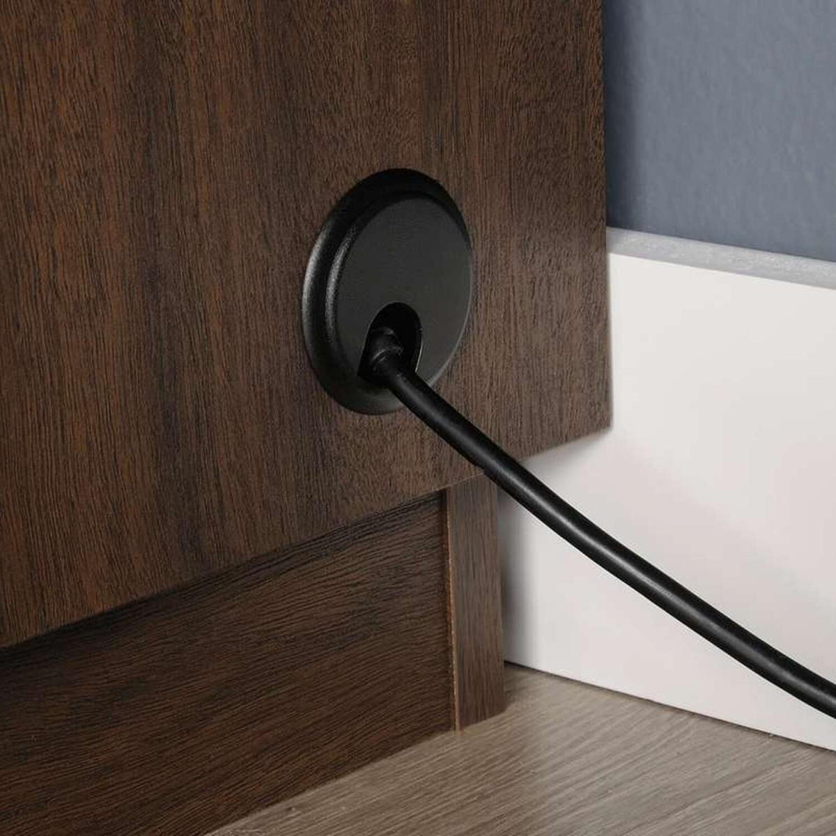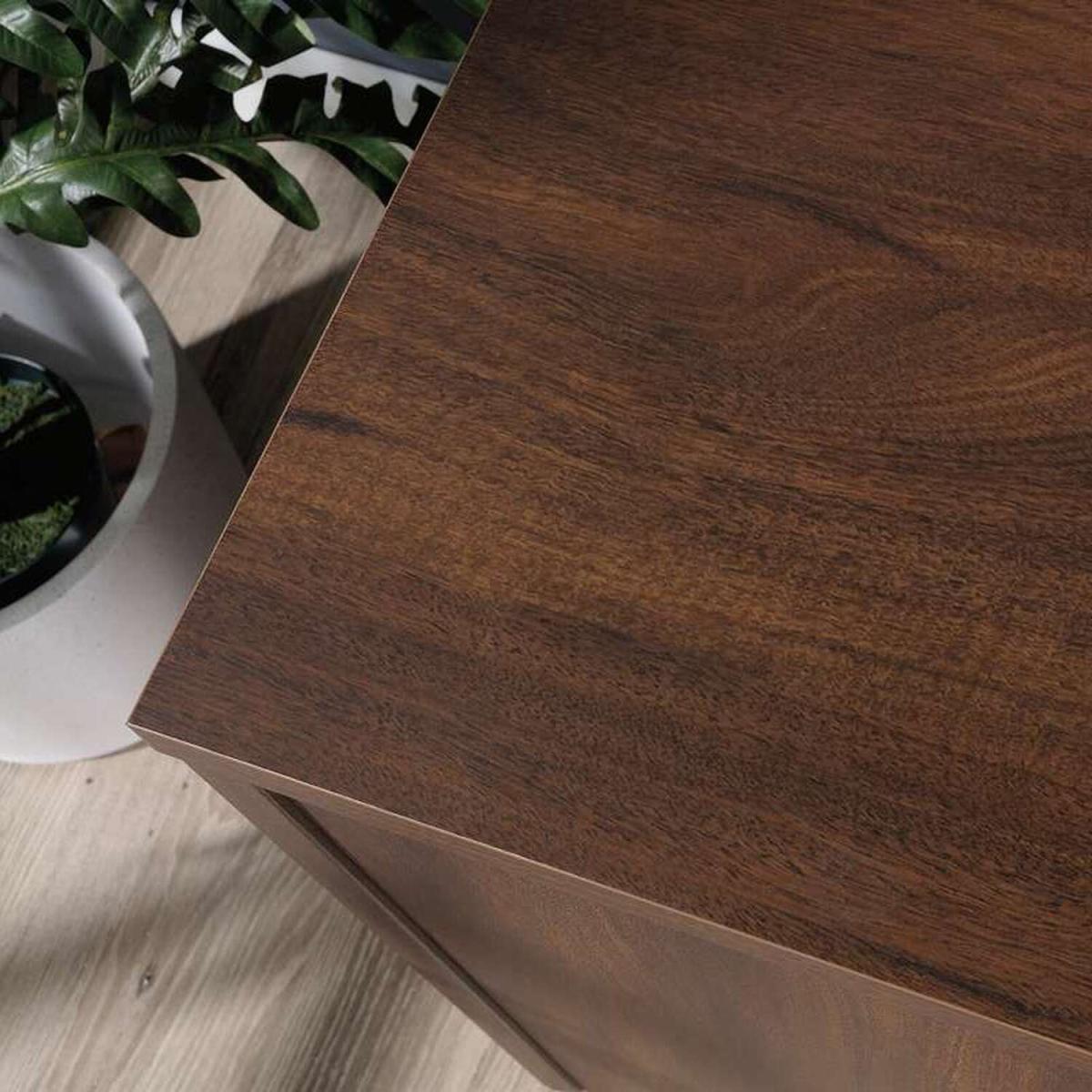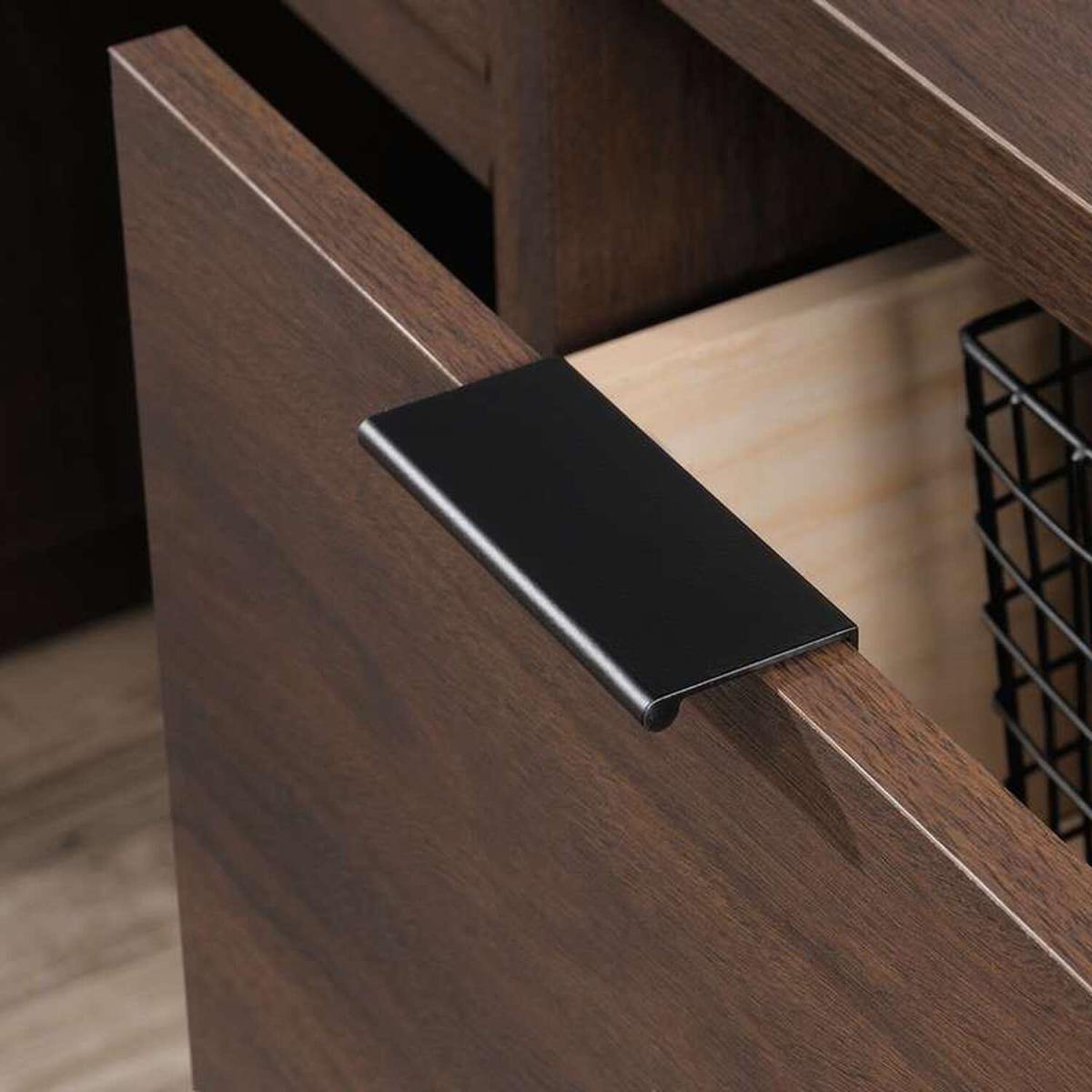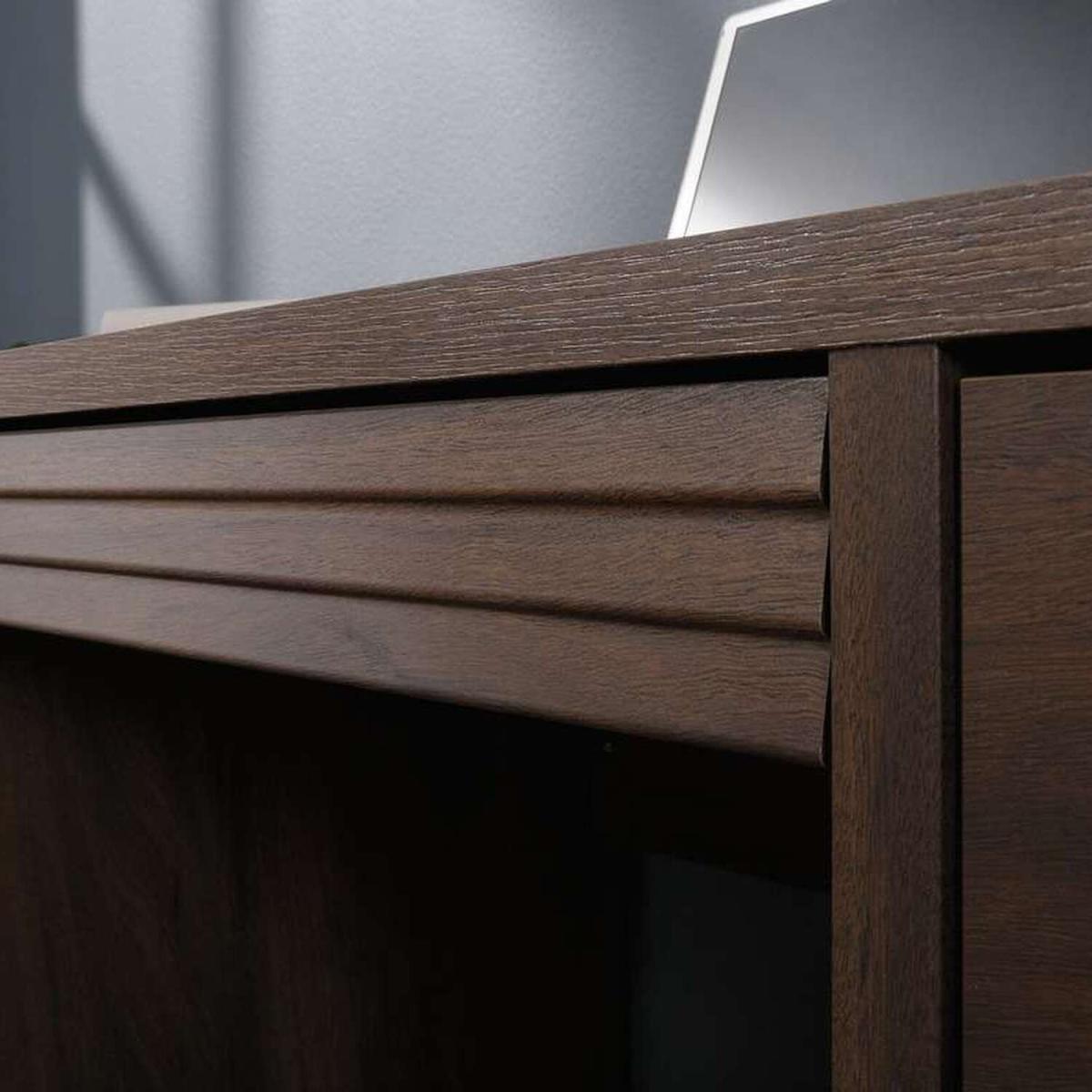 Teknik Office Elstree Double Pedestal Desk in a Spiced Mahogany finish features a slide-out shelf with metal runners, safety stops and a flip-down panel for keyboard/mouse storage, three drawers, a lockable filing drawer and an additional storage area for vertical CPU tower.