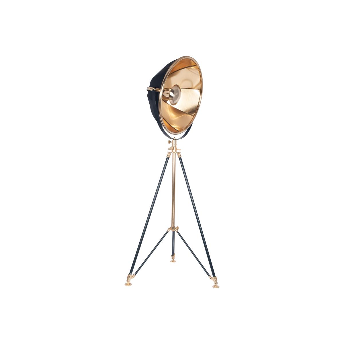 Add retro glamour to your home with this striking cinematic-style floor lamp. The large round lamp has a black shade with a contrasting metallic-finish inner and a dome diffuser which softens the light. Why you'll love it. Striking tripod floor lamp inspired by old Hollywood movie lighting. Sophisticated glam style. Elegant tripod base. In 2 colourways – black and silver, and black and gold. Lamp has a metallic lining. Dome diffuser creates soft and atmospheric lighting. This tripod floor lamp is part of the Furniture Village home accessories collection. What you need to know. Black fabric lamp shade. Metal lamp base. Requires 9W ES/E27 GLS LED bulb. Please always use the correct light bulb for this floor lamp to avoid overheating. Dimensions. Height: 190 cm (75 in). Depth: 73 cm (29 in). Width: 64 cm (25 in).