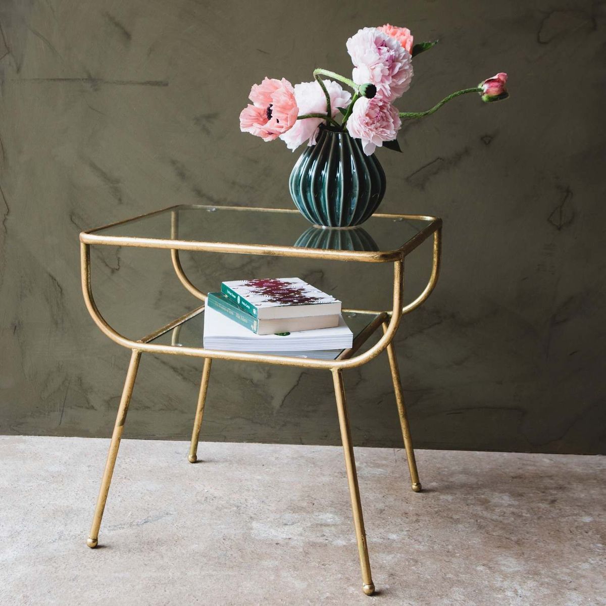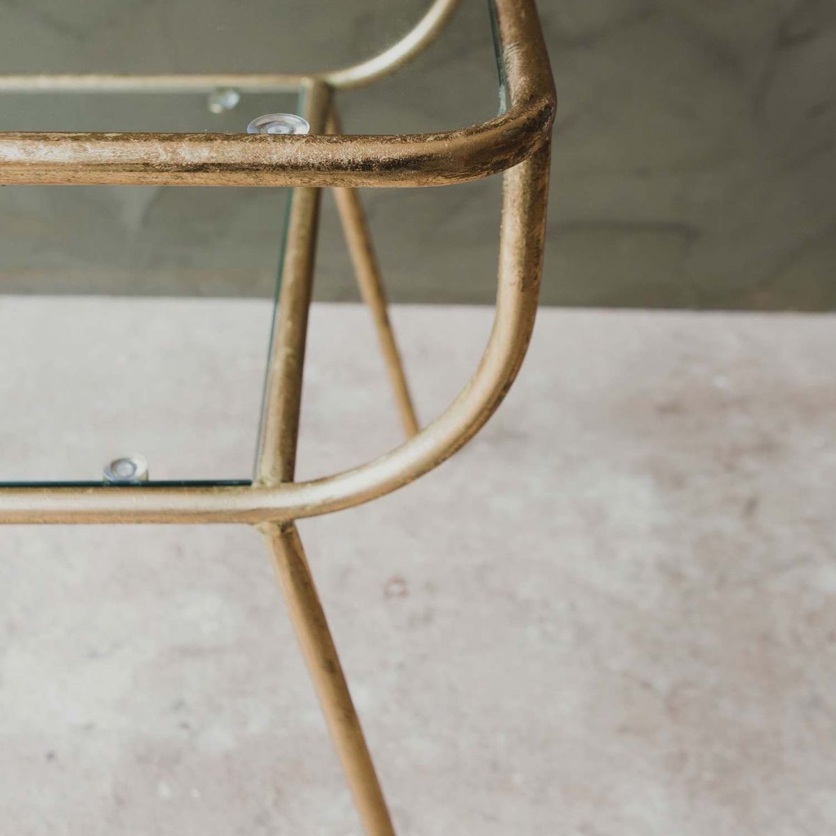 Our Eluminea side table exudes contemporary elegance. Made from iron with a stylish antiqued gold finish, the sleek frame of this piece supports a rectangular glass top, with a smaller glass shelf underneath intended for storage and display. Simple design and opulent metallic detail combine to make this piece a wonderful addition to any sitting room.