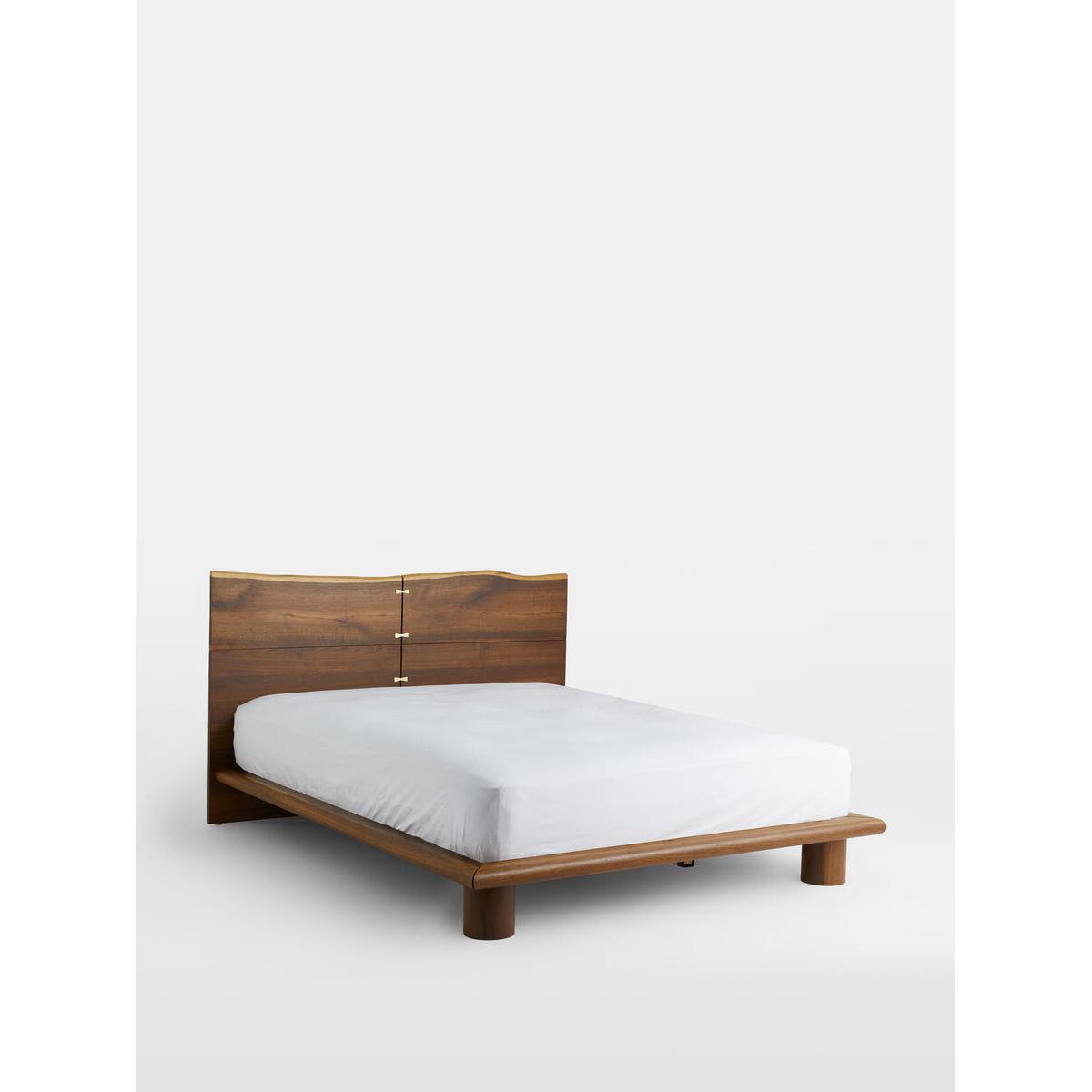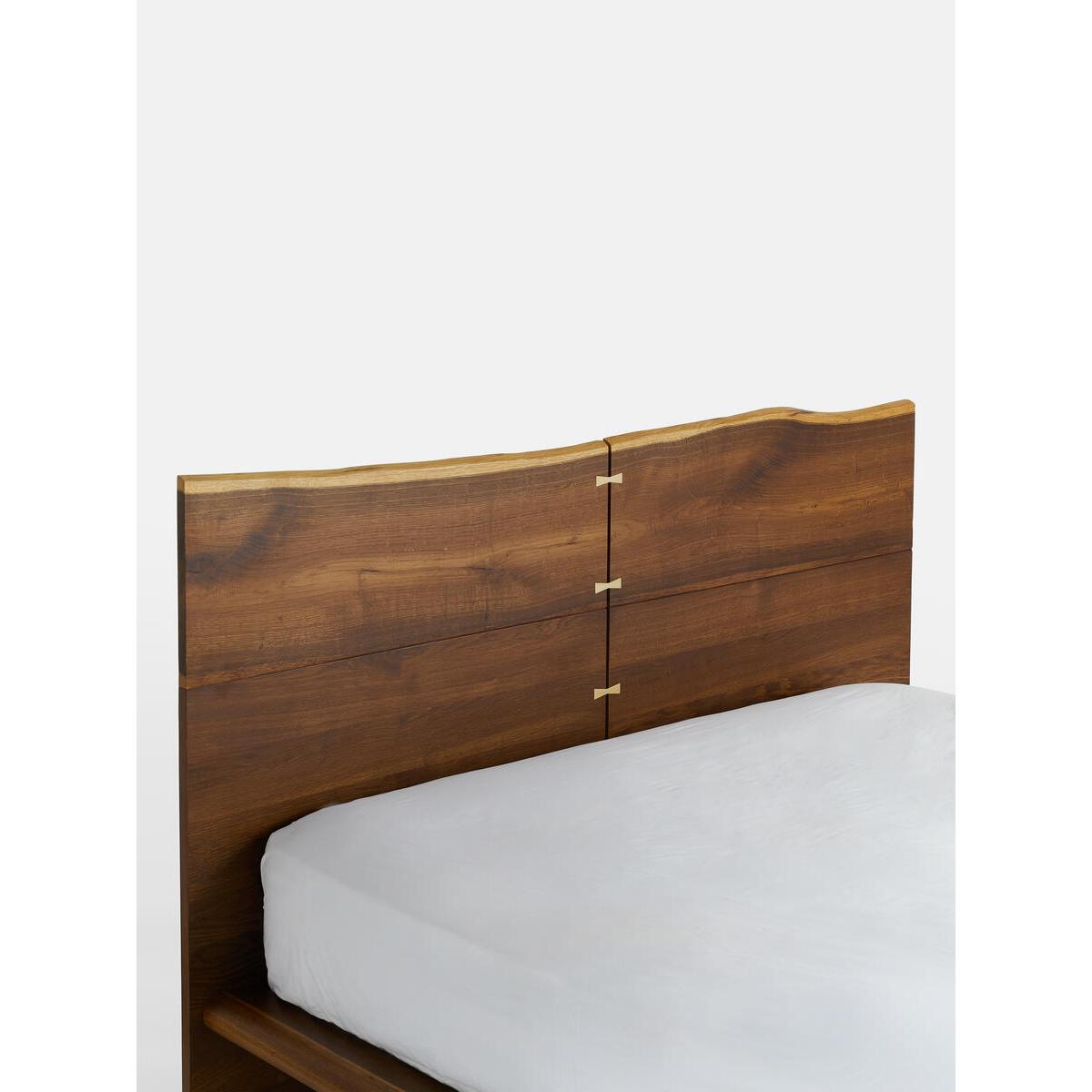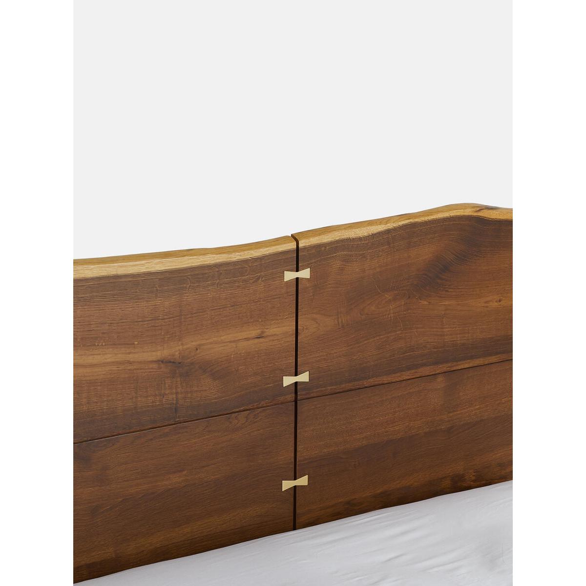 This bedstead features a clean, modern design and a versatileoak finish. The cylindrical legs and brass hardware provide aunique statement for your bedroom. Bedstead with live-edge French oak headboard. Solid oak frame with brass detailing. Cylindrical legs. Inspired by Soho House Barcelona.