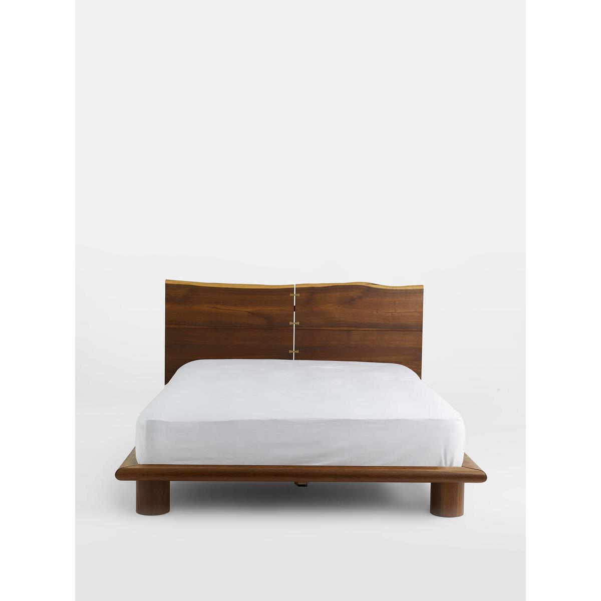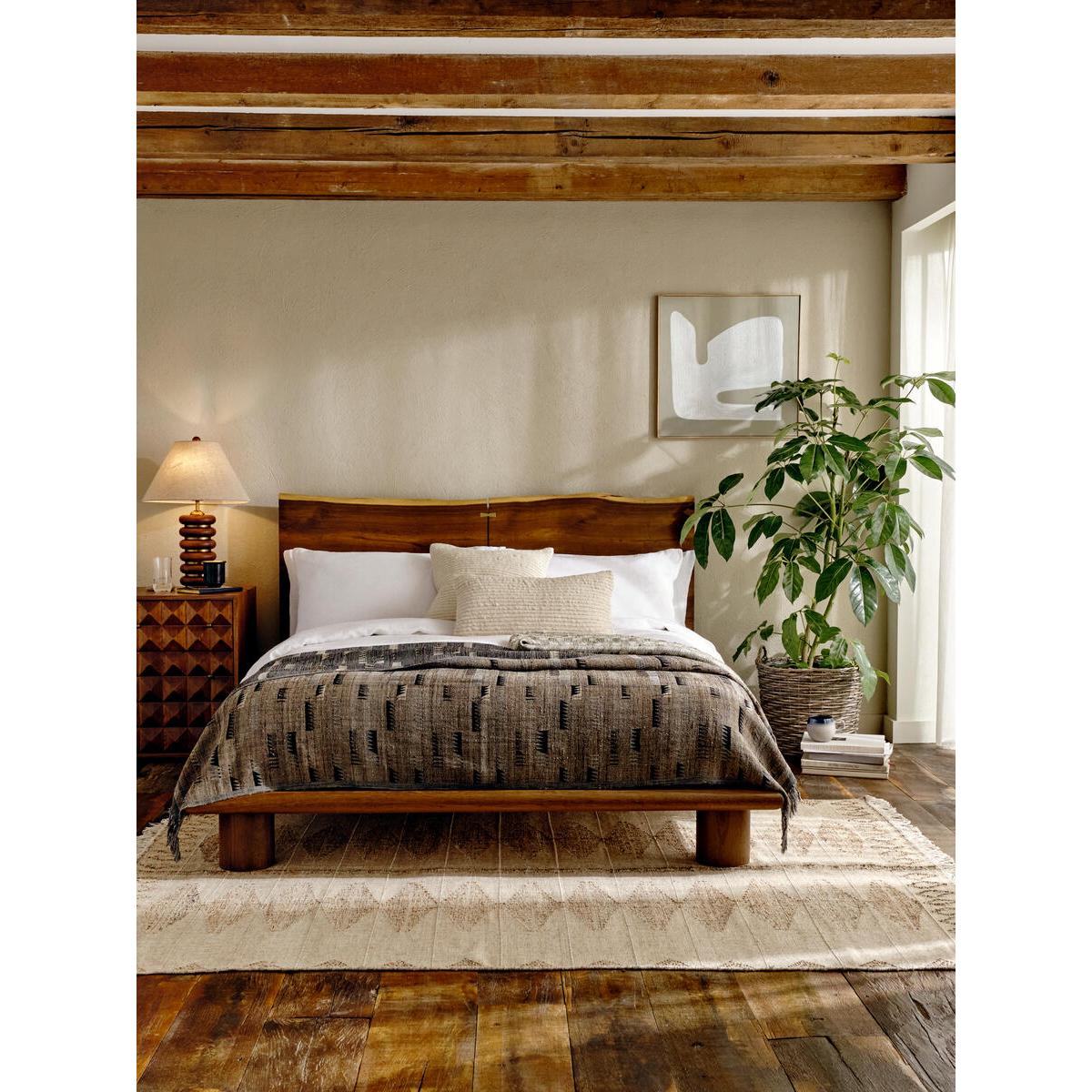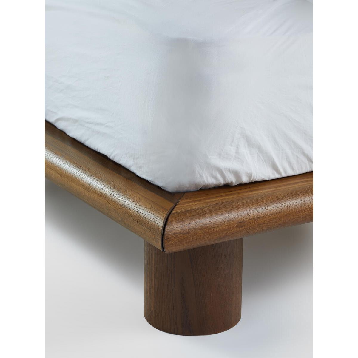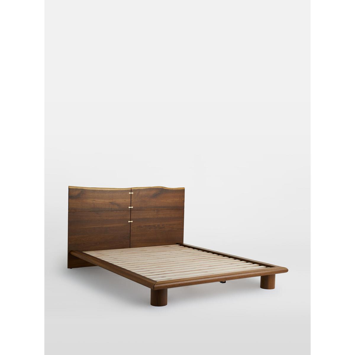 This bedstead features a clean, modern design and a versatileoak finish. The cylindrical legs and brass hardware provide aunique statement for your bedroom. Bedstead with live-edge French oak headboard. Solid oak frame with brass detailing. Cylindrical legs. Inspired by Soho House Barcelona.
