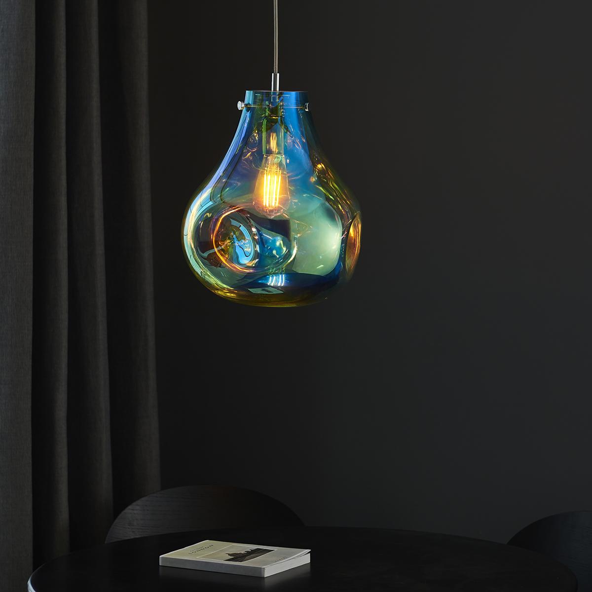 Illuminate your home with the Elvera range. This light fitting with chrome plate features an oversized glass bulb pendant with a mesmerising melting effect and iridescent finish.