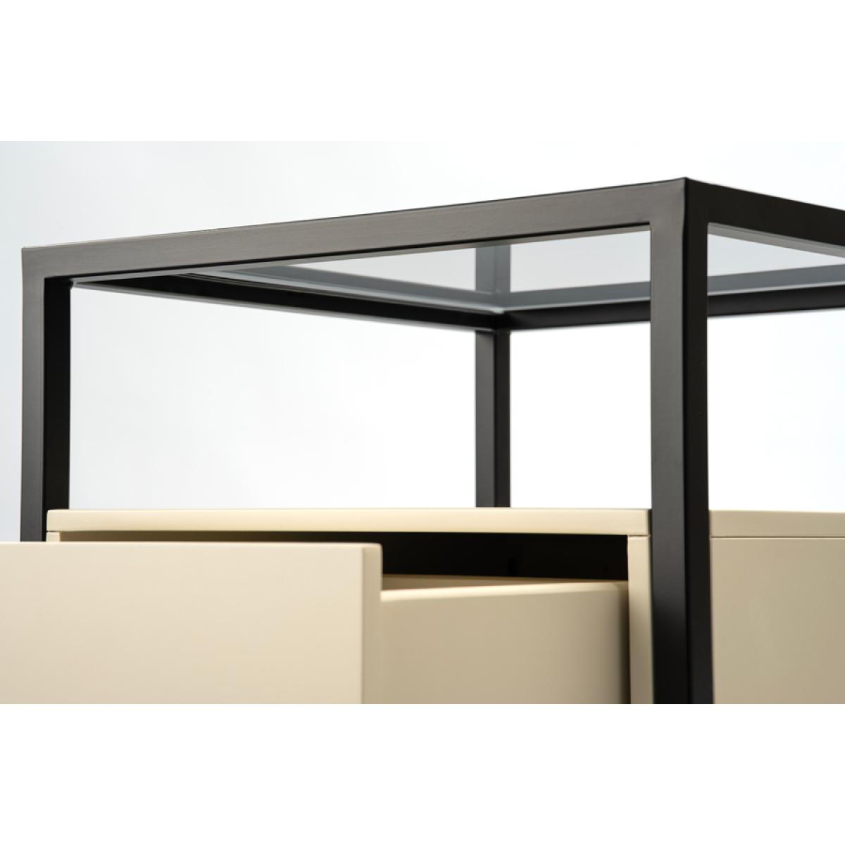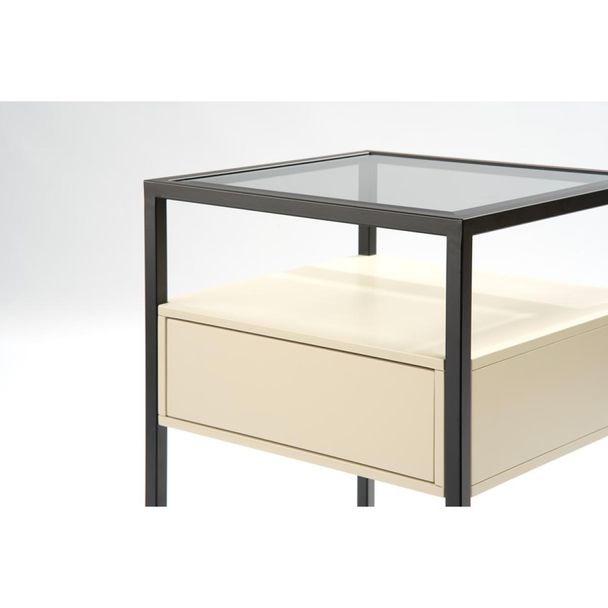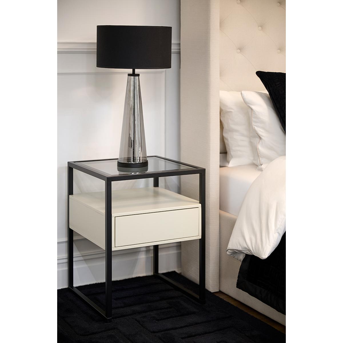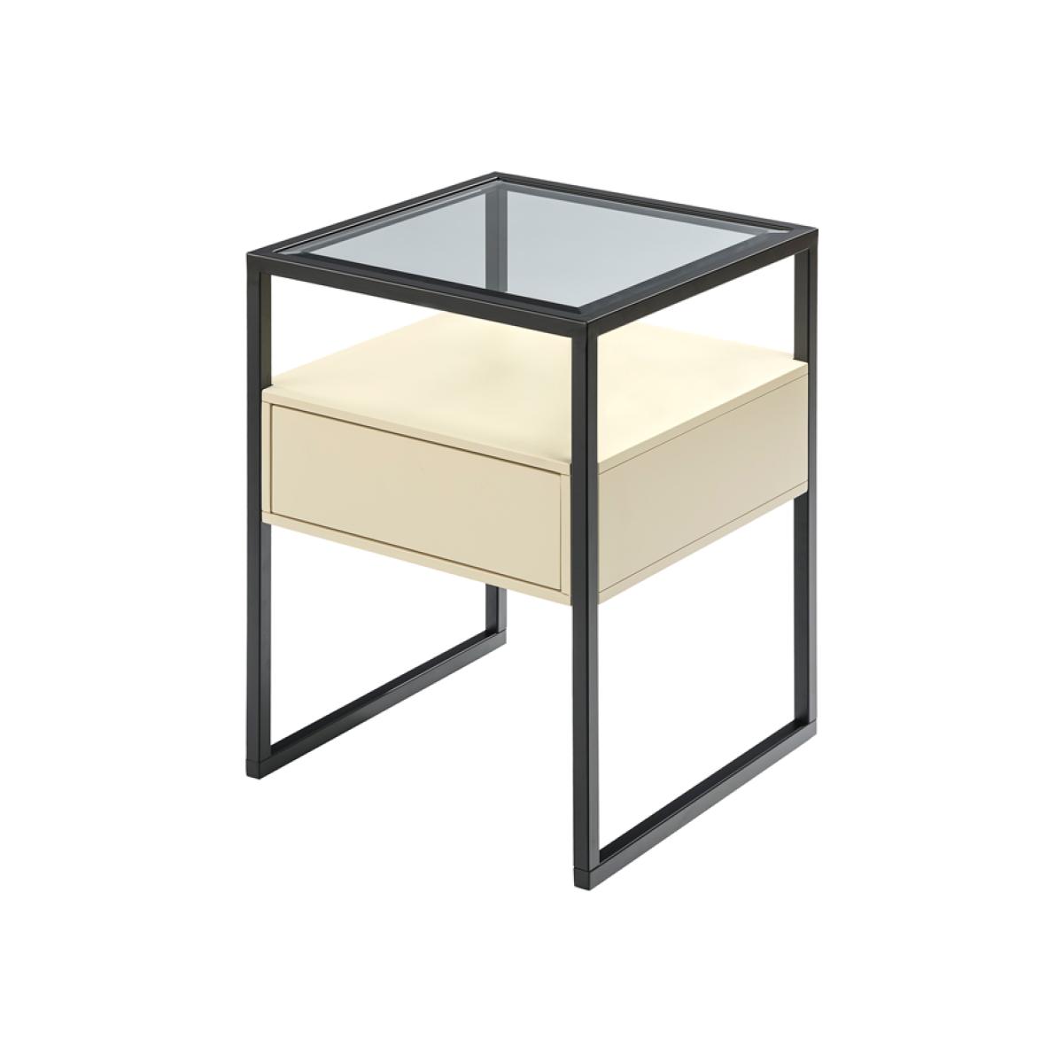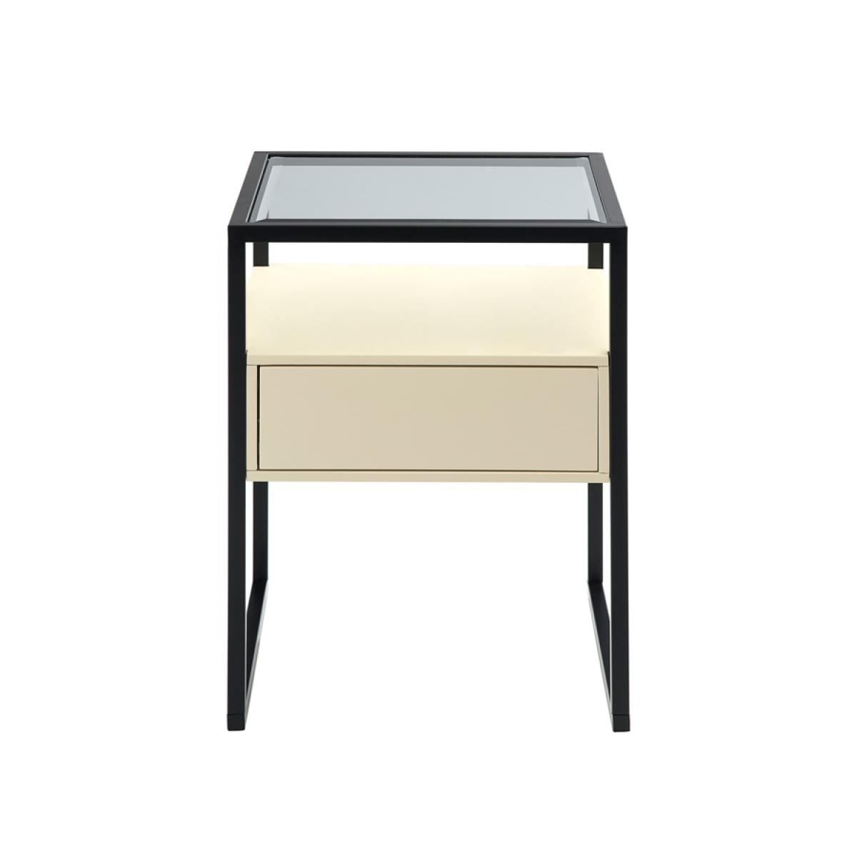 A smart, contemporary bedside table with a characterful contrast drawer section. Steel frame with black satin powder-coated finish. Wood-composite drawer section finished in a durable, taupe-coloured polyurethane paint. Push-catch drawer function. Grey tinted toughened glass top. Supplied fully assembled.