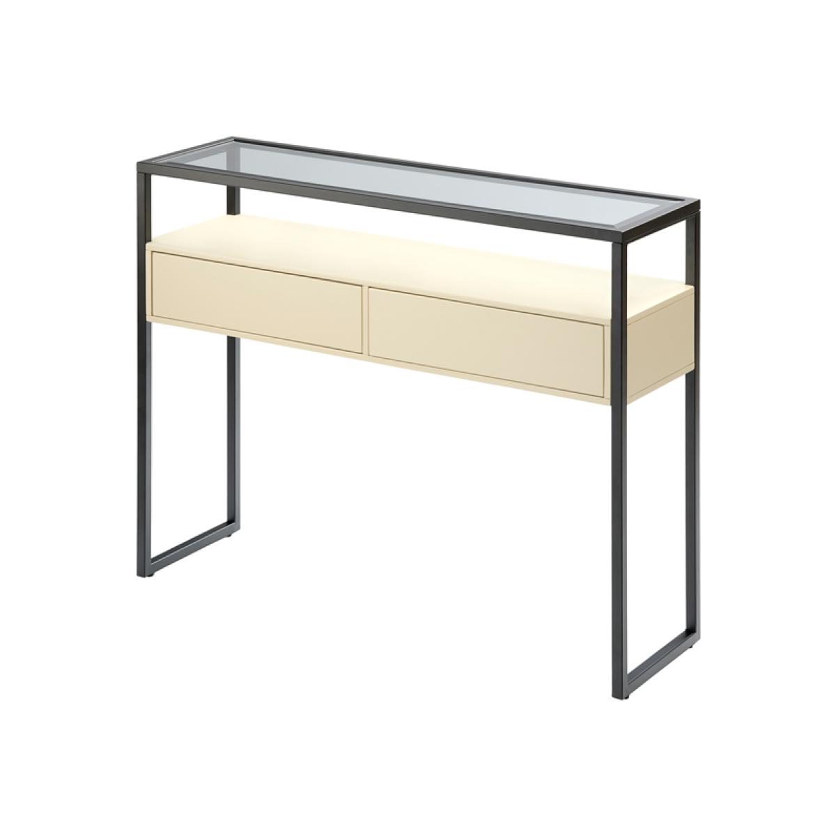 A smart, contemporary console table with a contrasting two-drawer section. Steel frame with black satin powder-coated finish. Wood-composite drawer section finished in a durable, taupe-coloured polyurethane paint. Push-catch drawer function. Grey tinted toughened glass top. Supplied fully assembled.