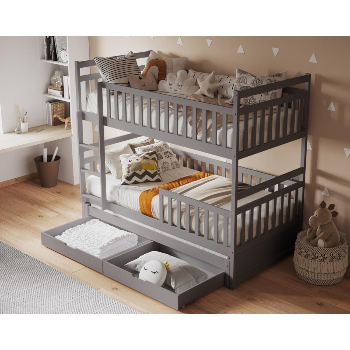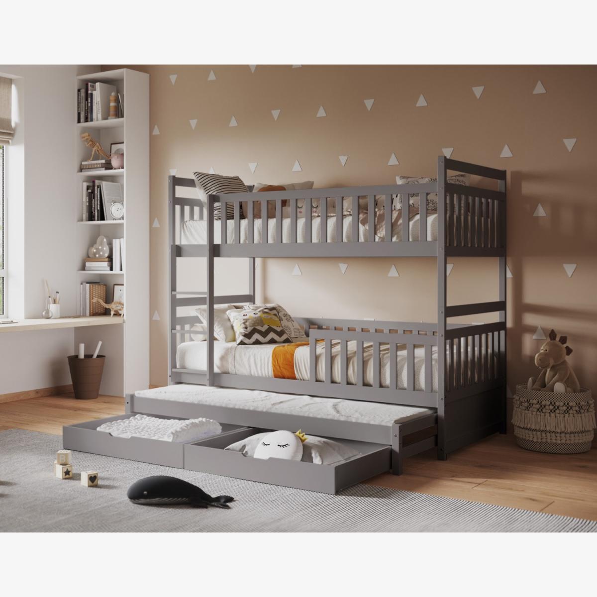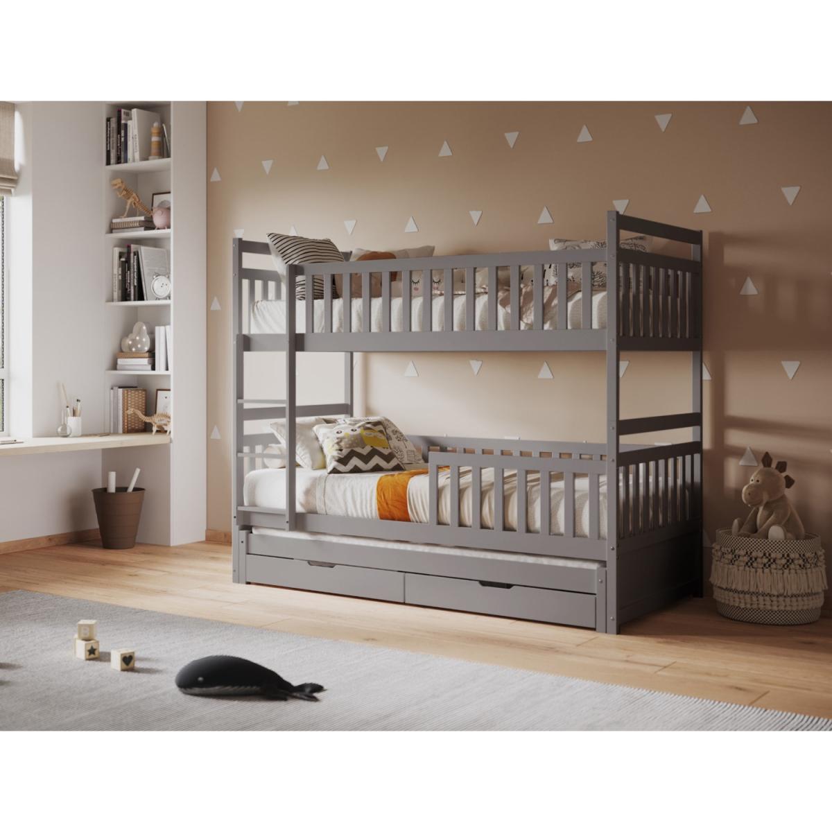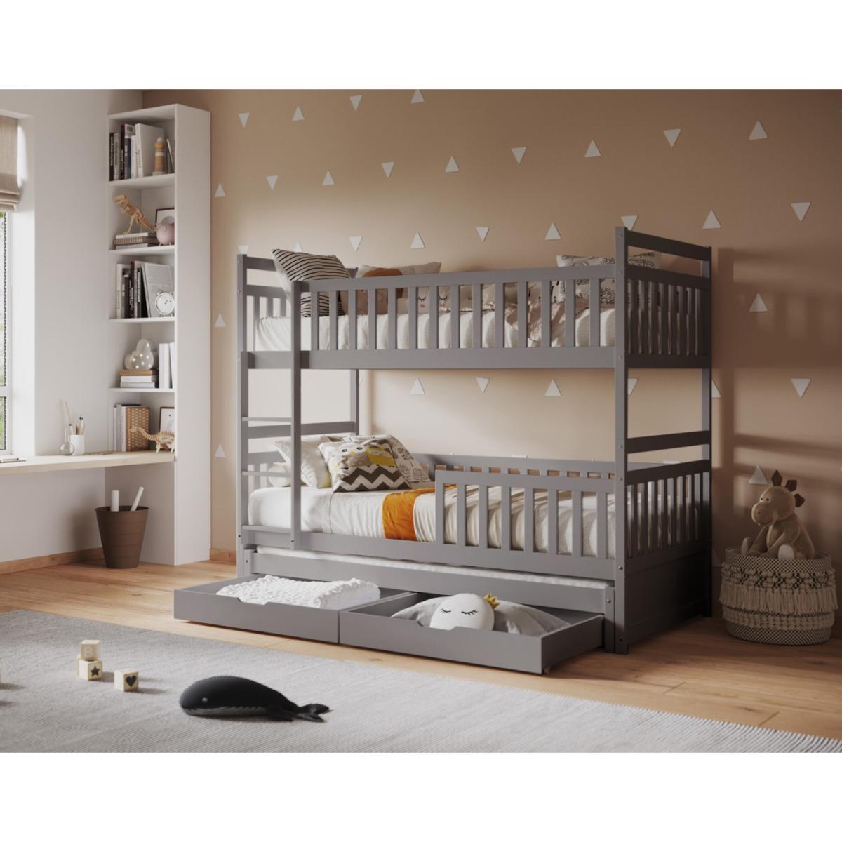 Upgrade your space with this sought-after classical bunk bed. Constructed with a pine wood material in a shaker-style design, characterised by simple and clean lines. The headboard has a classic, timeless look and provides additional comfort and support when sitting up in bed. The bunk bed features a trundle, which is an extra pull-out bed beneath the main bed, and pull-out drawers, providing extra storage space for bed linens, clothing, or other items. With this type of bunk bed, it is the ideal choice for small spaces or for those who want to maximise their sleeping and storage solutions. The sturdy construction of this bunk bed makes it a durable and long-lasting investment for your home and is designed with safety in mind, featuring guardrails and a sturdy ladder for easy access to the top bunk. Finished in a solid easy-to-clean grey or white finish and completed with a dual trundle and drawer pullout mechanism, the Elvis is sure to fit perfectly within any child's bedroom setting. The Elvis Bunk Bed requires 2 continental Single (90x200cm) mattresses for the top bunk and bottom bunk, and for the trundle bed, a standard single (90x190cm) mattress is required. For safety reasons, we recommended the bed mattresses should not exceed 16cm in depth and the trundle mattress should not exceed 5cm in depth.