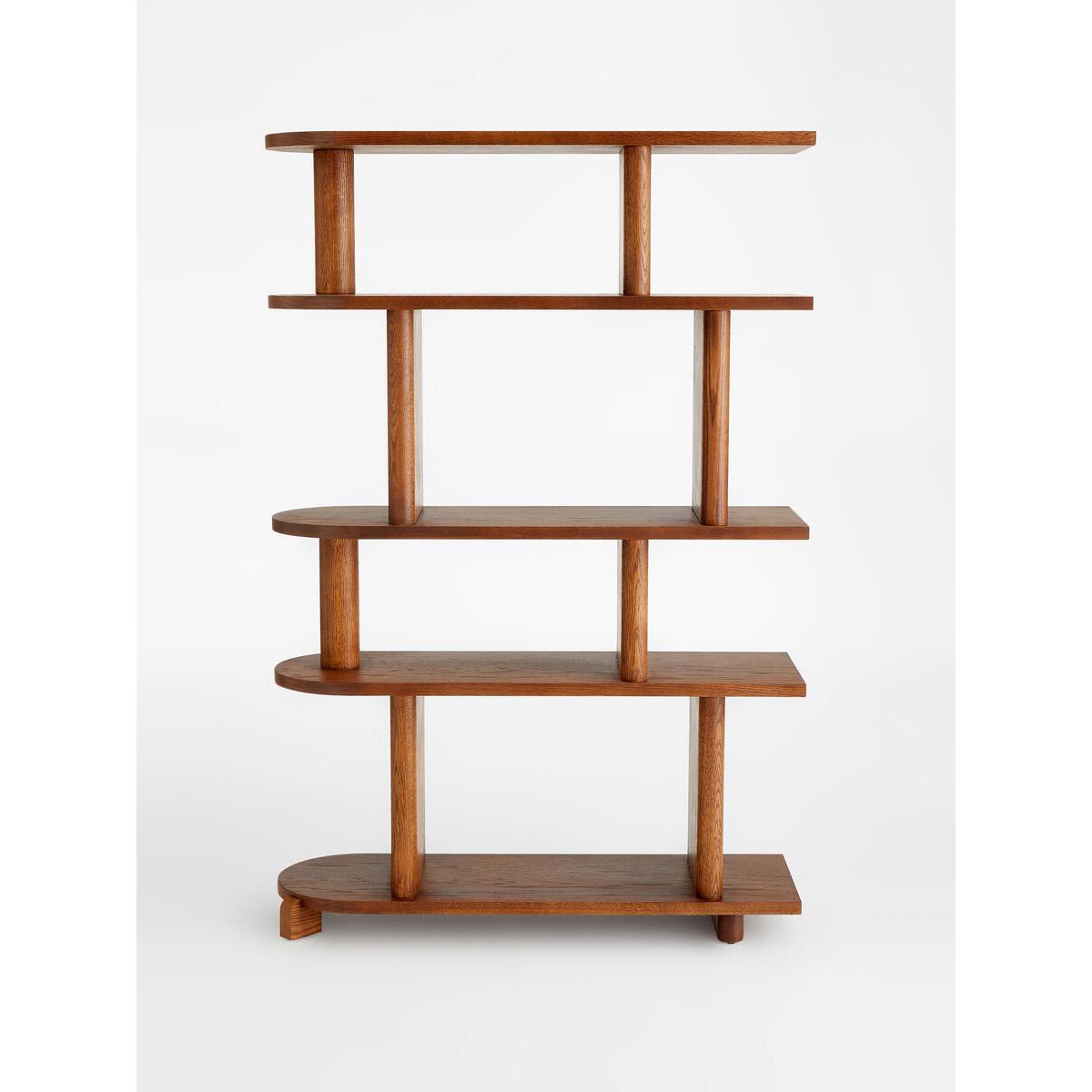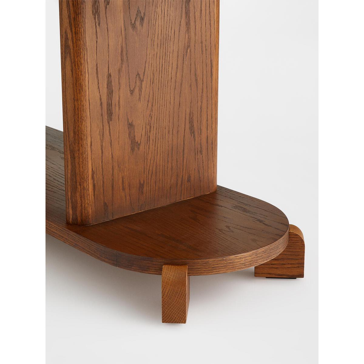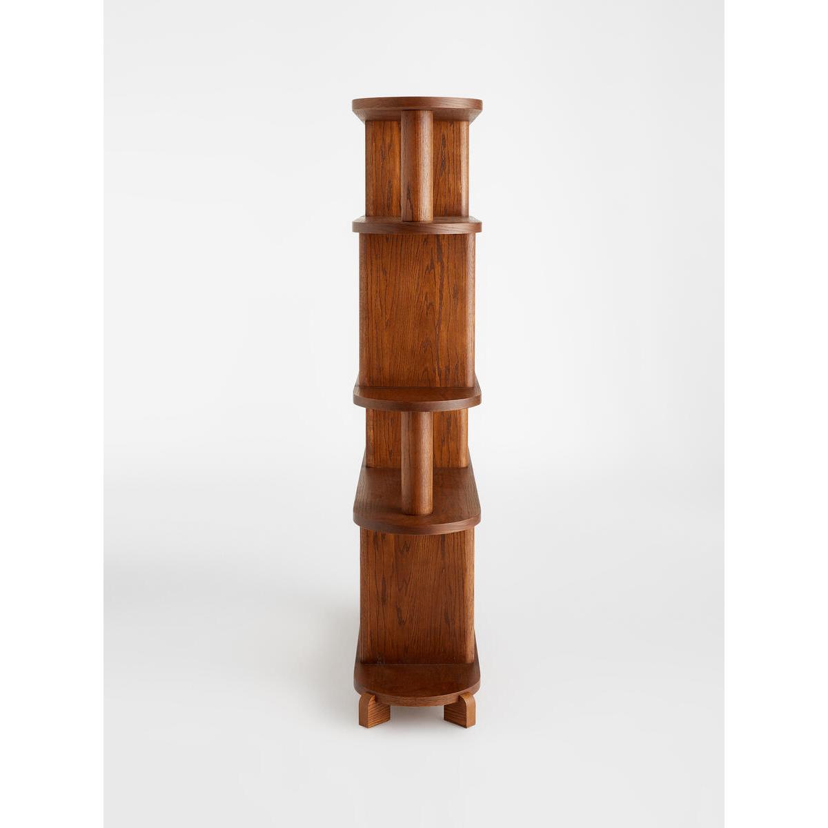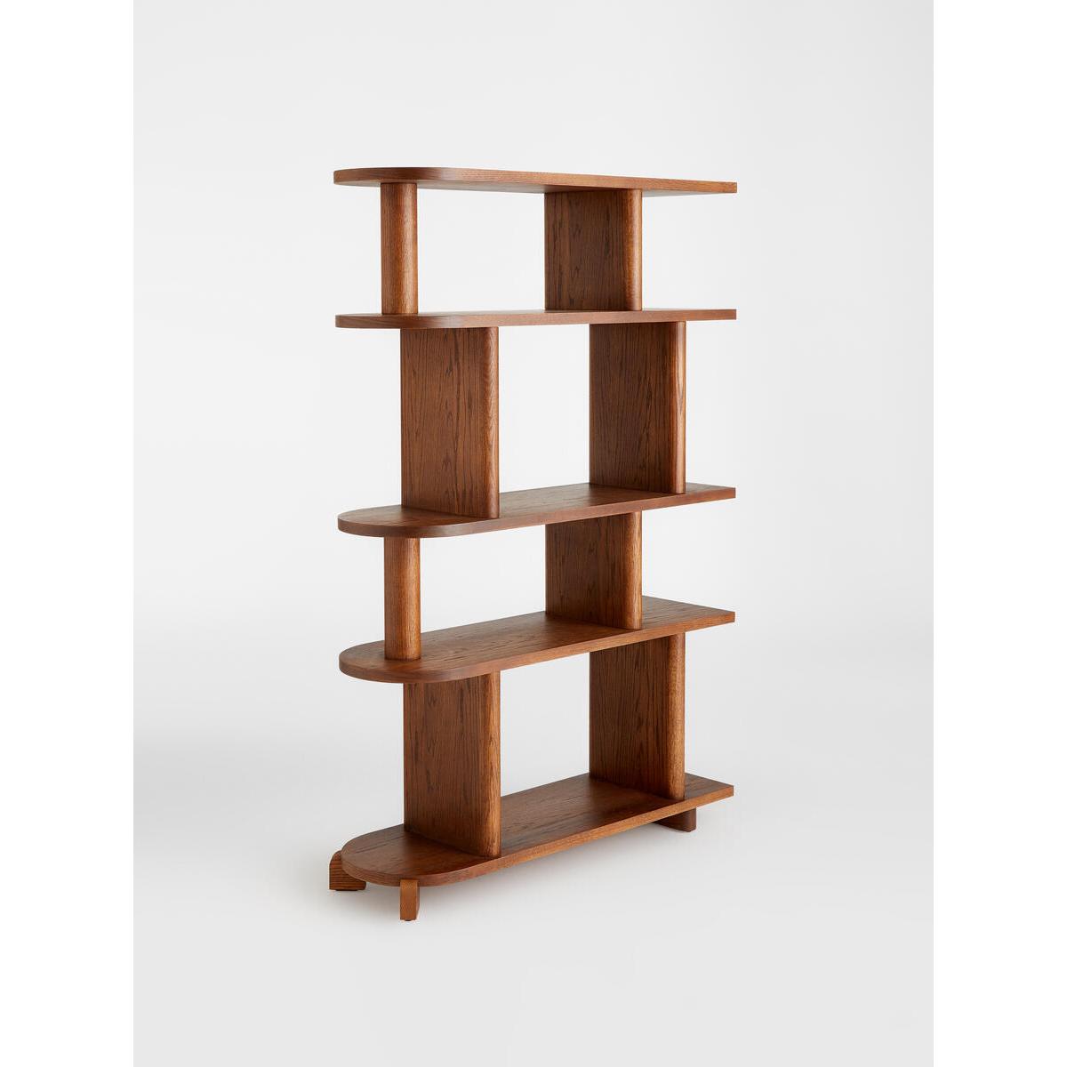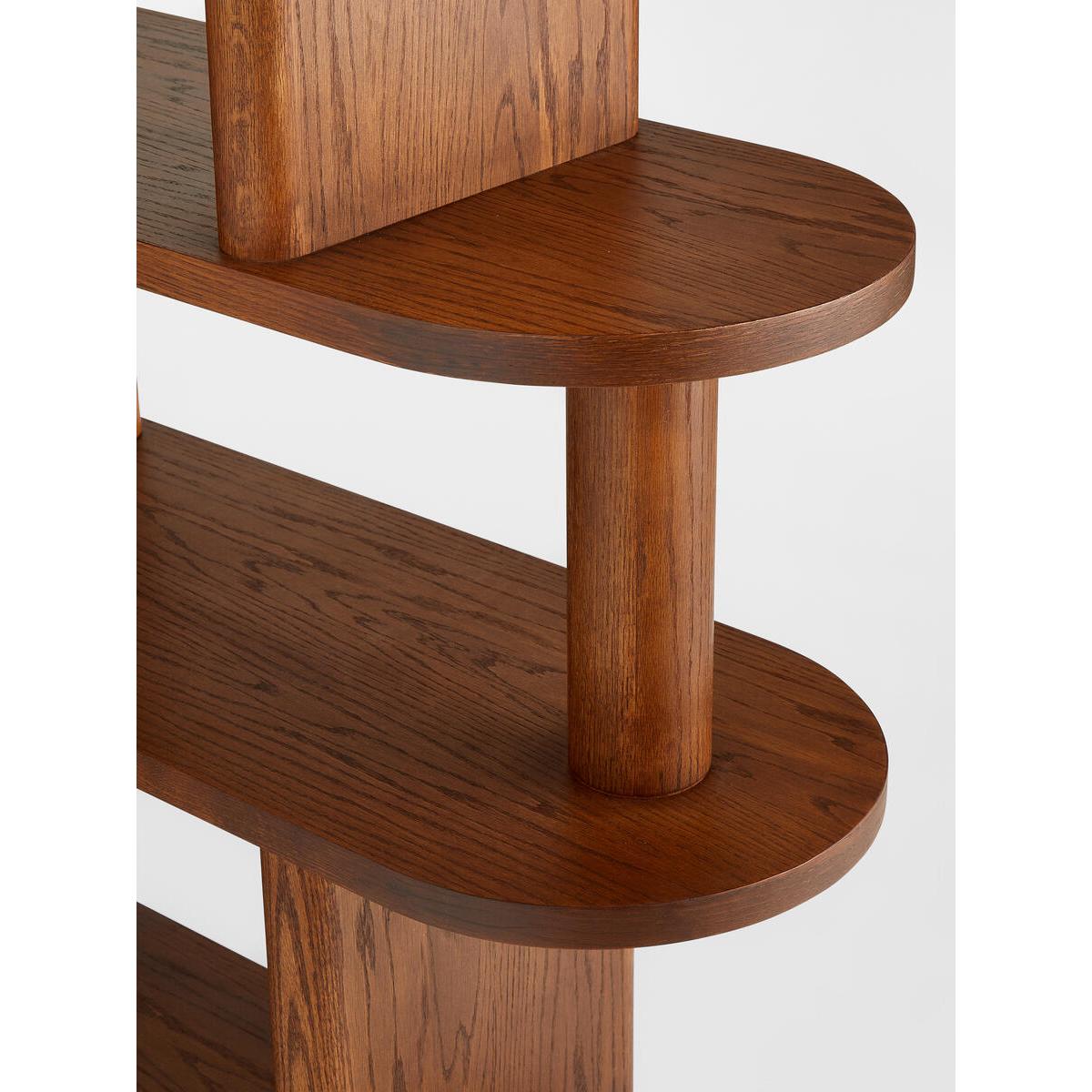 Inspired by the furniture seen at 180 House, our Elwoodfree-standing oak shelving unit can stand alone to form a statementwall, or be paired with another unit to create a room partition. The varied heights allow room for both large and small-scale items,including books, candles, and glazed ceramic decor. Free-standing oak shelving unit. Varied heights. Rounded edges. Pair two together to create a room divide. Can be used to create a statement wall. Inspired by 180 House.