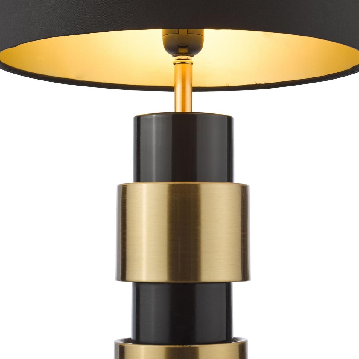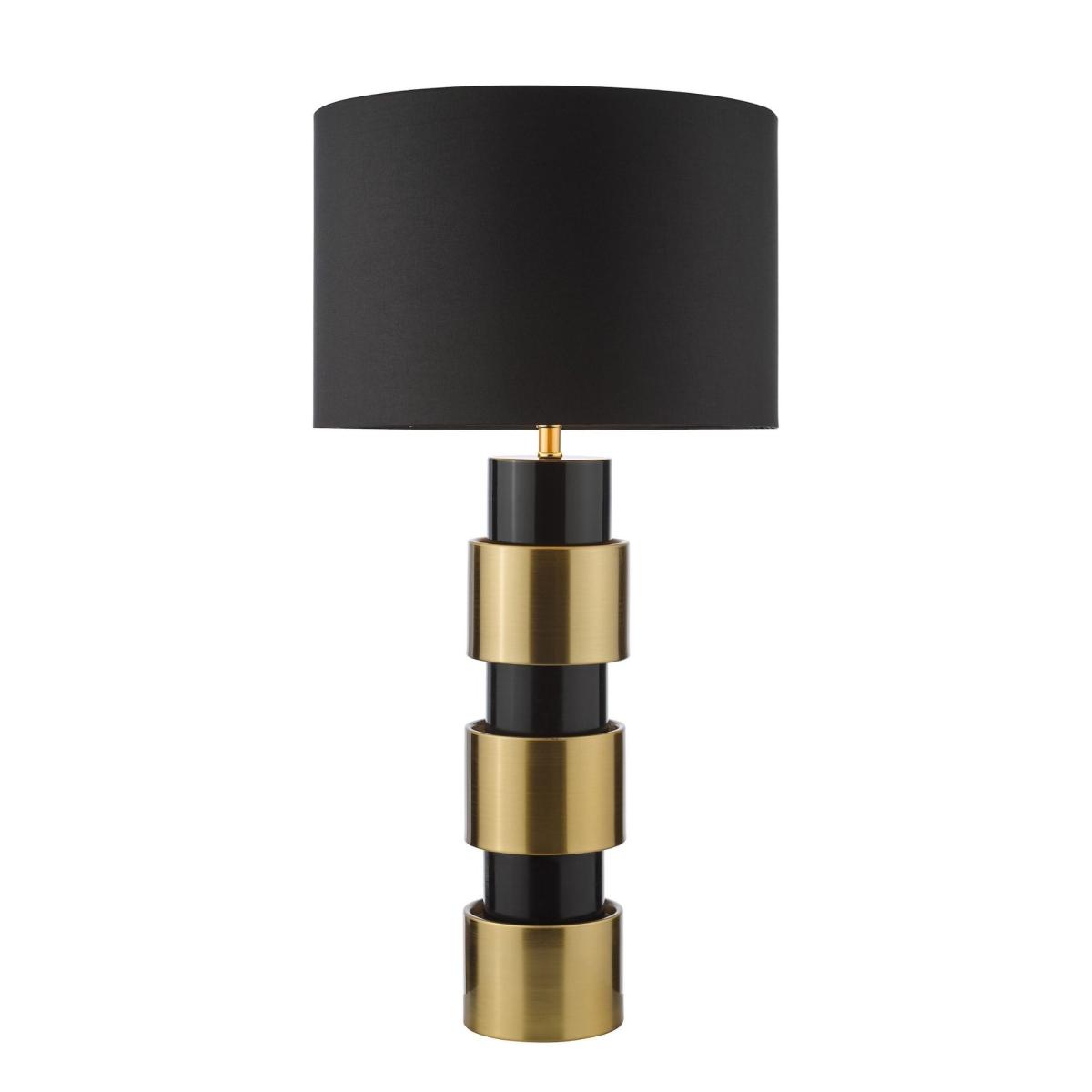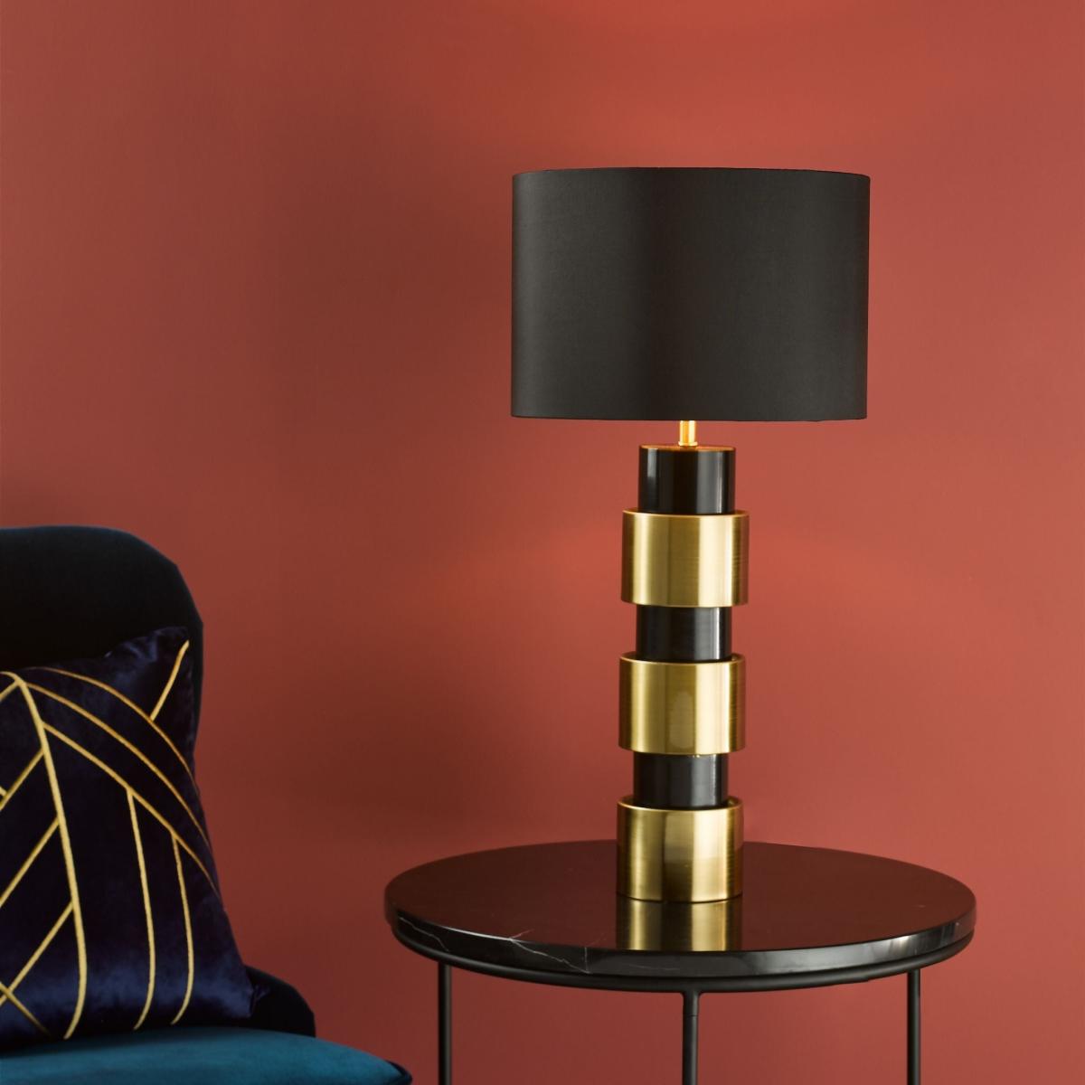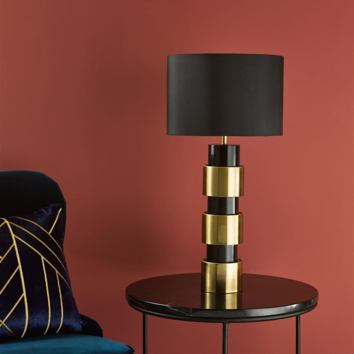 Elwyn 1-light table lamp, featuring a design of stacked satin gold rings and black cylinders and paired with a black faux silk drum shade. The Elwyn table lamp combines modern elegance with bold design, featuring an captivating arrangement of stacked satin gold rings and black cylinders that create a striking visual contrast. This unique design offers a sophisticated and contemporary touch to any room. Paired with a sleek black faux silk drum shade, the lamp casts a warm, soft glow, perfect for adding ambiance to living rooms, bedrooms or entryways. The Elwyn table lamp’s blend of gold and black finishes makes it a versatile statement piece that elevates your decor with its stylish and refined aesthetic. Elwyn 1-light table lamp, featuring a design of stacked satin gold rings and black cylinders and paired with a black faux silk drum shade. The Elwyn table lamp combines modern elegance with bold design, featuring an captivating arrangement of stacked satin gold rings and black cylinders that create a striking visual contrast. This unique design offers a sophisticated and contemporary touch to any room. Paired with a sleek black faux silk drum shade, the lamp casts a warm, soft glow, perfect for adding ambiance to living rooms, bedrooms or entryways. The Elwyn table lamp’s blend of gold and black finishes makes it a versatile statement piece that elevates your decor with its stylish and refined aesthetic.