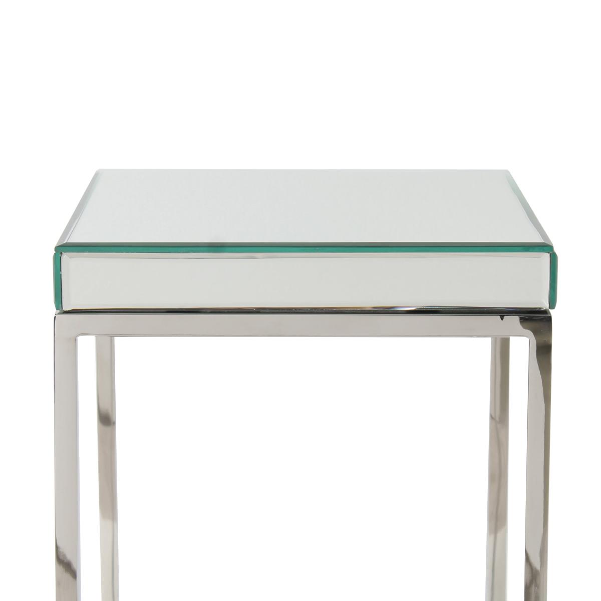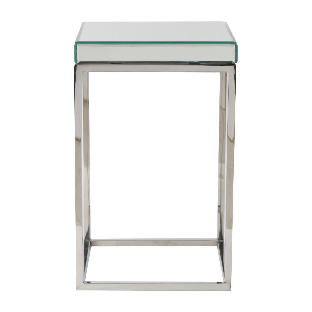 * Mirrored surface* Bevel edged* Stainless steel frame* Hand crafted This side table was crafted in India, and is a perfect blend of elegance and functionality. Its bevel-edged mirrored surface and shiny silver metal frame create a luxurious look, while its compact size makes it ideal for any room. Whether used as a bedside table or an accent piece in your living room, it adds a touch of glamour and sophistication to your space.