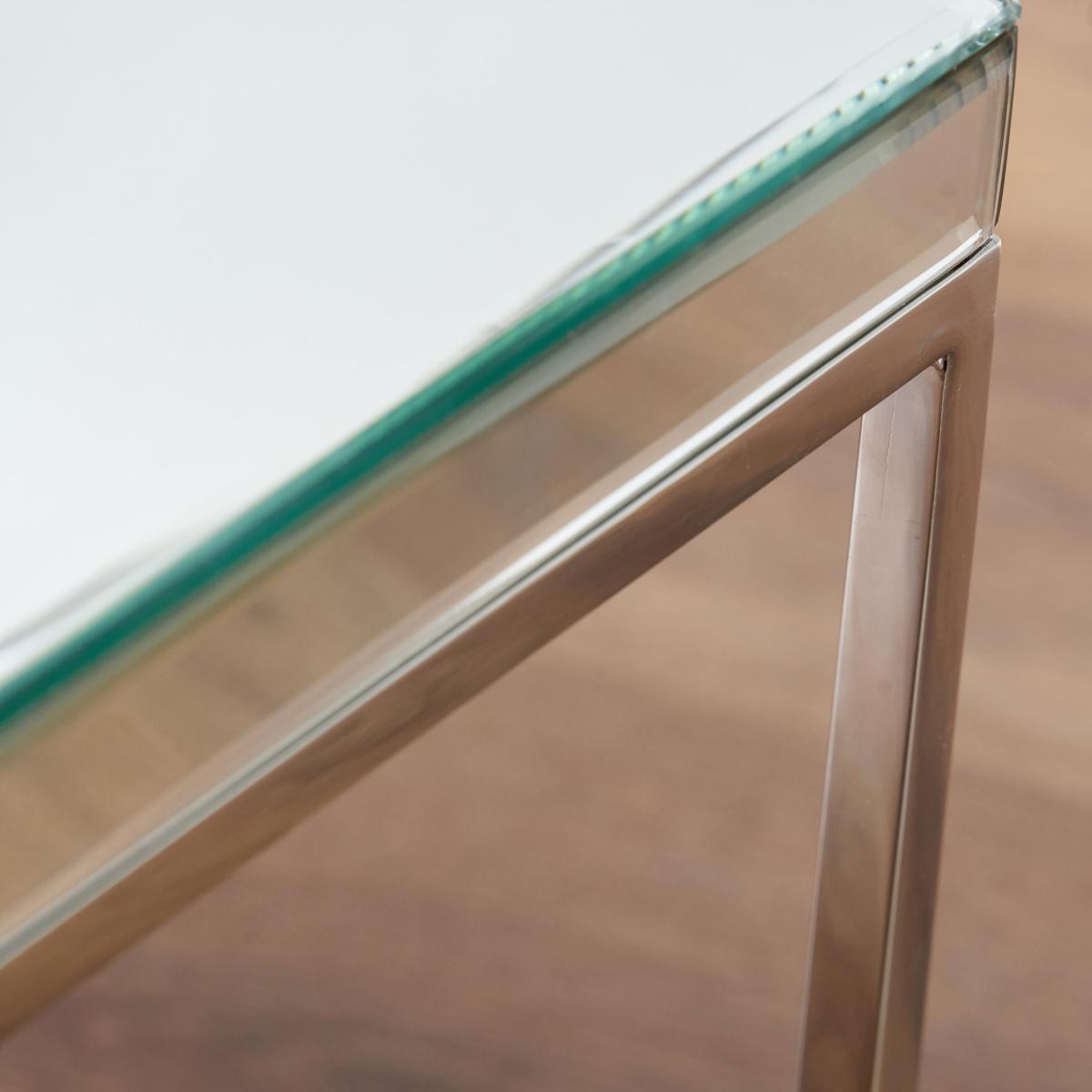 * Mirrored surface* Bevel edged* Stainless steel frame* Hand crafted This coffee table is a glamorous addition to any living room. Its mirrored surface with bevel edge details reflects light beautifully, adding a sense of space and brightness. The slim, shiny silver metal frame provides a sleek and modern foundation, making this coffee table not only a functional piece but also a statement of elegance and style.