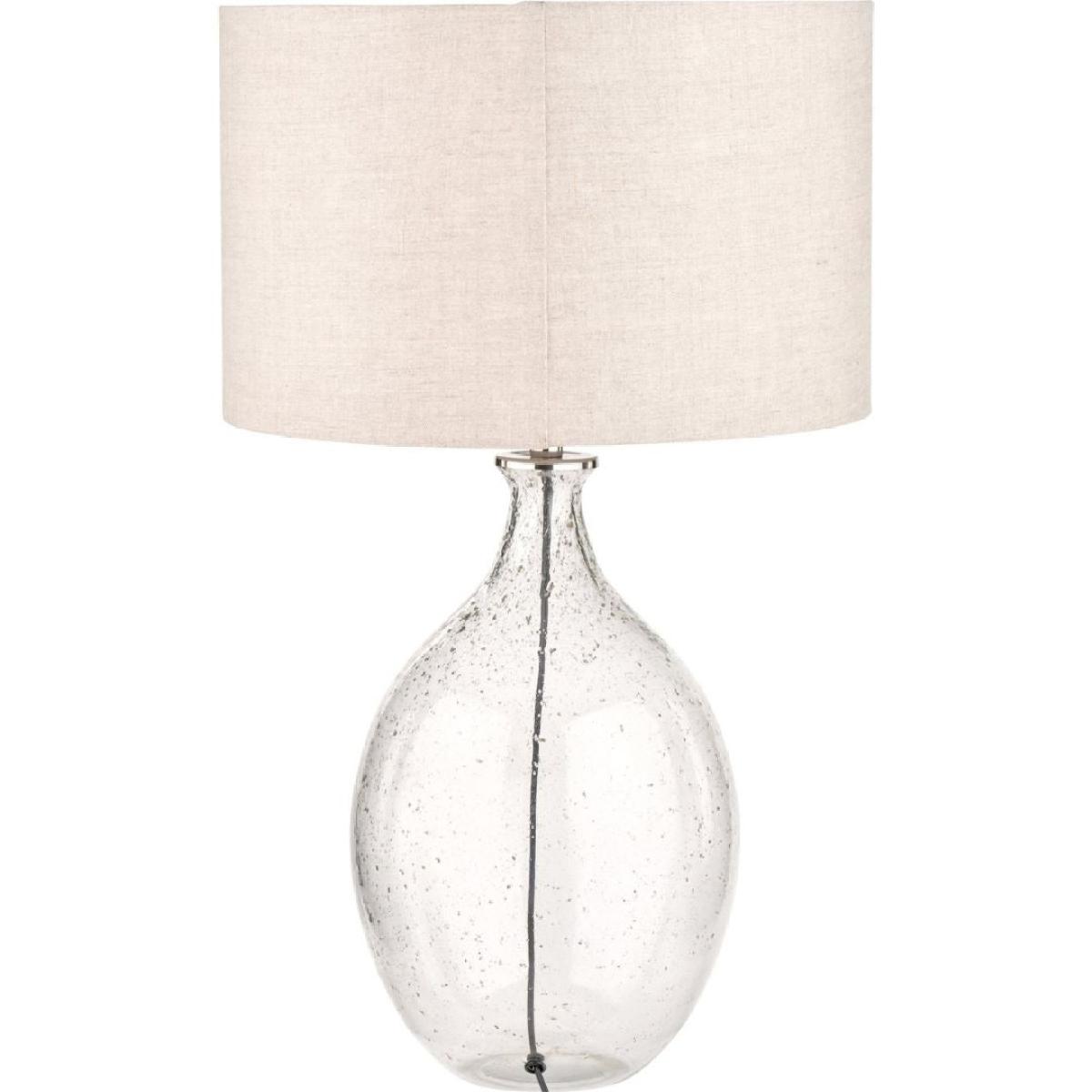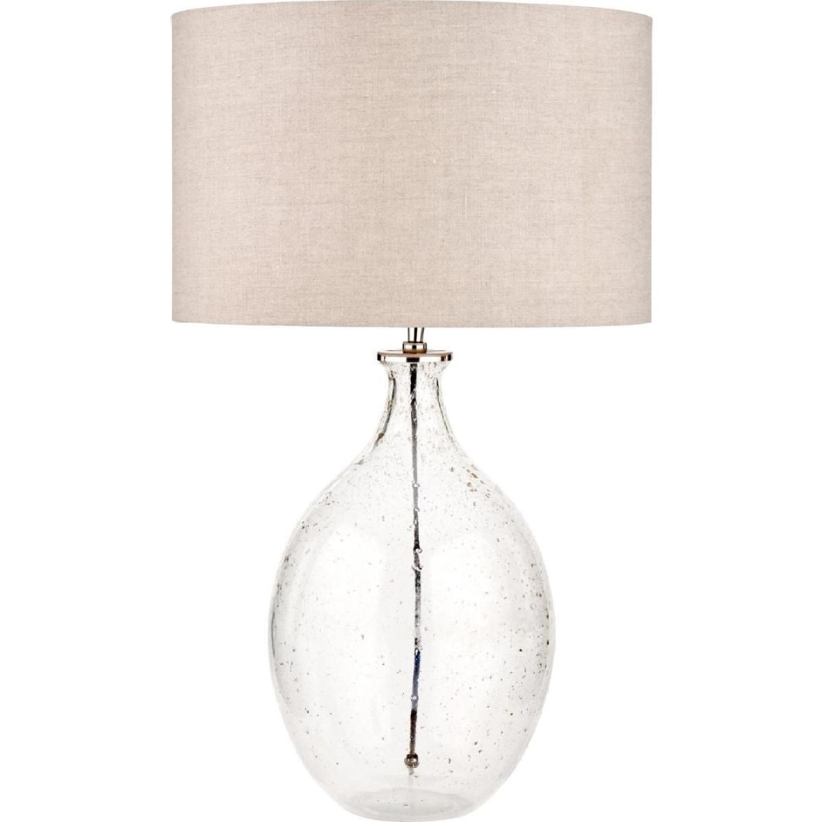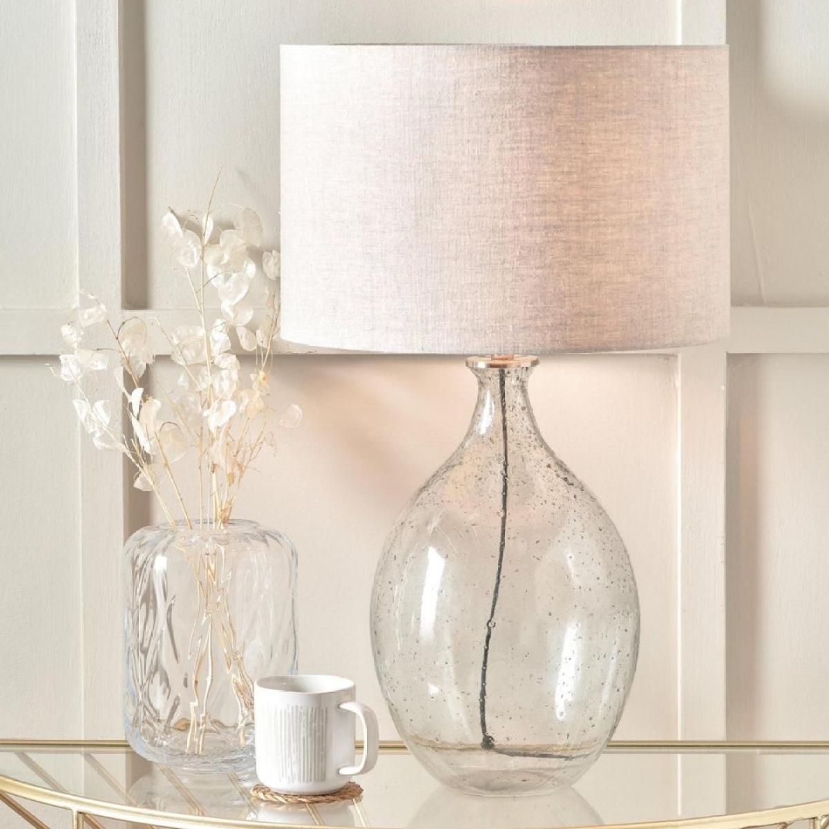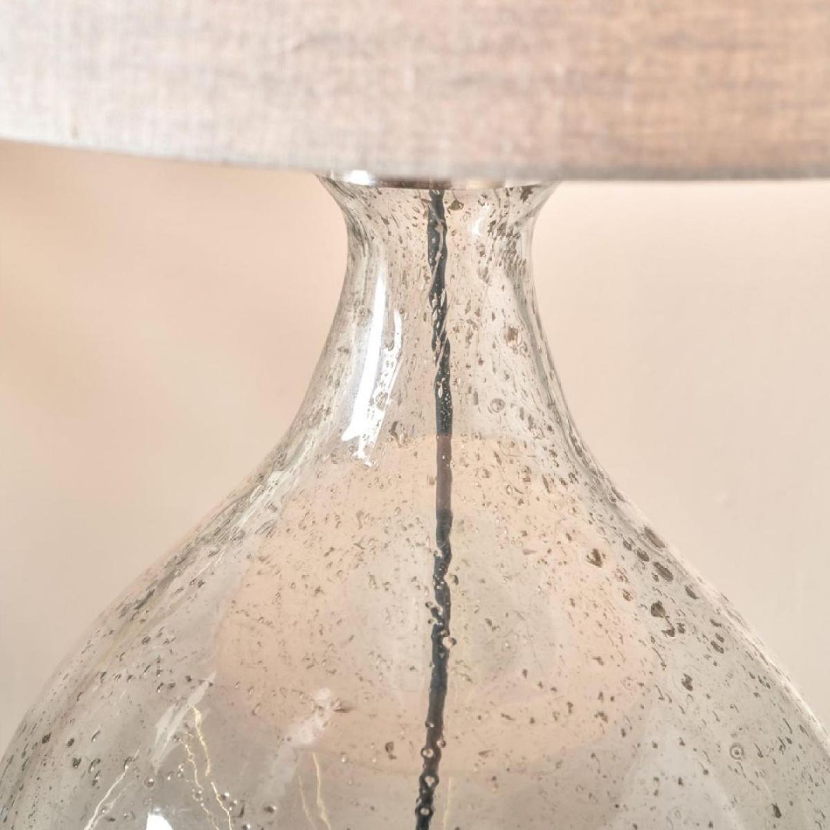 Elysia 1-light glass table lamp, featuring a curved base with a bubble texture and topped with a natural-coloured linen drum shade. The Elysia glass table offers a blend of elegance and texture, making it a striking addition to any space. Its curved glass base features a unique bubble texture, adding visual depth and an artisanal touch to the lamp’s sleek silhouette. The transparent design allows light to play off the textured surface, creating a subtle yet captivating effect. Topped with a natural-coloured linen drum shade, the Elysia table lamp provides a warm, inviting glow that complements its refined design. The neutral shade balances the lamp’s intricate base, making it versatile for a variety of decor styles, from modern to coastal. Perfect for living rooms, bedrooms or entryways, this lamp adds both sophistication and a touch of whimsy to your space. Elysia 1-light glass table lamp, featuring a curved base with a bubble texture and topped with a natural-coloured linen drum shade. The Elysia glass table offers a blend of elegance and texture, making it a striking addition to any space. Its curved glass base features a unique bubble texture, adding visual depth and an artisanal touch to the lamp’s sleek silhouette. The transparent design allows light to play off the textured surface, creating a subtle yet captivating effect. Topped with a natural-coloured linen drum shade, the Elysia table lamp provides a warm, inviting glow that complements its refined design. The neutral shade balances the lamp’s intricate base, making it versatile for a variety of decor styles, from modern to coastal. Perfect for living rooms, bedrooms or entryways, this lamp adds both sophistication and a touch of whimsy to your space.