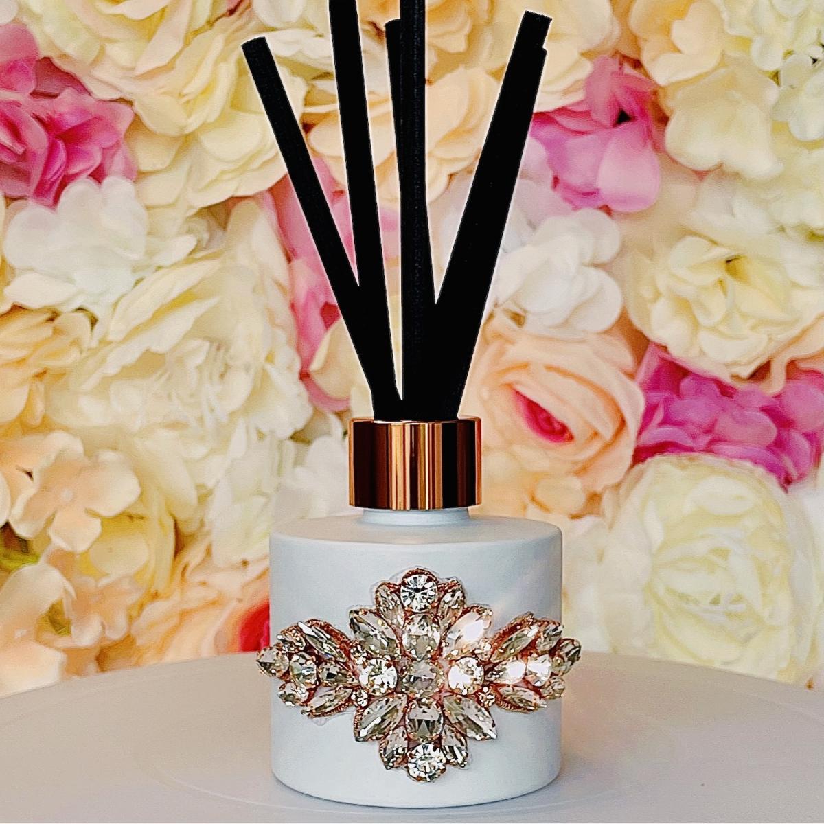 Soft & powdery scent reminiscent of babies powder. Our rose gold luxury reed diffusers are 100ml, come in a round white bottle with silver cap, 5 ultra-thick reeds 6mm wide x 175mm long, beautiful silver crystal embellishment and packaged in luxury gift box. We choose the strongest of fragrances for our diffusers for the best possible scent throw. A perfect way to continuously fragrance your home without having to keep an eye on any naked flames. Diffusers constantly disperse fragrance however you will find at times the fragrance appear stronger and more subtle throughout the day.
