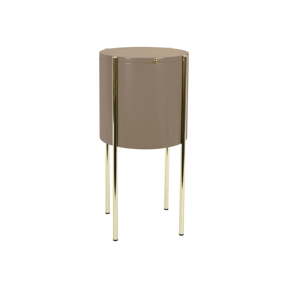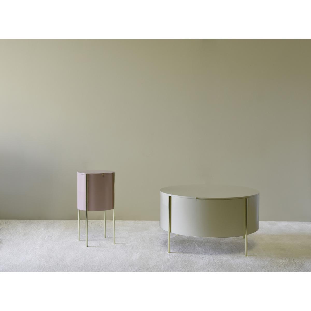 A luxurious, refined style for this small table which displays a vintage look inspired by furniture of the 70s. Embore combines Parisian style sophistication and a practical outlook via its integrated storage space. The real centre of attention, the Embore small table fascinates you with its perfect proportions and the care taken over the details like the little round, golden handle. Made from lacquered MDF, this small table has been designed to fit into small spaces all the while offering a spacious storage rack located under the top. The four legs are fixed on the outer edge of the small table: this graphical sign affirms the identity of the collection and softens the outline. Like precious jewels, the golden metal legs decorate the minimalist structure elegantly. At once a bedside table, a side table or quite simply an alcove console, it is the charming asset of any interior in search of personality.