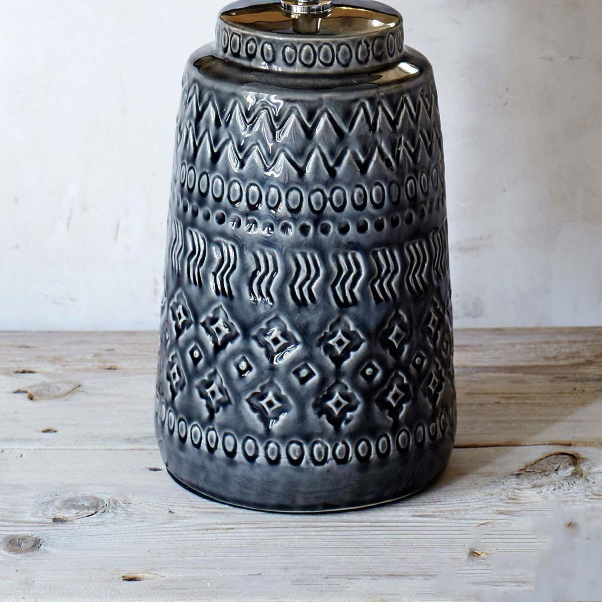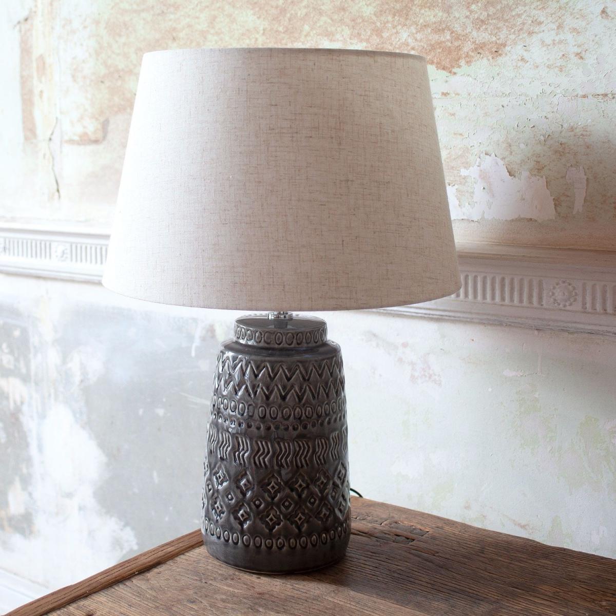 A retro inspired grey ceramic lamp base with embossed details and a natural linen empire shade.