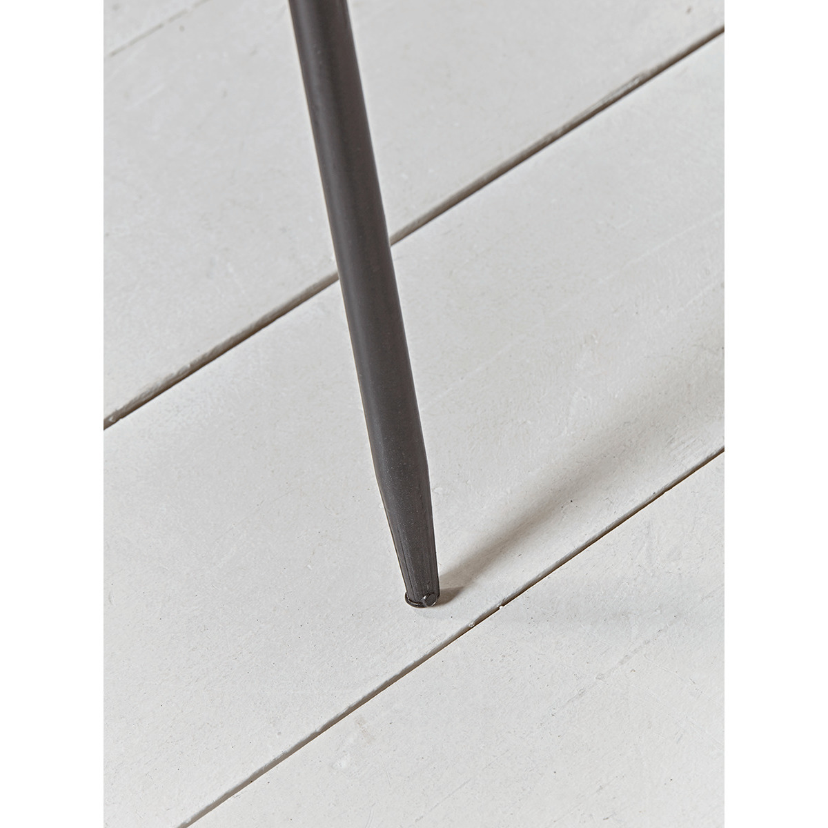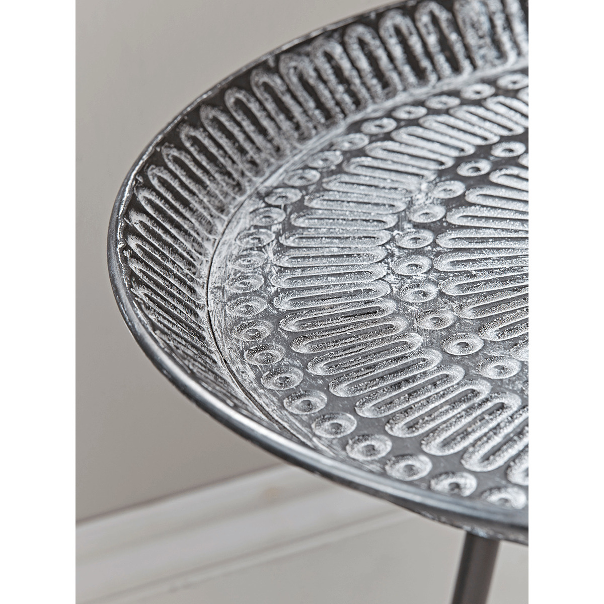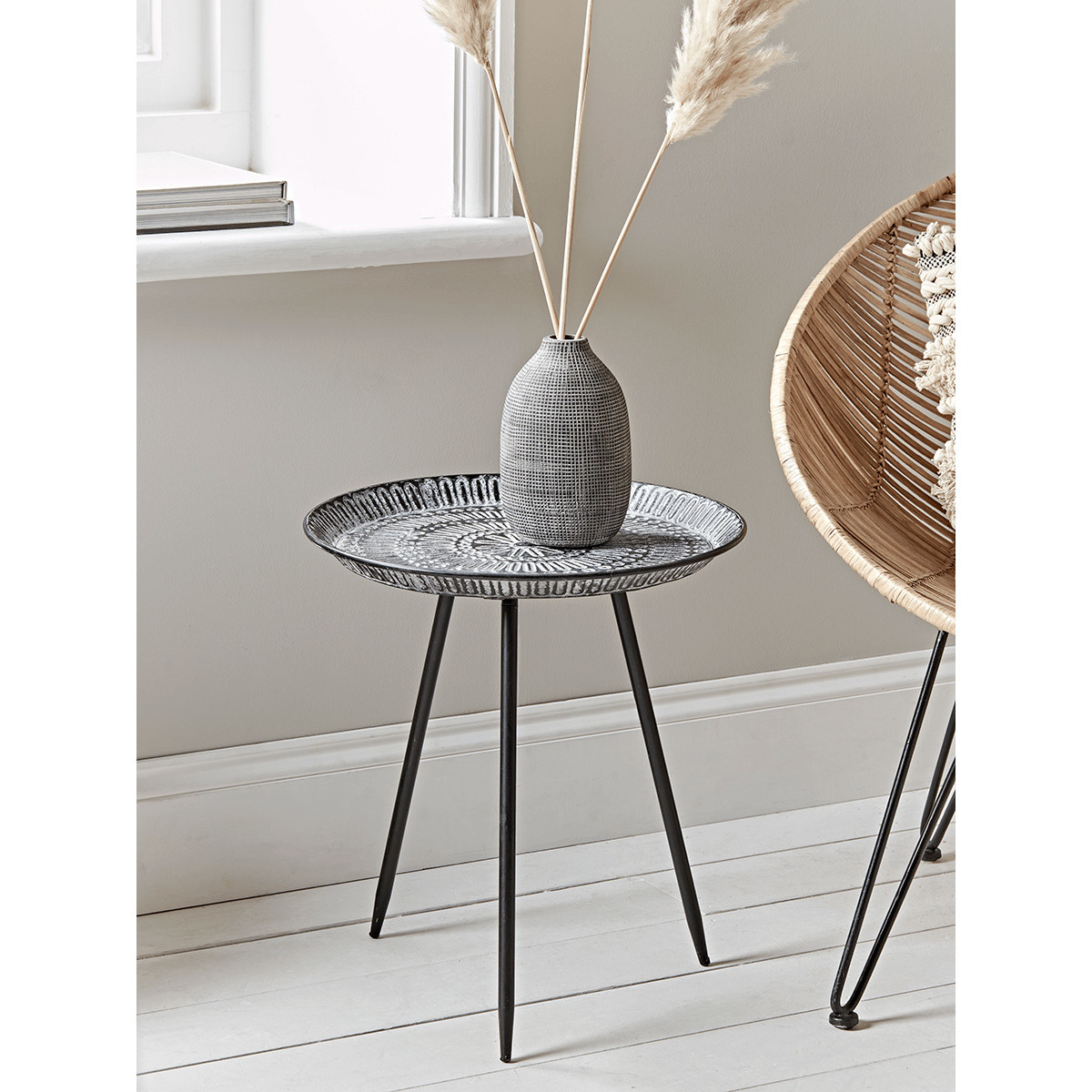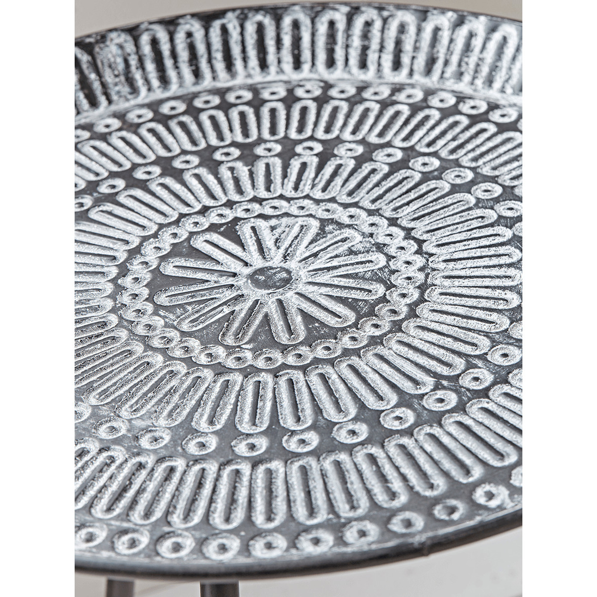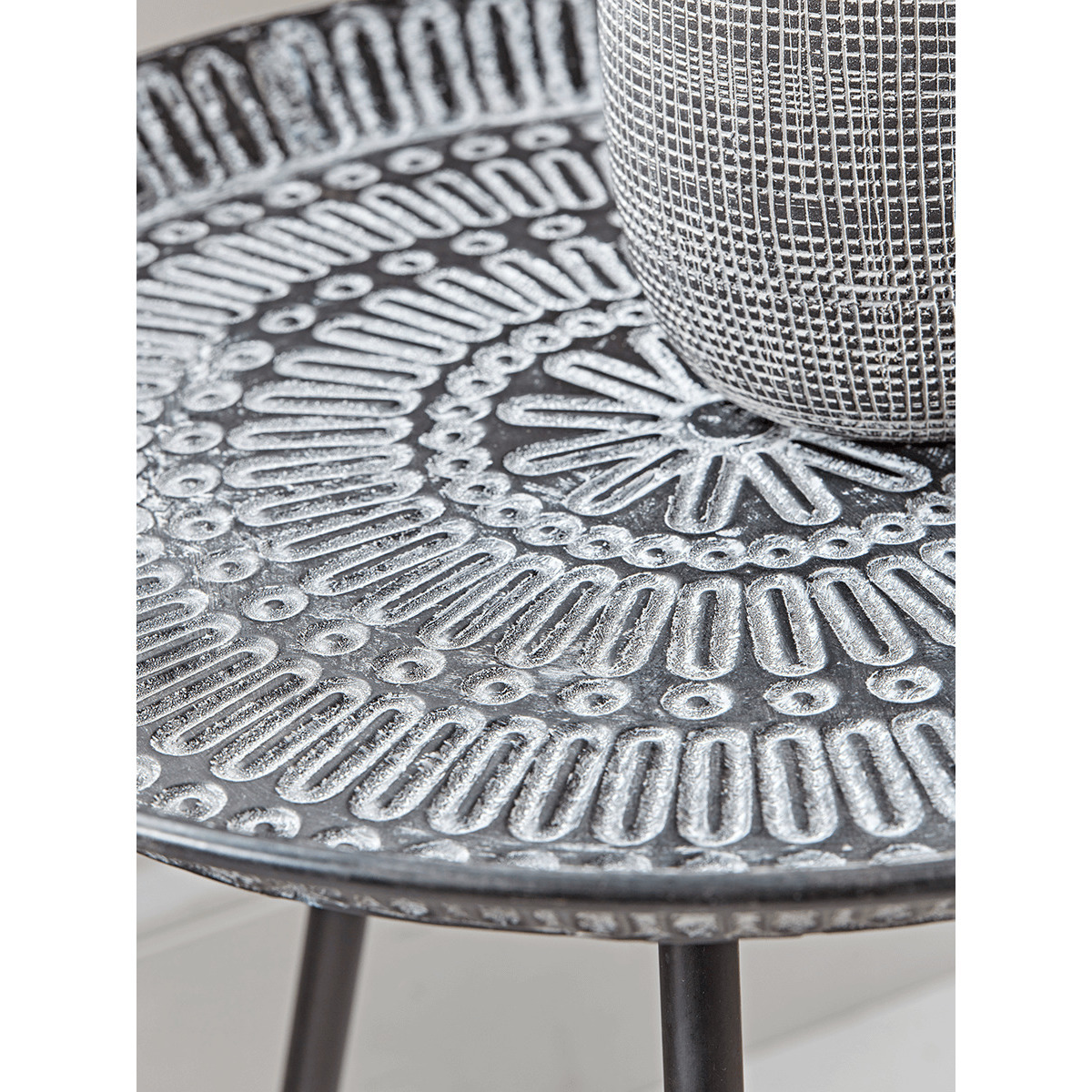 A great-looking occasional or serving table in black embossed metal. An original surface of an embossed geometric design highlighted with a white finish, both to the surface, and to the underneath of the rim really add to the impact of this smart piece. With three narrow stiletto legs here is a practical and stylish piece to complement most interior styles, but shown here styled perfectly with our