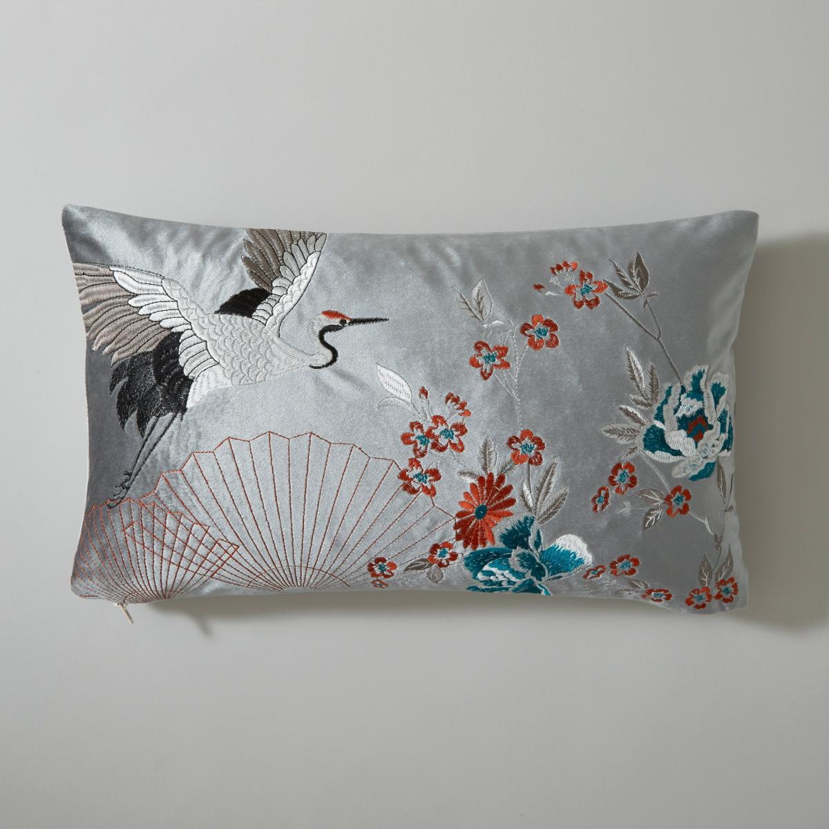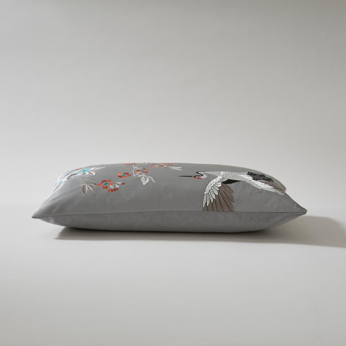 * Comfortable cushion* Add a pop of style to your space* Easy to clean Add some sophistication to your decor with our Embroidered Crane Cover in Silver. Made from recycled materials and featuring a soft velour feel, this cover is perfect for adding some subtle elegance to your space. And with its zip to secure the inserted filling and machine washable material, it's as practical as it is stylish.