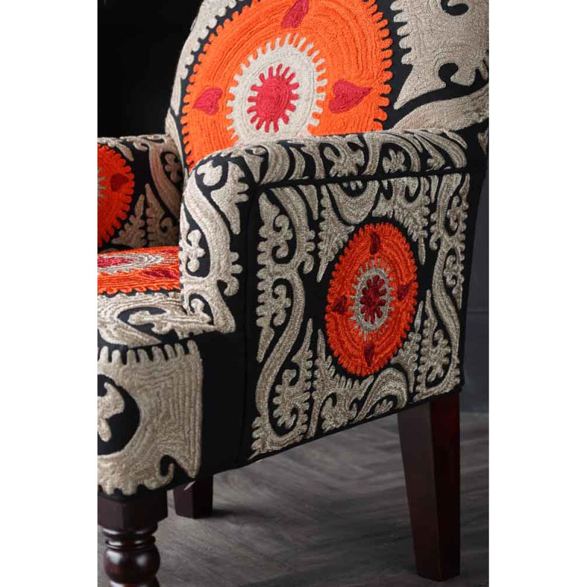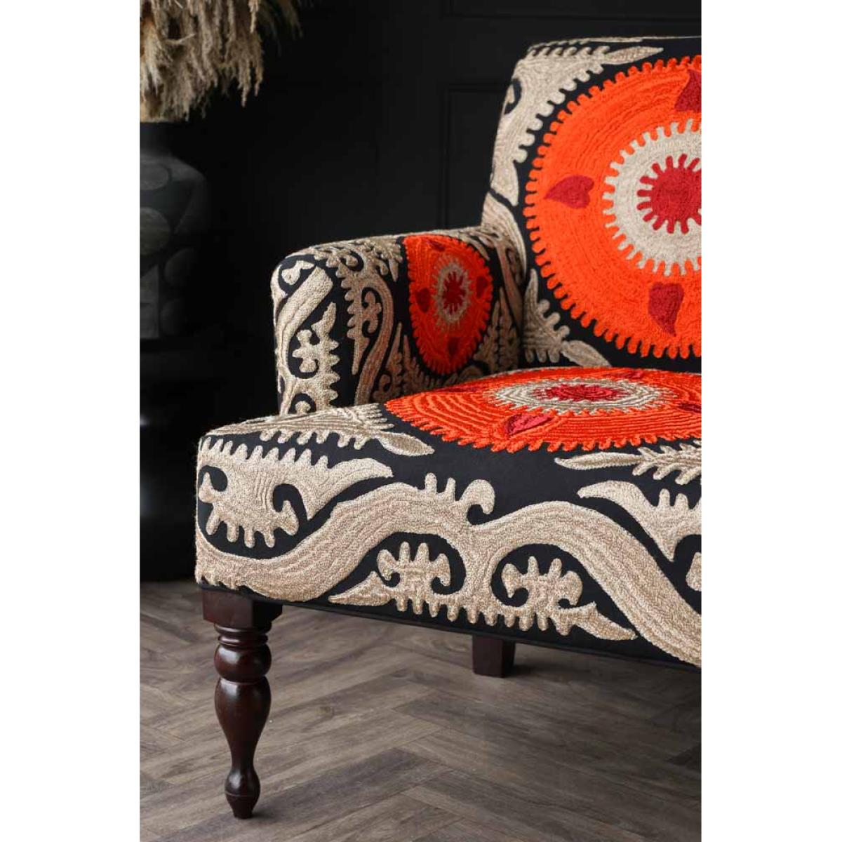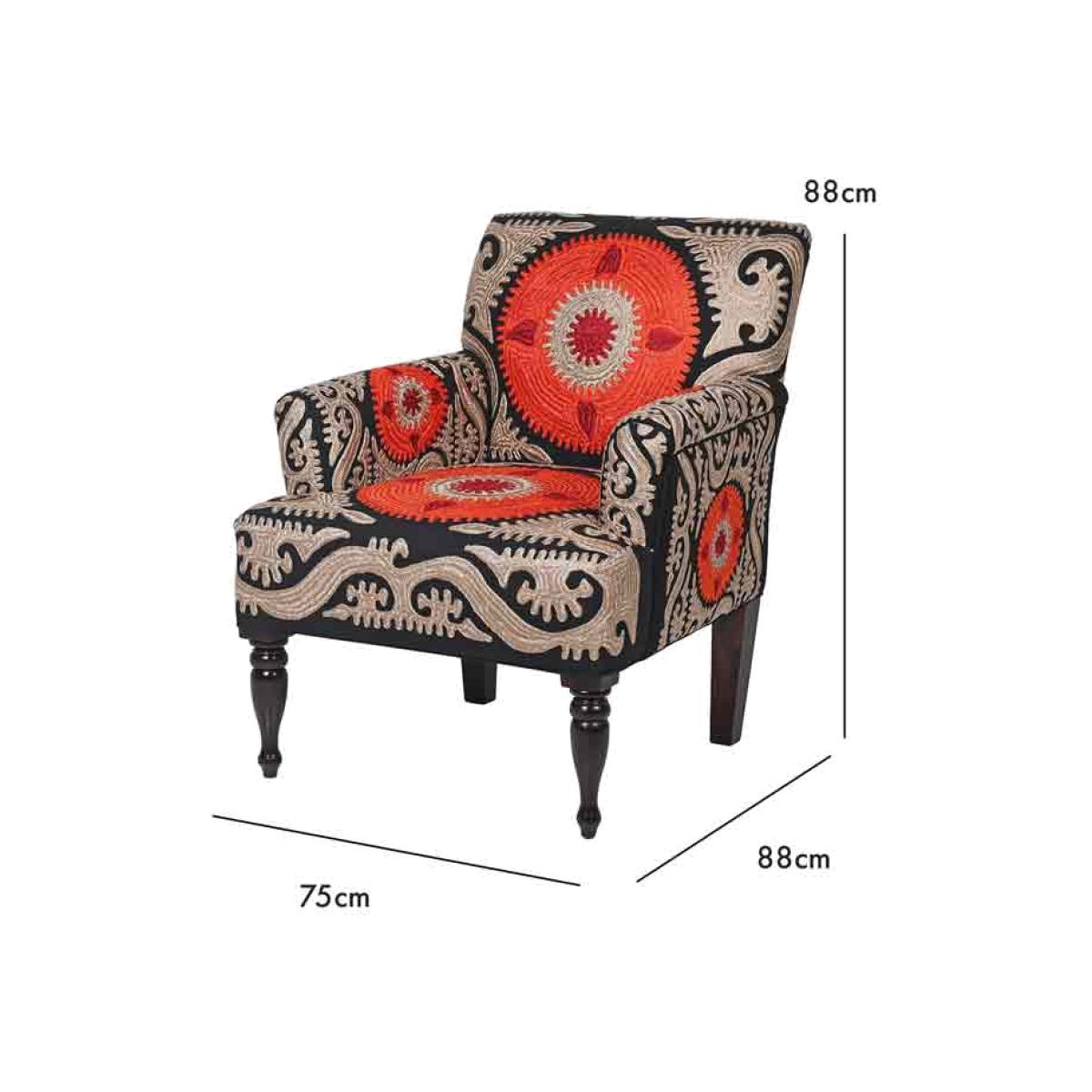 About The Embroidered Folk Pattern ArmchairThe Embroidered Folk Pattern Armchair is a dazzling showpiece to display in your home. Showcasing immense craftsmanship, this spacious armchair features an utterly beautiful handmade embroidered folk pattern in a vibrant orange, red and cream colourway with luxurious brown turned wood legs on the front and simple, straight legs on the back. Showcasing a stunning sheen to the embroidery with comfy foam cushions, this unique armchair is a marvellous occasional chair that’ll steal the show displayed in your living room, hallway or bedroom. This large armchair measures 88cm in height, 75cm in width and 88cm in depth. Why We Think You’ll Love The Folk Pattern Embroidered ArmchairExquisitely handcrafted, this colourful armchair will make an instant impact in your interior scheme. Offering a sumptuous texture and an eye-catching design, this living room armchair will provide the most comfortable spot to sit back and read a book. A true hero piece, we think this statement armchair is simply ravishing, so what’s not to love?!Where To Style The Embroidered Folk Pattern Large ArmchairThis stunning statement piece demands to be the focal point of any room its style in with its utterly unique design that’ll inject instant wow-factor wherever it's placed. With high arms made for added comfort, this cosy armchair is the perfect piece to relax in, so why not display it in your living room creating a stunning style spot that also doubles up as a marvellous talking point. Alternatively, display this comfy armchair in your bedroom for a tranquil serene vibe that showcases downright fashionable style sense.