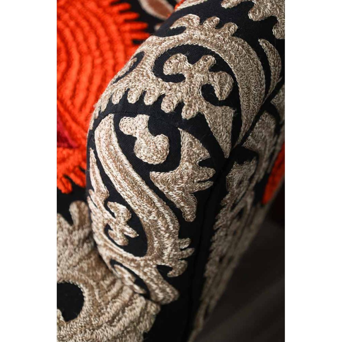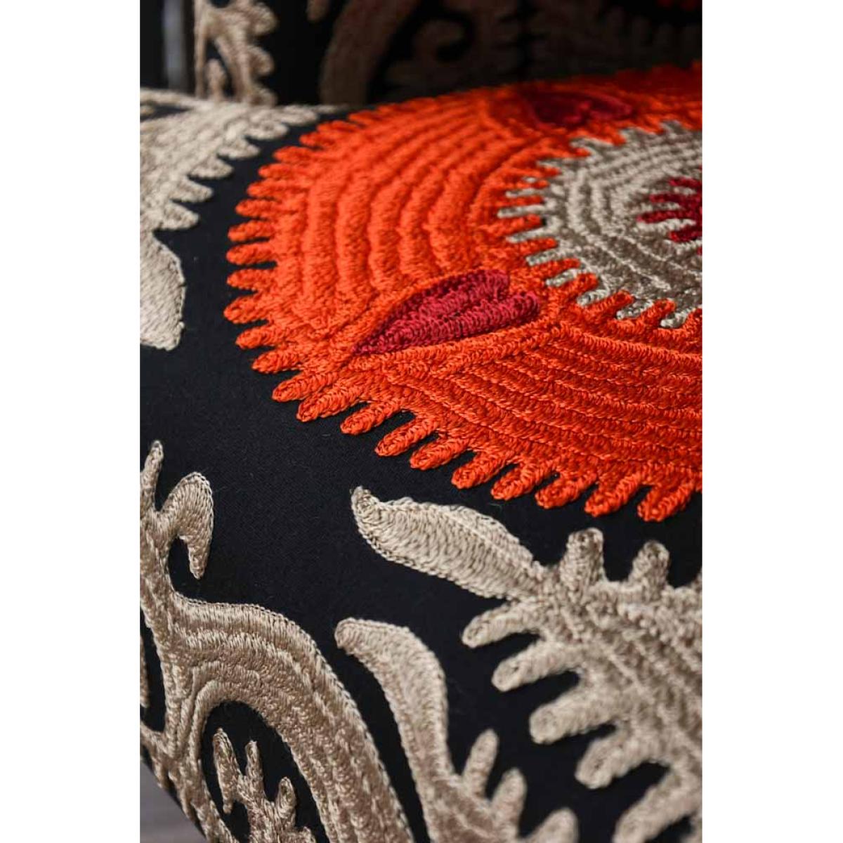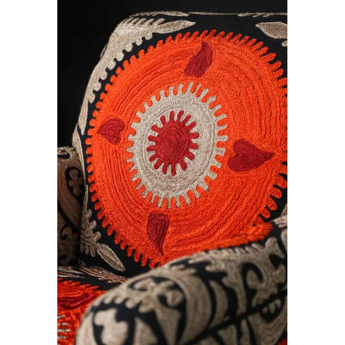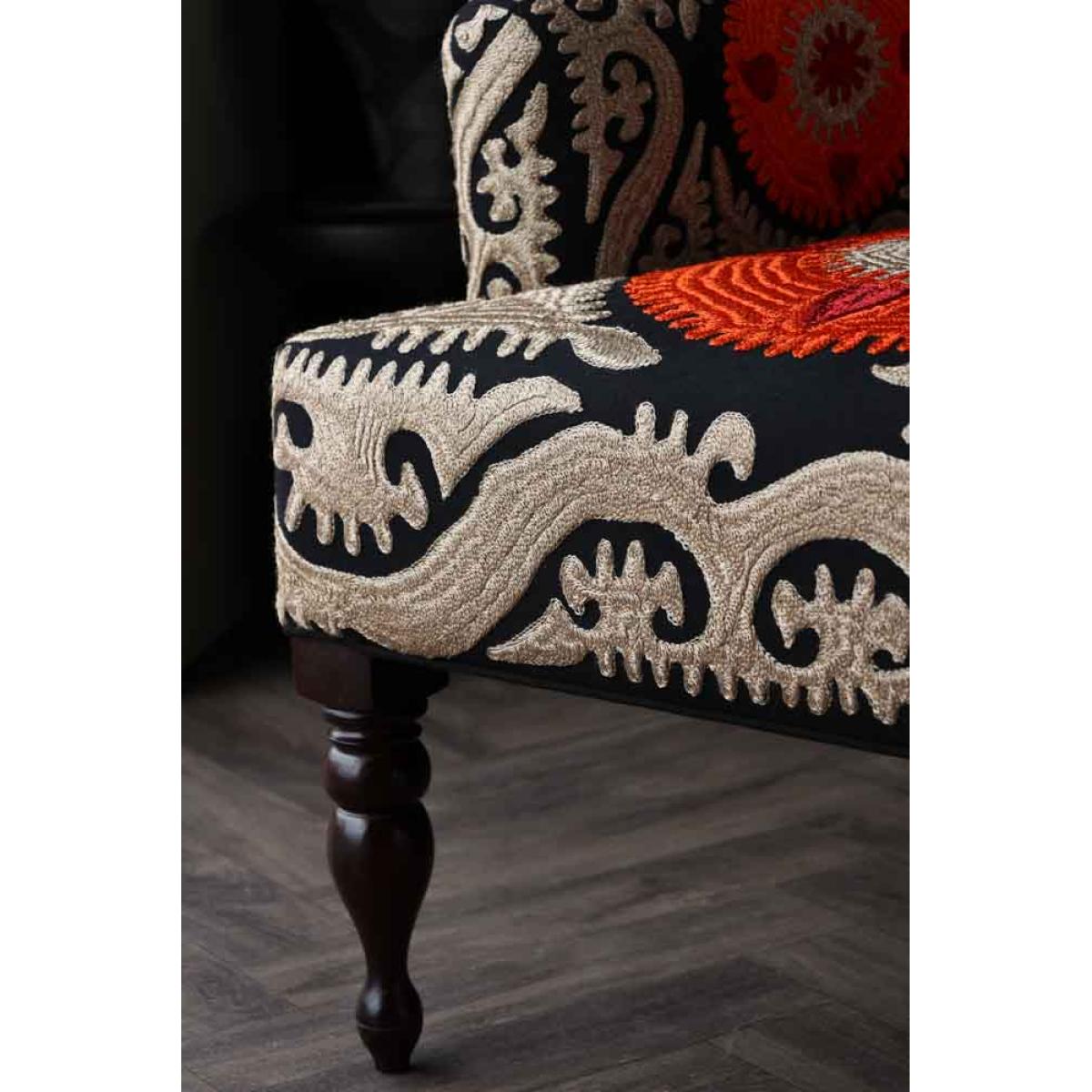 About The Embroidered Folk Pattern ArmchairThe Embroidered Folk Pattern Armchair is a dazzling showpiece to display in your home. Showcasing immense craftsmanship, this spacious armchair features an utterly beautiful handmade embroidered folk pattern in a vibrant orange, red and cream colourway with luxurious brown turned wood legs on the front and simple, straight legs on the back. Showcasing a stunning sheen to the embroidery with comfy foam cushions, this unique armchair is a marvellous occasional chair that’ll steal the show displayed in your living room, hallway or bedroom. This large armchair measures 88cm in height, 75cm in width and 88cm in depth. Why We Think You’ll Love The Folk Pattern Embroidered ArmchairExquisitely handcrafted, this colourful armchair will make an instant impact in your interior scheme. Offering a sumptuous texture and an eye-catching design, this living room armchair will provide the most comfortable spot to sit back and read a book. A true hero piece, we think this statement armchair is simply ravishing, so what’s not to love?!Where To Style The Embroidered Folk Pattern Large ArmchairThis stunning statement piece demands to be the focal point of any room its style in with its utterly unique design that’ll inject instant wow-factor wherever it's placed. With high arms made for added comfort, this cosy armchair is the perfect piece to relax in, so why not display it in your living room creating a stunning style spot that also doubles up as a marvellous talking point. Alternatively, display this comfy armchair in your bedroom for a tranquil serene vibe that showcases downright fashionable style sense.