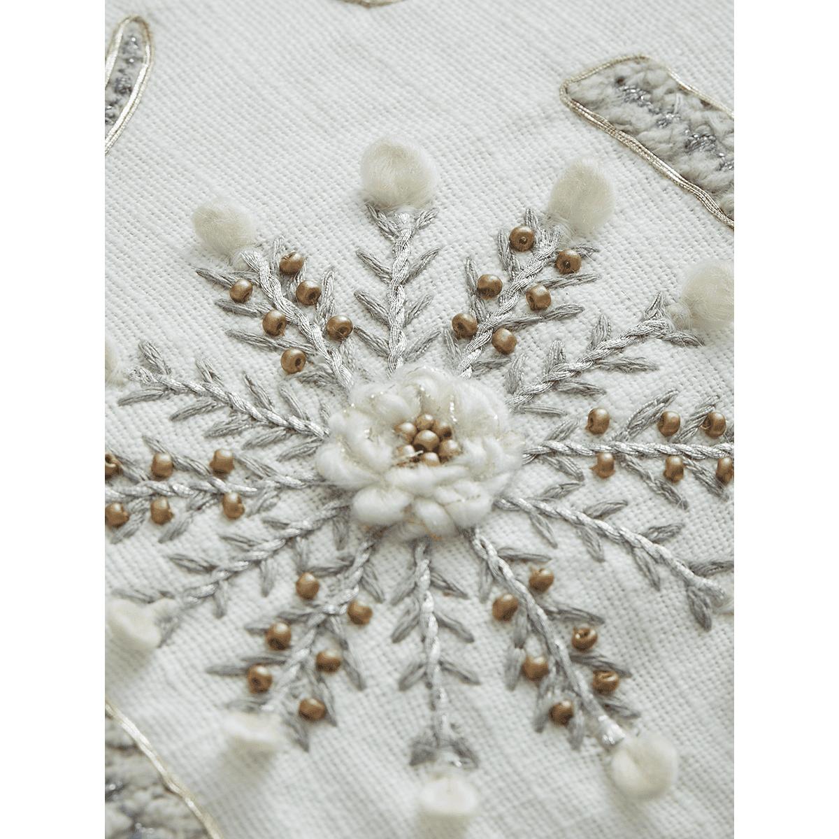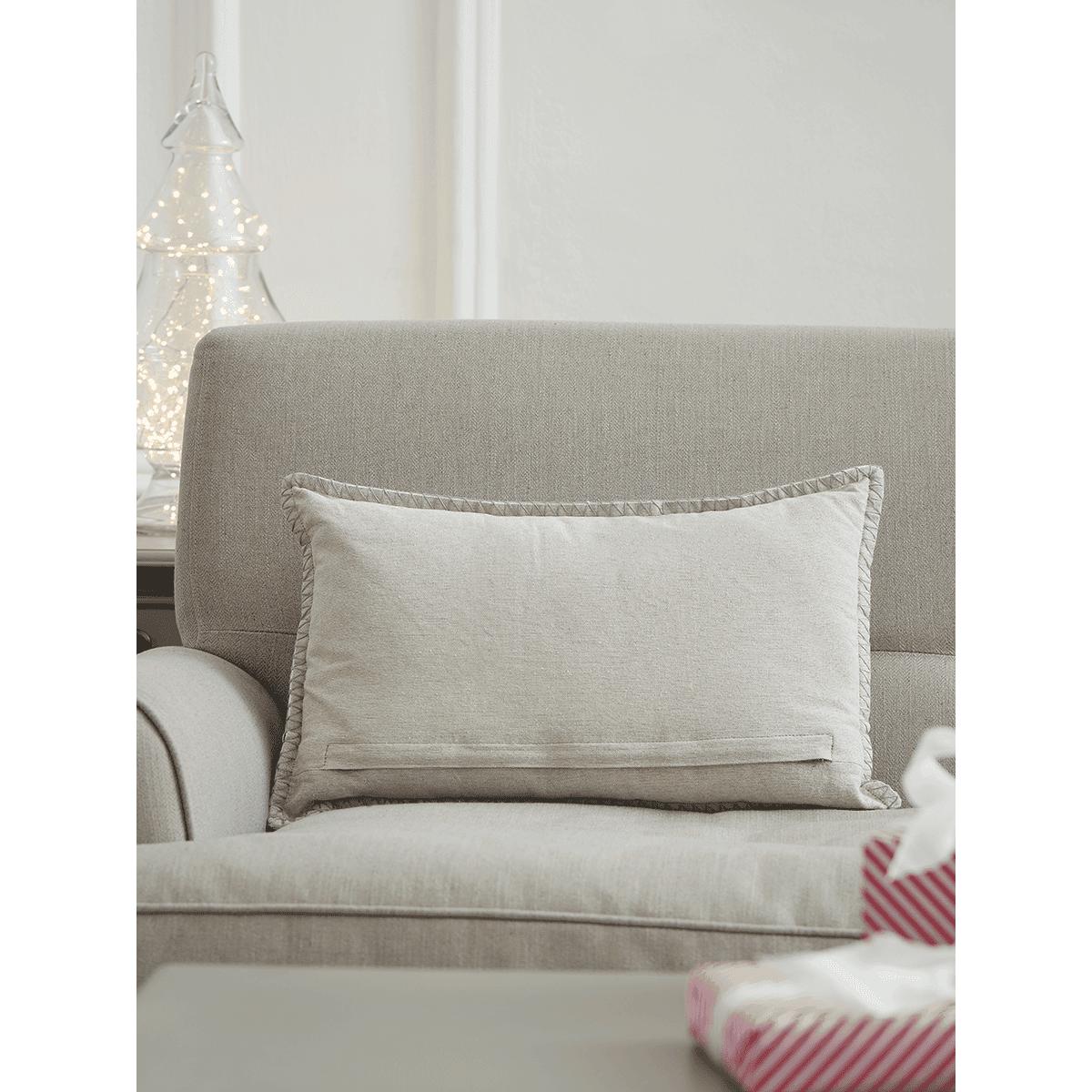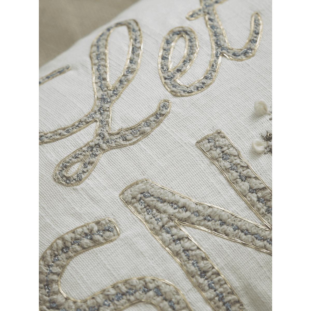A subtle introduction to the festive season, this pretty cushion in plain cream features a blend of appliqué and embroidery, with gold beaded highlights to spell out Let it Snow. Full of muted tones and texture and with a rustic blanket-stitched edge, it’s a lovely addition to a sofa or chair in a pared-back interior.
