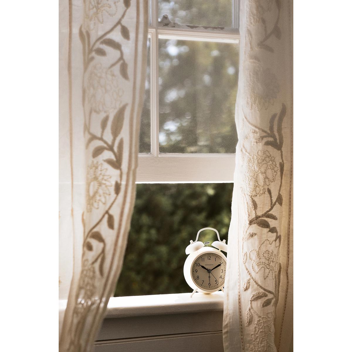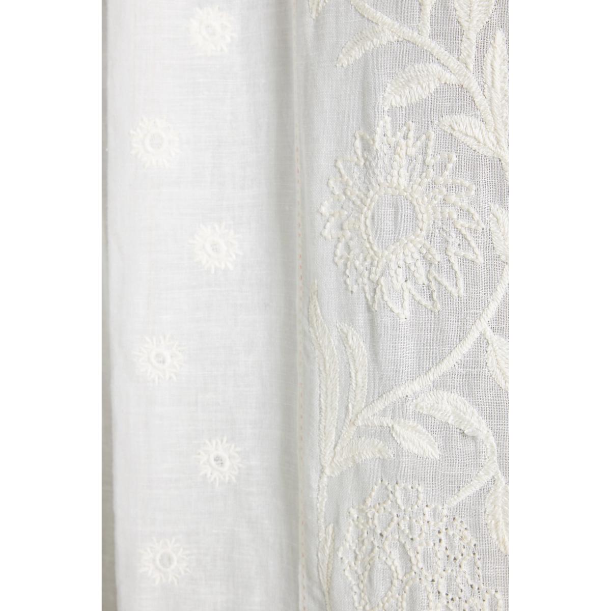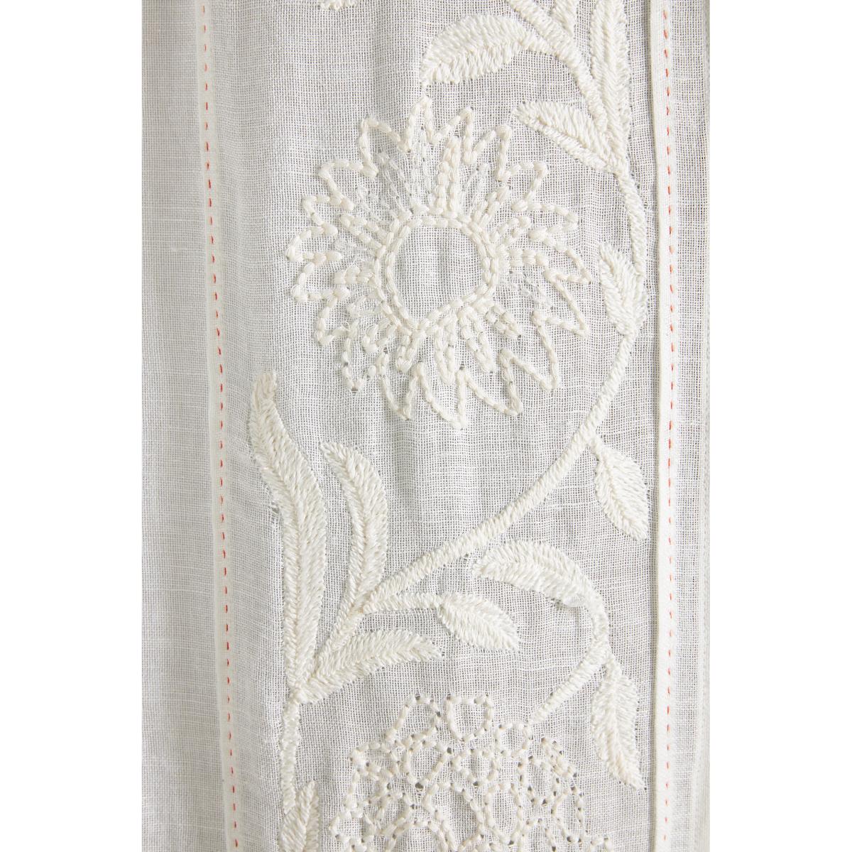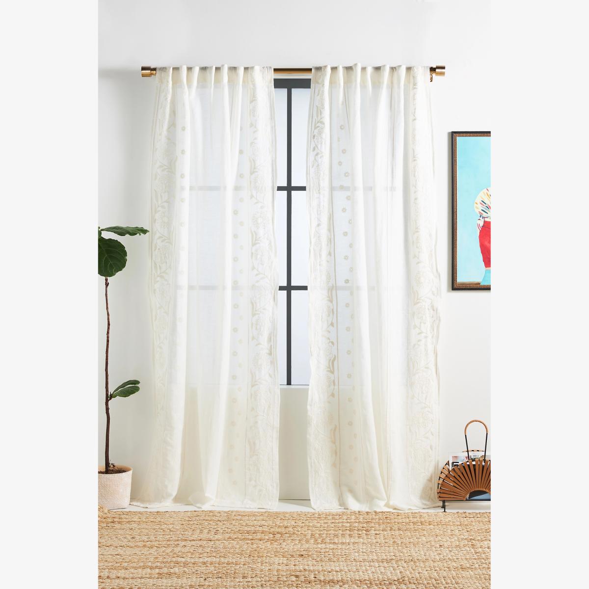 Embellished with embroidered florals and botanicals, this curtain brings an artful touch to your space. Peach: A light pink with contrasting ochre thread. Neutral:A neutral beige with contrasting black thread. White: A classic white with contrasting red thread. Embroidered Manette Floral Curtain by Anthropologie in White Size: 108"