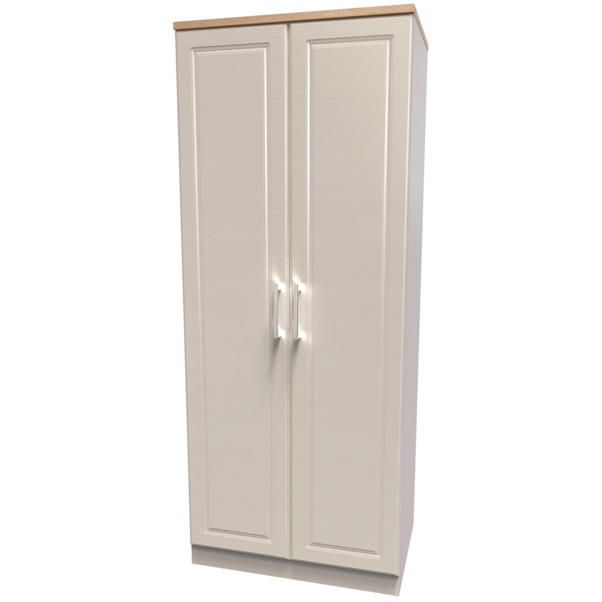 This 2 door Wardrobe from the traditional Emeley range provides a practical place to hang your clothes. Includes a sturdy internal hanging rail and fixed high level internal shelf for extra storage options. Features sturdy metal pull handles and a contrasting wood effect top.