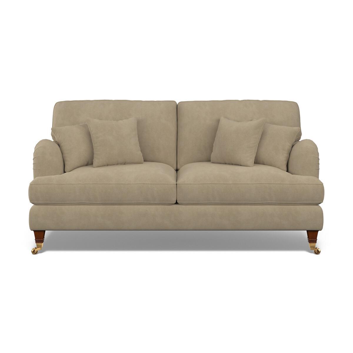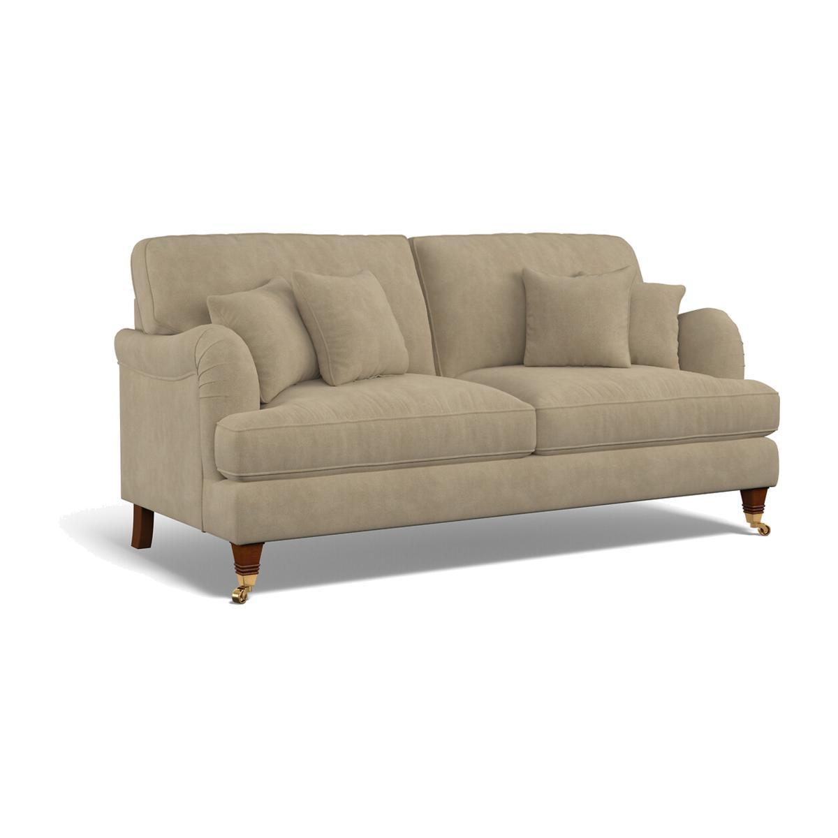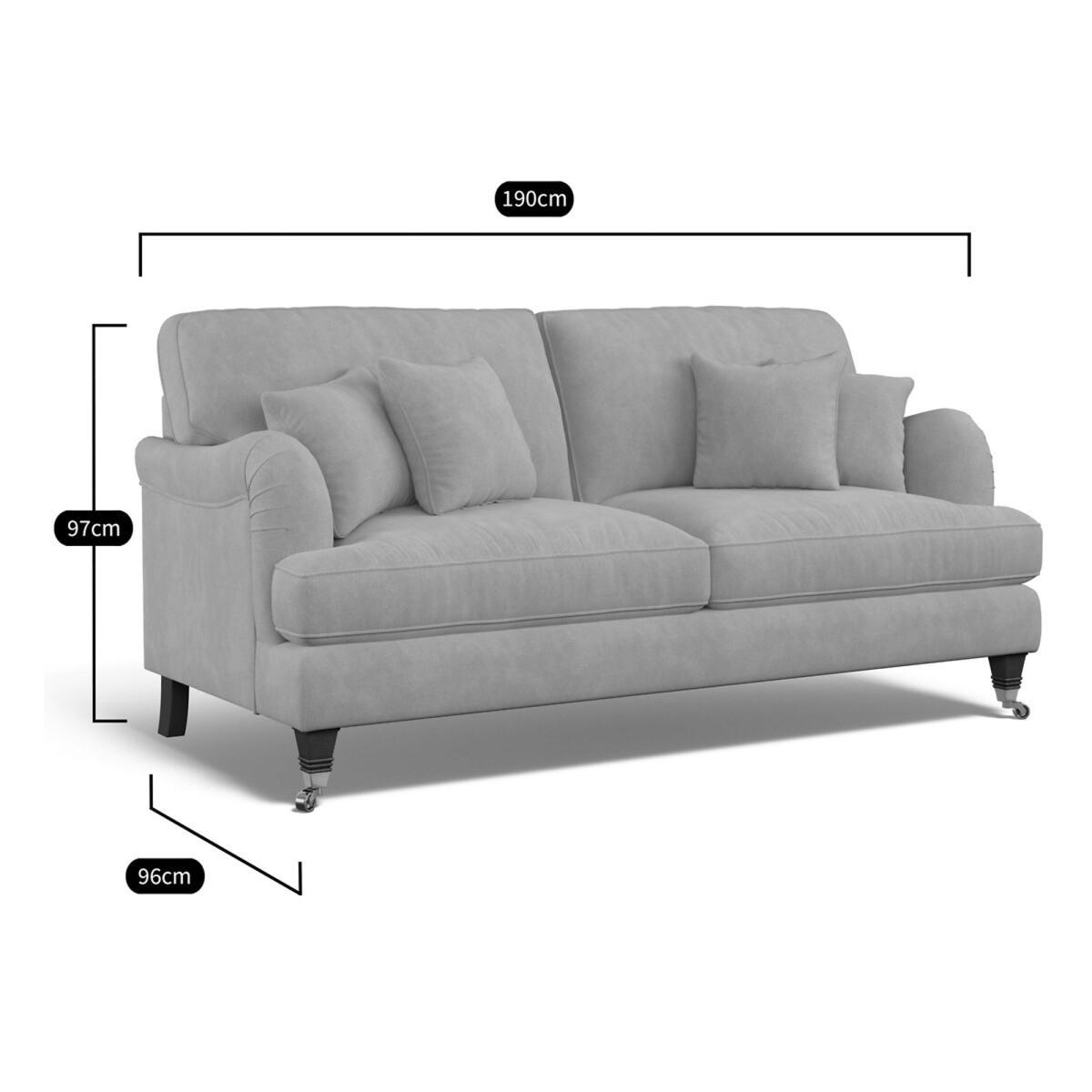 With its pleated fabric, beautiful curves and classic castors, Emelines's timeless shape fits both traditional or contemporary spaces. A high back and scalloped arms all add that extra comfort. Keep it classic in soft brushed fabric or go bold in a vibrant velvet. All made to order sofas are carefully manufactured in the UK.Each hardwood frame is dowelled, glued, and screwed before being paired with the finest fabrics and fillings. And it doesn't stop there - for customer peace of mind and safety, all frames and fabrics are rigorously examined, inspected, and tested to the highest standards. Product Specifications:. Product Dimensions: L96cmxW190cmxH9. 7cm. Fabric: Soft Brushed - 100% Polyester. Feet: Antique Brass Castor. Scatter Cushions: 4 Fibre filled Scatter Cushions included in matching fabric. Extraflex high comfort seat cushions - A high density foam base seat interior with a hand-rolled carded fibre, channelled topper which provides both softness and support. Superloop back springs. Serpentine seat springs & silent wire. Care Guide :Extraflex seat cushions should be plumped up on a regular basis to help maintain the aesthetical appeal of your upholstery, the plumping of cushions is essential to help retain the comfort and softness of any piece of upholstered furniture. To improve the longevity of your hand-made furniture, we recommend rotating cushions (where applicable).For further information on maintaining your furniture please refer to the care guide located under the seat platform. Packaged Dimensions: 192cmx98cmx86cm - Please remember to measure your available space before ordering. The Emeline Range is also available in Velvet & Textured Velvet in a variety of colours. This product will be dispatched by one of our trusted suppliers. You’ll be contacted by their selected courier about your delivery. Your product will be delivered to your room of Choice. All multi part items and feet will be assembled once delivered.