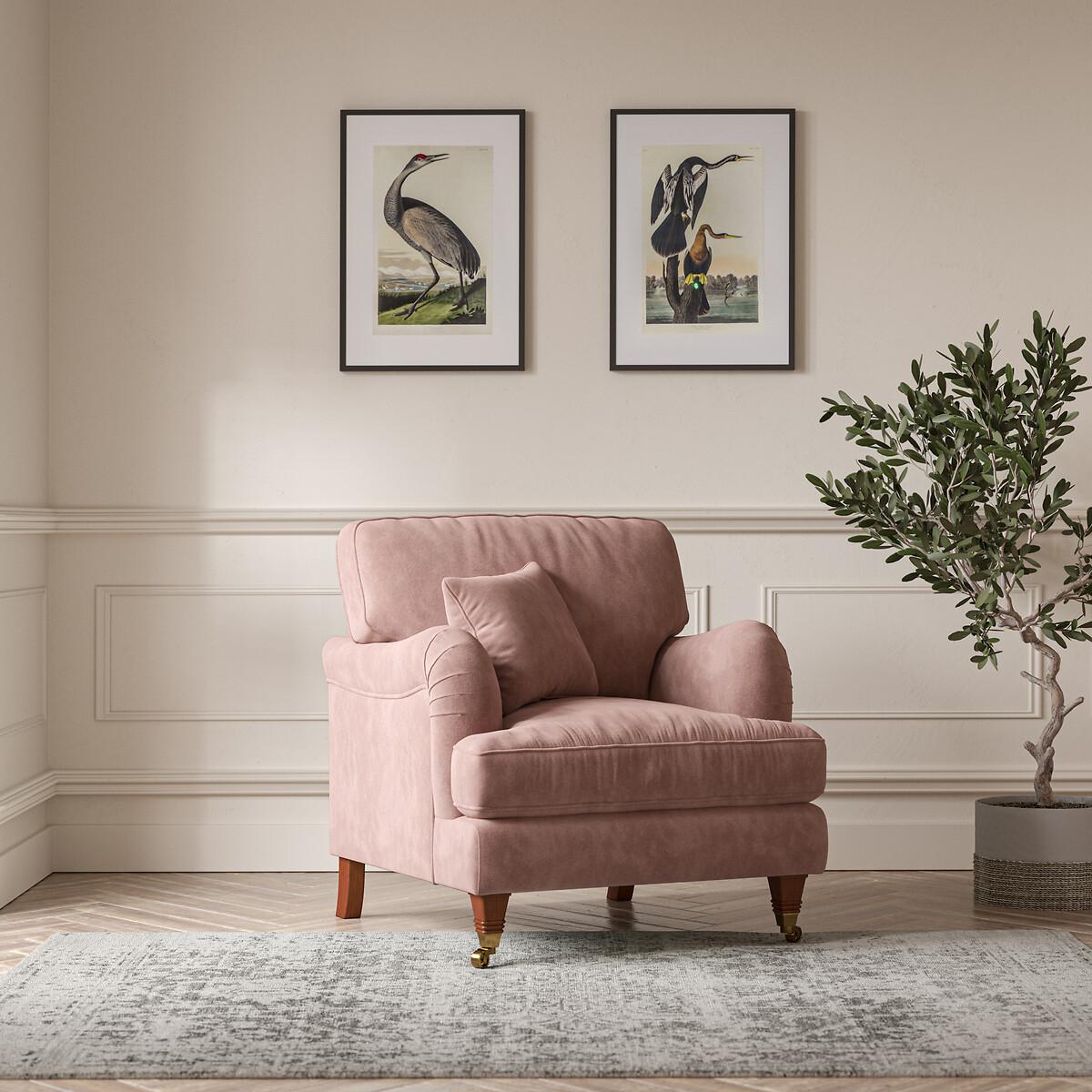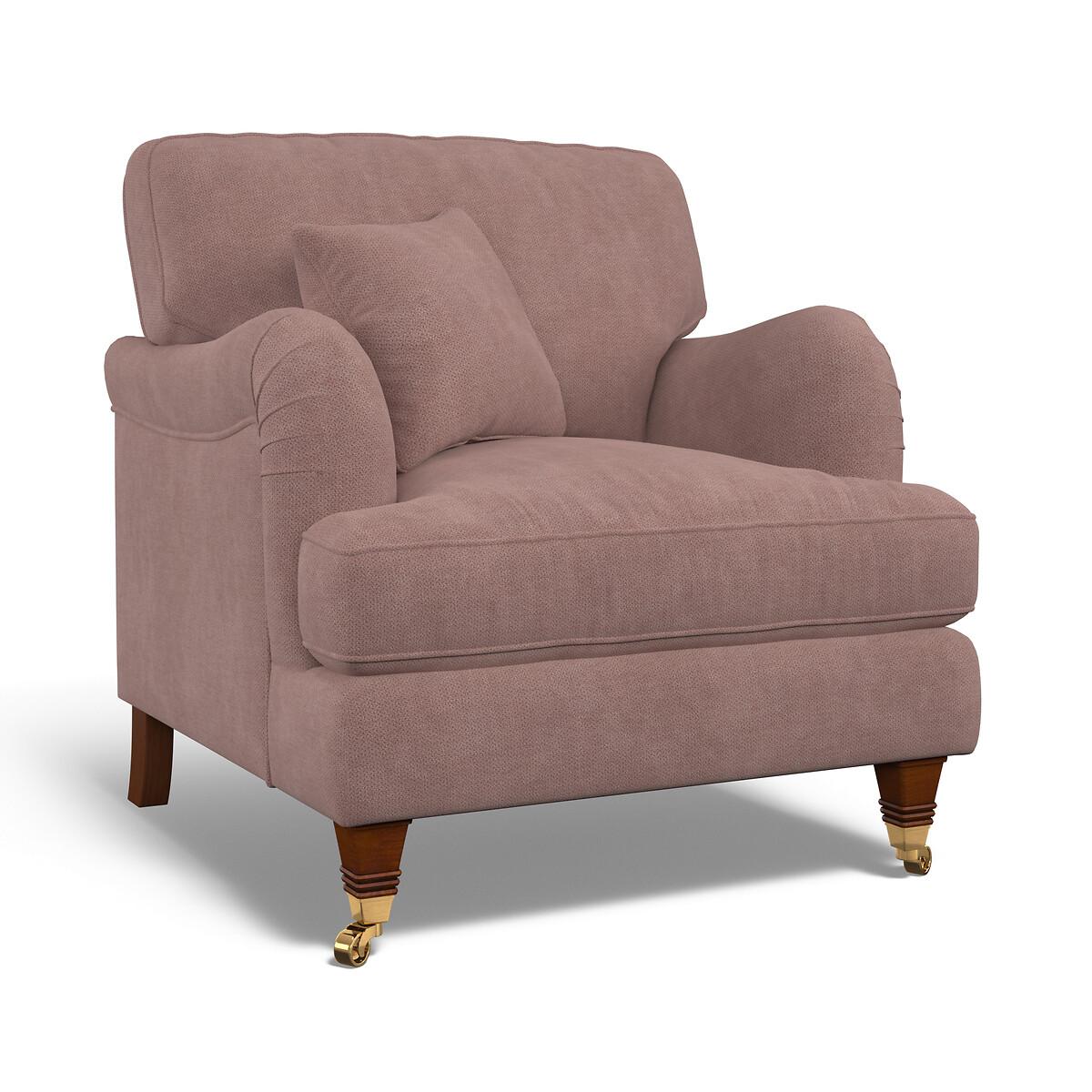 The perfect accent armchair for a cosy corner. With its pleated fabric, beautiful curves and classic castors, Emeline's elegant silhouette fits both modern or vintage living rooms. Foam and fibre fillings are paired with a sprung base for supreme comfort. A high back adds extra support, and scalloped English roll arms and piped edge detailing finish the sumptuous look. Keep it classic in soft brushed fabric or go bold in a vibrant velvet. Match with the Emeline footstool, or choose a bigger size with the 2 seater, 3 seater, or corner chaise sofa. Product details• Soft Brushed - A cosy and practical flat and soft weave featuring a gently brushed handle for a superbly snuggly seat. Check it's right for you - order a FREE swatch above.• A supportive seat with medium comfort level, underpinned by a spring frame for durability.• Extraflex© high comfort seat cushions have a special hybrid filling made up of a thick layer of resilient foam, topped with a generous layer of super soft fibre, meaning they are firm in the centre but have a pillowy comfortably layer of softness. • Back cushions full of aerated fibres provide softness and give you that "sink in" feeling.. Just flip to freshen up - the back cushions are finished both sides and are reversible. • Scatter cushion included as pictured in matching fabric. Fibre filled. • Elegantly carved solid beech wood castor feet with brass finishing.• Serpentine seat springs & silent wire.• Superloop back springs.• Solid hardwood frame.• Removable covers (both seat and back)• Removable feet.• Lovingly handmade in the UK.All our made to order sofas are carefully manufactured in the UK.Each hardwood frame is dowelled, glued, and screwed before being paired with the finest fabrics and fillings. And it doesn't stop there - for customer peace of mind and safety, all frames and fabrics are rigorously examined, inspected, and tested to the highest standards. All filling material(s) and covering fabric(s) meet the requirements for resistance to cigarette and match ignition in the 1988 safety regulations. A 2 year manufacturers warranty from date of delivery (guarantee of replacement of any faulty goods subject to the product having been used under normal conditions for its intended purpose)Product composition• Fabric- Soft Brushed (100% polyester)• Seat Fillings - Extraflex foam• Back Fillings - Blown fibre• Feet - solid beech wood• Frame - solid hardwood Product Dimensions Overall width: 89 cm. Overall depth: 96 cm. Overall height: 97 cm. Seat height: 54 cm. Seat depth: 56 cm. Seat width between the arms: 59 cm. Back height (from base): 84 cm. Back height (from seat): 41 cm. Arm height (from floor): 65 cm. Arm height (from seat): 11 cm Clearance to floor (leg height): 13.5 cm. Small scatter cushion: 45 cm x 45 cm. Please remember to measure your available space before ordering to be sure your sofa will fit. Don't forget to measure accessways and corners, and consider any obstacles. Package DimensionsL9. 8 cm x W91 cm x H86 cm, Weight 37.5 kg. This product will be dispatched by one of our trusted suppliers. You’ll be contacted by their selected courier about your delivery. Your product will be delivered to your room of choice. Some of our Made to Order sofas and armchairs are delivered with Travel Glide feet which are used when the sofa is in transit. You can find the actual feet in a bag on the seat cushion of the sofa, complete with assembly instructions. No additional tools are required for assembly. BUOYA01