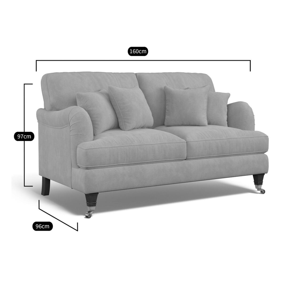 With its pleated fabric, beautiful curves and classic castors, Emelines's timeless shape fits both traditional or contemporary spaces. A high back and scalloped arms all add that extra comfort. Keep it classic in soft brushed fabric or go bold in a vibrant velvet. All made to order sofas are carefully manufactured in the UK.Each hardwood frame is dowelled, glued, and screwed before being paired with the finest fabrics and fillings. And it doesn't stop there - for customer peace of mind and safety, all frames and fabrics are rigorously examined, inspected, and tested to the highest standards. Product Specifications:. Product Dimensions: L96cmxW160cmxH9. 7cm. Fabric: Textured Velvet - 100% Polyester. Feet: Antique Brass Castor. Scatter Cushions: 4 Fibre filled Scatter Cushions included in matching fabric. Extraflex high comfort seat cushions - A high density foam base seat interior with a hand-rolled carded fibre, channelled topper which provides both softness and support. Superloop back springs. Serpentine seat springs & silent wire. Care Guide :Extraflex seat cushions should be plumped up on a regular basis to help maintain the aesthetical appeal of your upholstery, the plumping of cushions is essential to help retain the comfort and softness of any piece of upholstered furniture. To improve the longevity of your hand-made furniture, we recommend rotating cushions (where applicable).For further information on maintaining your furniture please refer to the care guide located under the seat platform. Packaged Dimensions: 162cmx98cmx86cm - Please remember to measure your available space before ordering. The Emeline Range is also available in Velvet & Soft Brushed in a variety of colours. This product will be dispatched by one of our trusted suppliers. You’ll be contacted by their selected courier about your delivery. Your product will be delivered to your room of Choice. All multi part items and feet will be assembled once delivered.