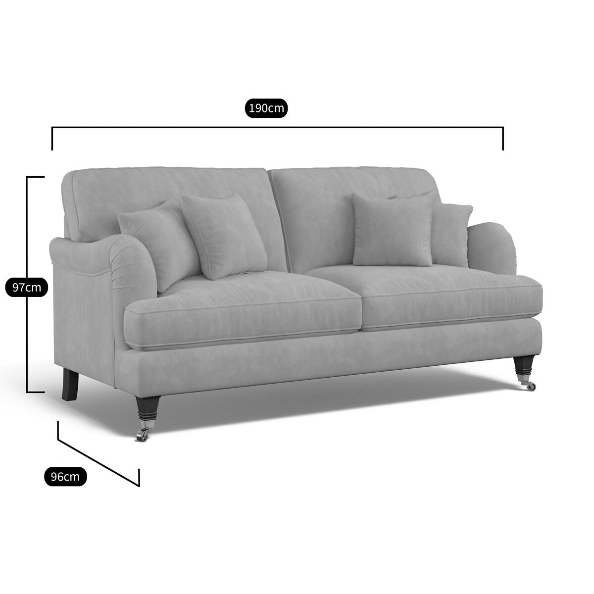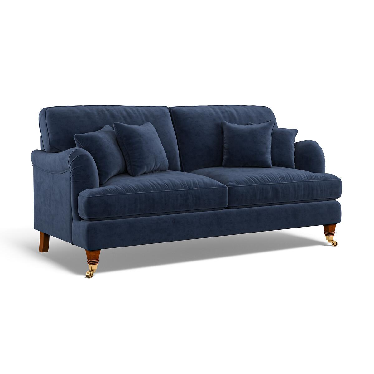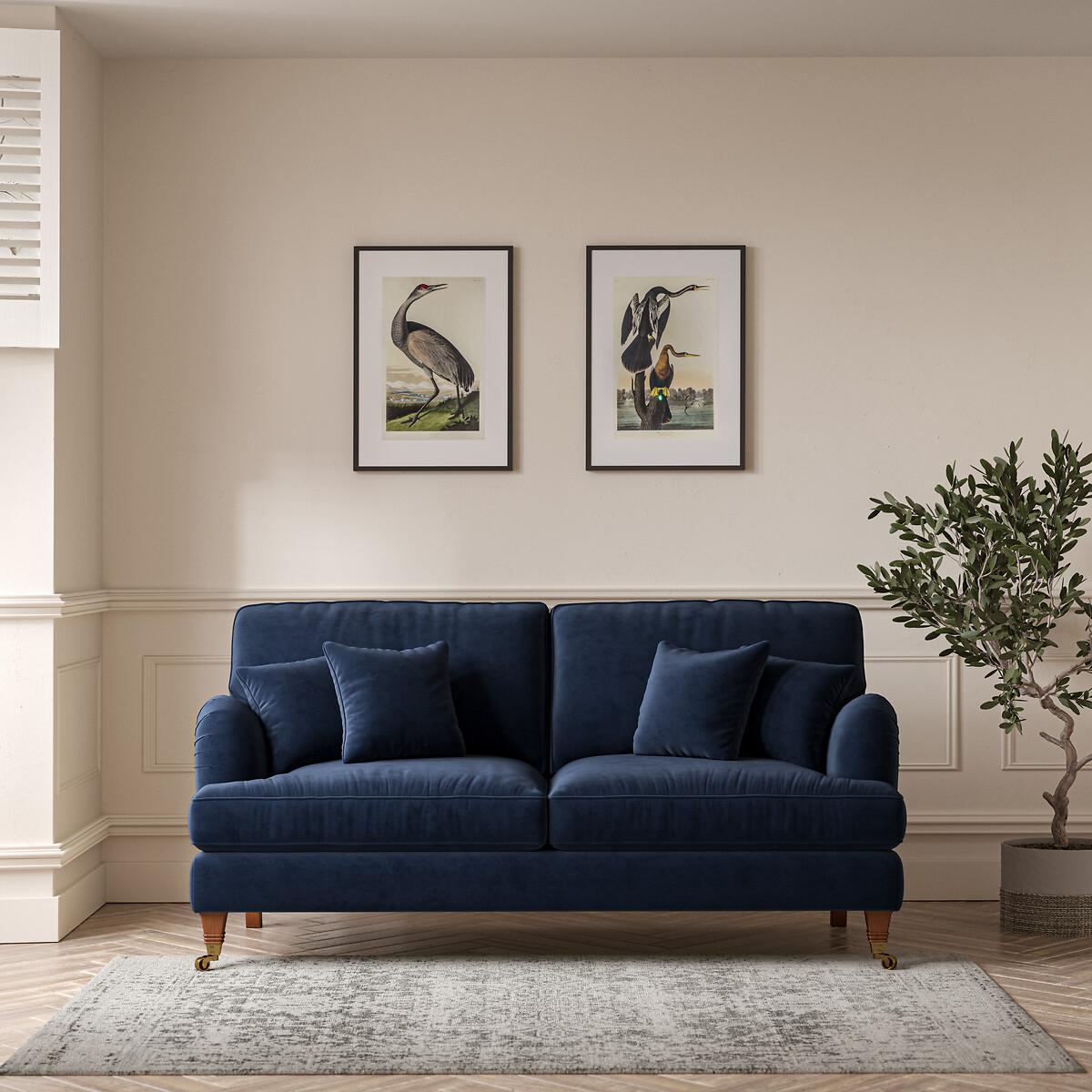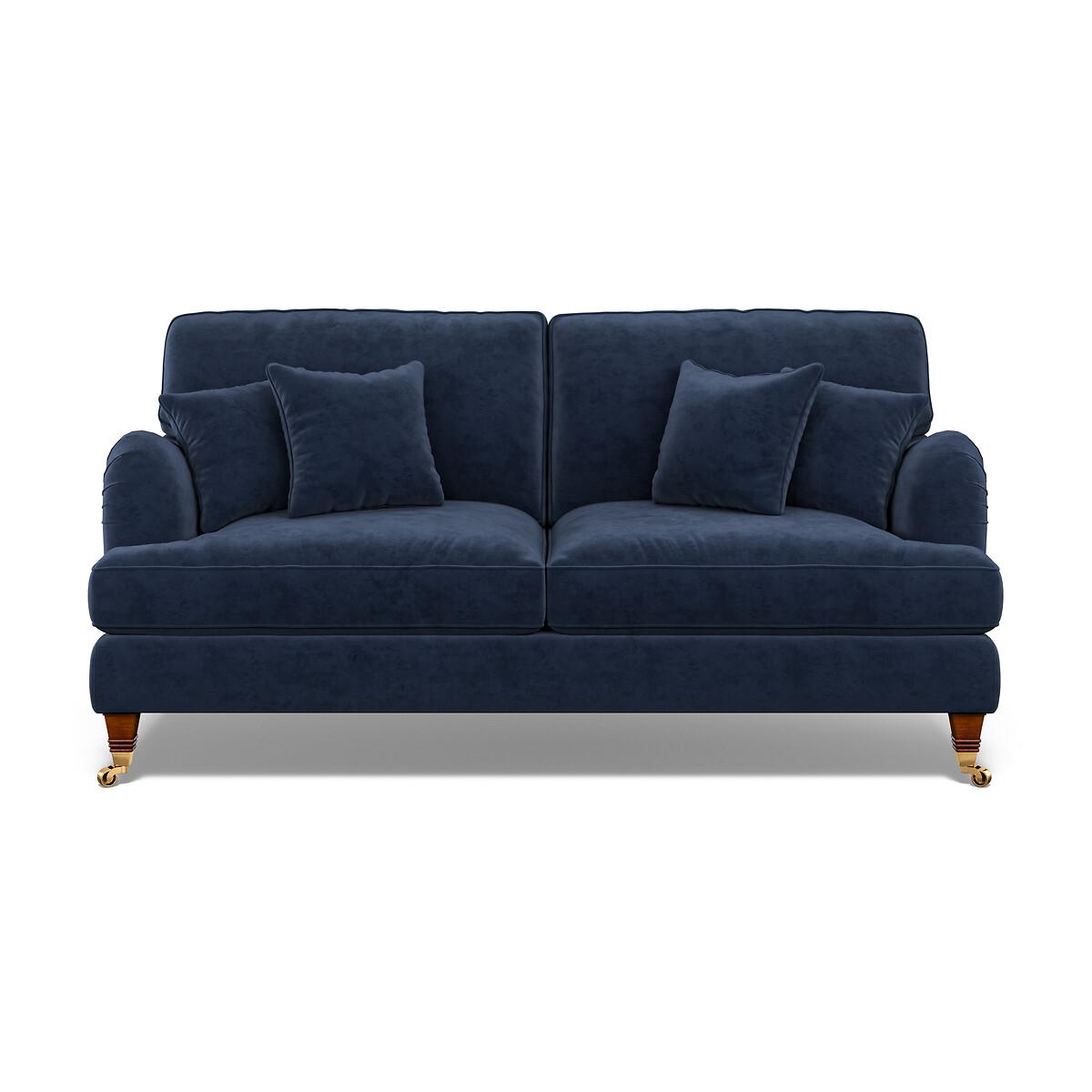 With its pleated fabric, beautiful curves and classic castors, Emeline's elegant silhouette fits both modern or vintage living rooms. Foam and fibre fillings are paired with a sprung base for supreme comfort. A high back adds extra support, and scalloped English roll arms and piped edge detailing finish the sumptuous look. Keep it classic in soft brushed fabric or go bold in a vibrant velvet. The Emeline sofa is available as a 2 seater, a 3 seater or an L-shaped corner sofa. Matching armchair, snuggle chair and footstool available. Product details• Velvet - An elegant velvet with a dense and matte finish, perfect for those wanting a rich and luxurious look. A flat finish pile makes it difficult for the material to snag – ideal if you live with pets and sure to prove durable for years to come. Check it's right for you - order a FREE swatch above.• A supportive seat with medium comfort level, underpinned by a spring frame for durability.• Extraflex© high comfort seat cushions have a special hybrid filling made up of a thick layer of resilient foam, topped with a generous layer of super soft fibre, meaning they are firm in the centre but have a pillowy comfortably layer of softness.• Back cushions full of aerated fibres provide softness and give you that "sink in" feeling.. Just flip to freshen up - the back cushions are finished both sides and are reversible.• Scatter cushions included as pictured in matching fabric. Fibre filled (x4)• Elegantly carved solid beech wood castor feet with brass finishing.• Serpentine seat springs & silent wire.• Superloop back springs.• Solid hardwood frame.• Removable covers (both seat and back)• Removable feet.• Lovingly handmade in the UK.All our made to order sofas are carefully manufactured in the UK.Each hardwood frame is dowelled, glued, and screwed before being paired with the finest fabrics and fillings. And it doesn't stop there - for customer peace of mind and safety, all frames and fabrics are rigorously examined, inspected, and tested to the highest standards. All filling material(s) and covering fabric(s) meet the requirements for resistance to cigarette and match ignition in the 1988 safety regulations. A 2 year manufacturers warranty from date of delivery (guarantee of replacement of any faulty goods subject to the product having been used under normal conditions for its intended purpose)Product composition• Fabric- Velvet (100% polyester)• Seat Fillings - Extraflex foam• Back Fillings - Blown fibre• Feet - solid beech wood• Frame - solid hardwood Product Dimensions Overall width: 190 cm. Overall depth: 96 cm. Overall height: 97 cm. Seat height: 54 cm. Seat depth: 56 cm. Seat width between the arms: 157 cm. Back height (from base): 84 cm. Back height (from seat): 41 cm. Arm height (from floor): 65 cm. Arm height (from seat): 11 cm Clearance to floor (leg height): 13.5 cm. Small scatter cushions x 4: 45 cm x 45 cm. Please remember to measure your available space before ordering to be sure your sofa will fit. Don't forget to measure accessways and corners, and consider any obstacles. Package DimensionsL19. 2 cm x W98 cm x H86 cm, Weight 55 kg. This product will be dispatched by one of our trusted suppliers. You’ll be contacted by their selected courier about your delivery. Your product will be delivered to your room of choice. Some of our Made to Order sofas and armchairs are delivered with Travel Glide feet which are used when the sofa is in transit. You can find the actual feet in a bag on the seat cushion of the sofa, complete with assembly instructions. No additional tools are required for assembly. BUOYA01