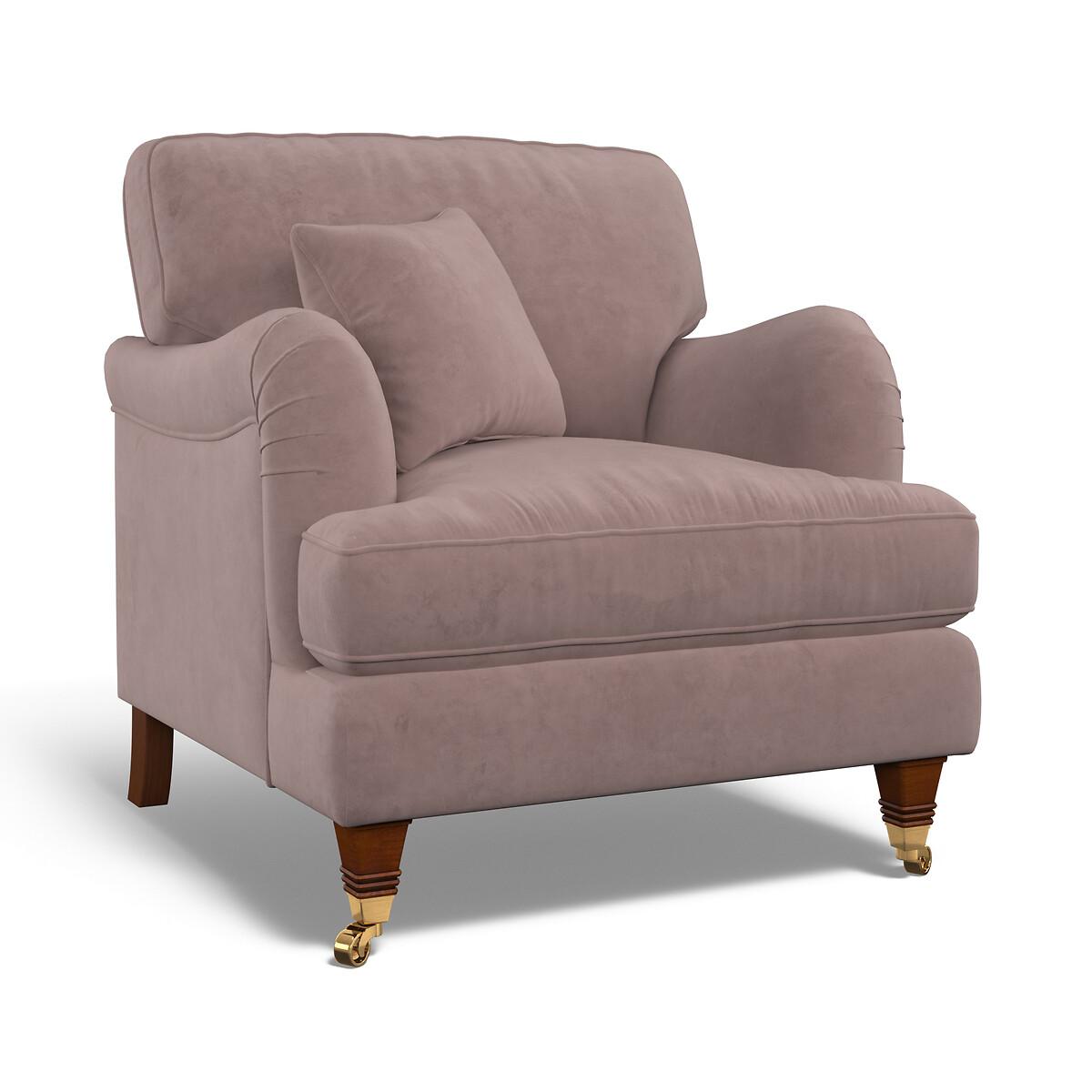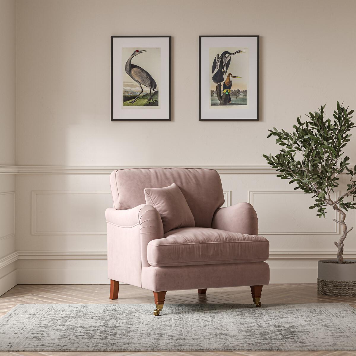 The perfect accent armchair for a cosy corner. With its pleated fabric, beautiful curves and classic castors, Emeline's elegant silhouette fits both modern or vintage living rooms. Foam and fibre fillings are paired with a sprung base for supreme comfort. A high back adds extra support, and scalloped English roll arms and piped edge detailing finish the sumptuous look. Keep it classic in soft brushed fabric or go bold in a vibrant velvet. Match with the Emeline footstool, or choose a bigger size with the 2 seater, 3 seater, or corner chaise sofa. Product details• Velvet - An elegant velvet with a dense and matte finish, perfect for those wanting a rich and luxurious look. A flat finish pile makes it difficult for the material to snag – ideal if you live with pets and sure to prove durable for years to come. Check it's right for you - order a FREE swatch above.• A supportive seat with medium comfort level, underpinned by a spring frame for durability.• Extraflex© high comfort seat cushions have a special hybrid filling made up of a thick layer of resilient foam, topped with a generous layer of super soft fibre, meaning they are firm in the centre but have a pillowy comfortably layer of softness. • Back cushions full of aerated fibres provide softness and give you that "sink in" feeling.. Just flip to freshen up - the back cushions are finished both sides and are reversible. • Scatter cushion included as pictured in matching fabric. Fibre filled. • Elegantly carved solid beech wood castor feet with brass finishing.• Serpentine seat springs & silent wire.• Superloop back springs.• Solid hardwood frame.• Removable covers (both seat and back)• Removable feet.• Lovingly handmade in the UK.All our made to order sofas are carefully manufactured in the UK.Each hardwood frame is dowelled, glued, and screwed before being paired with the finest fabrics and fillings. And it doesn't stop there - for customer peace of mind and safety, all frames and fabrics are rigorously examined, inspected, and tested to the highest standards. All filling material(s) and covering fabric(s) meet the requirements for resistance to cigarette and match ignition in the 1988 safety regulations. A 2 year manufacturers warranty from date of delivery (guarantee of replacement of any faulty goods subject to the product having been used under normal conditions for its intended purpose)Product composition• Fabric- Velvet (100% polyester)• Seat Fillings - Extraflex foam• Back Fillings - Blown fibre• Feet - solid beech wood• Frame - solid hardwood Product Dimensions Overall width: 89 cm. Overall depth: 96 cm. Overall height: 97 cm. Seat height: 54 cm. Seat depth: 56 cm. Seat width between the arms: 59 cm. Back height (from base): 84 cm. Back height (from seat): 41 cm. Arm height (from floor): 65 cm. Arm height (from seat): 11 cm Clearance to floor (leg height): 13.5 cm. Small scatter cushion: 45 cm x 45 cm. Please remember to measure your available space before ordering to be sure your sofa will fit. Don't forget to measure accessways and corners, and consider any obstacles. Package DimensionsL9. 8 cm x W91 cm x H86 cm, Weight 37.5 kg. This product will be dispatched by one of our trusted suppliers. You’ll be contacted by their selected courier about your delivery. Your product will be delivered to your room of choice. Some of our Made to Order sofas and armchairs are delivered with Travel Glide feet which are used when the sofa is in transit. You can find the actual feet in a bag on the seat cushion of the sofa, complete with assembly instructions. No additional tools are required for assembly. BUOYA01