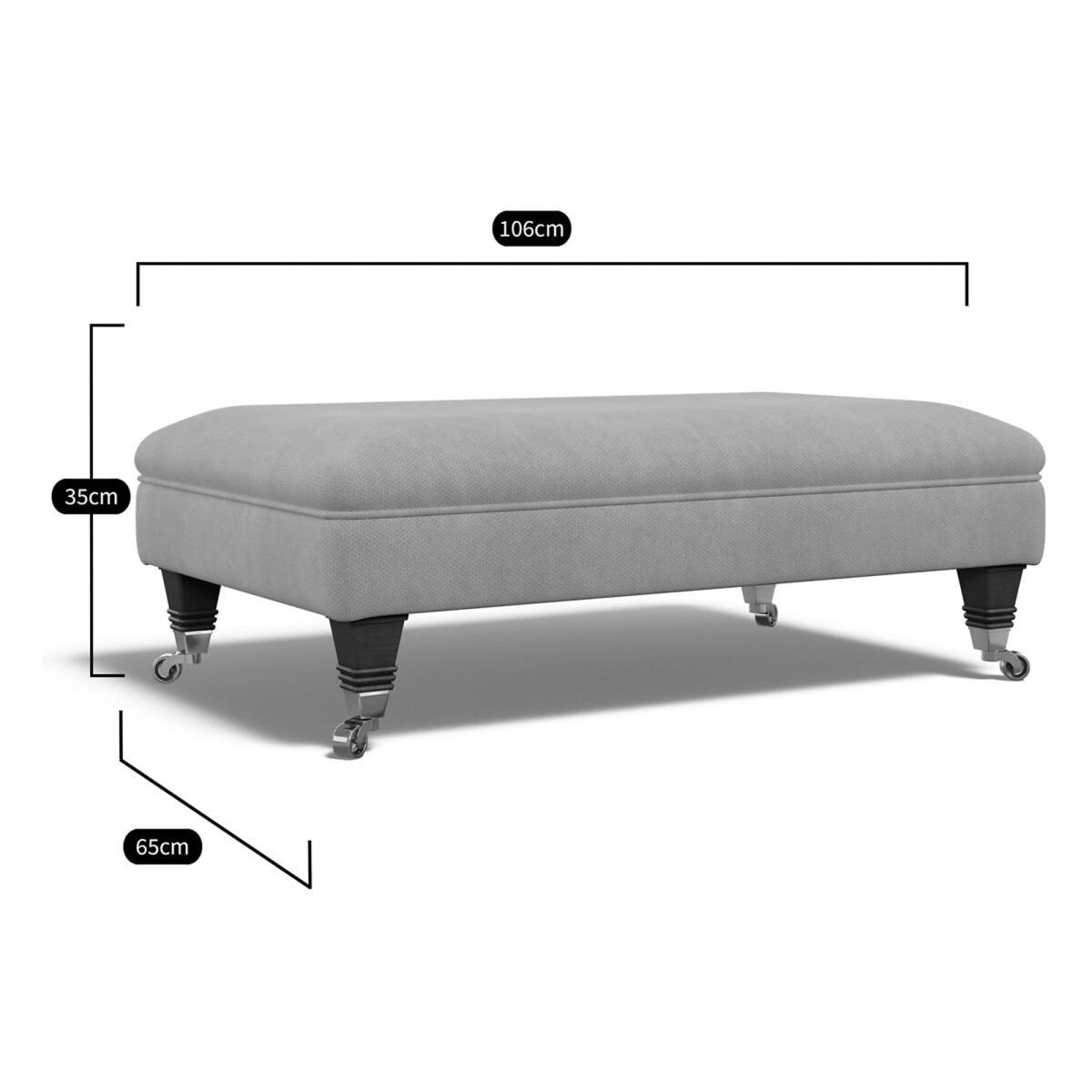 Perfect for tired feet at the end of a long day, or style it up with a tray and relaxing candles. With its pleated fabric, beautiful curves and classic castors, Emeline's timeless shape fits both modern or vintage living rooms. Keep it classic in soft brushed fabric or go bold in a vibrant velvet. Match with the Emeline armchair, or go large with the 2 seater, 3 seater, or corner chaise sofa. Product details• Velvet - An elegant velvet with a dense and matte finish, perfect for those wanting a rich and luxurious look. A flat finish pile makes it difficult for the material to snag – ideal if you live with pets and sure to prove durable for years to come. Check it's right for you - order a FREE swatch above.• High density foam base interior with a hand-rolled carded fibre, channelled topper • Solid hardwood frame.• Removable feet.• Lovingly handmade in the UK.All our made to order sofas are carefully manufactured in the UK.Each hardwood frame is dowelled, glued, and screwed before being paired with the finest fabrics and fillings. And it doesn't stop there - for customer peace of mind and safety, all frames and fabrics are rigorously examined, inspected, and tested to the highest standards. All filling material(s) and covering fabric(s) meet the requirements for resistance to cigarette and match ignition in the 1988 safety regulations. A 2 year manufacturers warranty from date of delivery (guarantee of replacement of any faulty goods subject to the product having been used under normal conditions for its intended purpose)All our made to order sofas are carefully manufactured in the UK.Each hardwood frame is dowelled, glued, and screwed before being paired with the finest fabrics and fillings. And it doesn't stop there - for customer peace of mind and safety, all frames and fabrics are rigorously examined, inspected, and tested to the highest standards. Product composition• Fabric- Velvet (100% polyester)• Fillings - Extraflex foam• Feet - solid beech wood• Frame - solid hardwood Product Dimensions Overall width: 106 cm. Overall depth: 65 cm. Overall height: 35 cm. Please remember to measure your available space before ordering to be sure your sofa will fit. Package dimensionsL10. 8 cm x W67 cm x H15 cm, Weight 16.5 kg. This product will be dispatched by one of our trusted suppliers. You’ll be contacted by their selected courier about your delivery. Your product will be delivered to your room of choice. Some of our Made to Order sofas and armchairs are delivered with Travel Glide feet which are used when the sofa is in transit. You can find the actual feet in a bag on the seat cushion of the sofa, complete with assembly instructions. No additional tools are required for assembly. BUOYA01