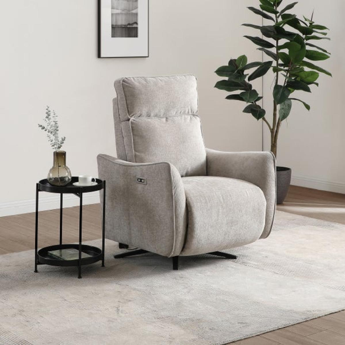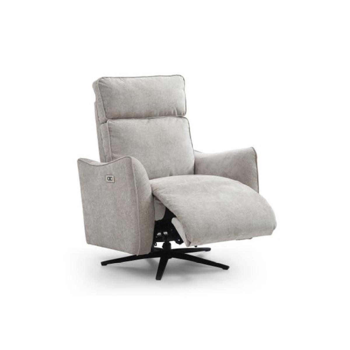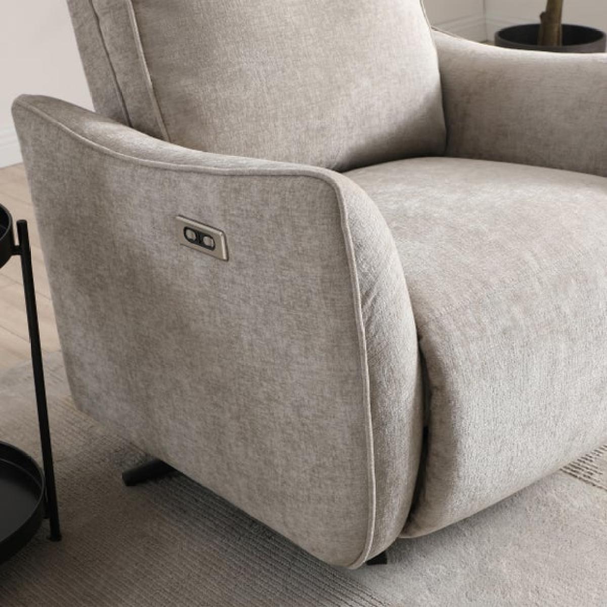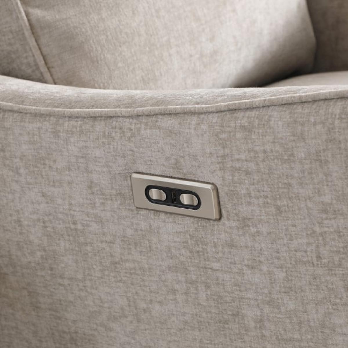 * Electric recliner chair * Smooth swivel base * Plush cushions * Tested up to 135kg Relax in refined comfort with the Emil recliner swivel chair. This elegant recliner boasts an electric mechanism that lets you adjust the back and footrest independently, all while enjoying a smooth swivel motion. The soft chenille fabric in a warm natural tone pairs beautifully with the chair’s sculptural armrests and tailored piping.