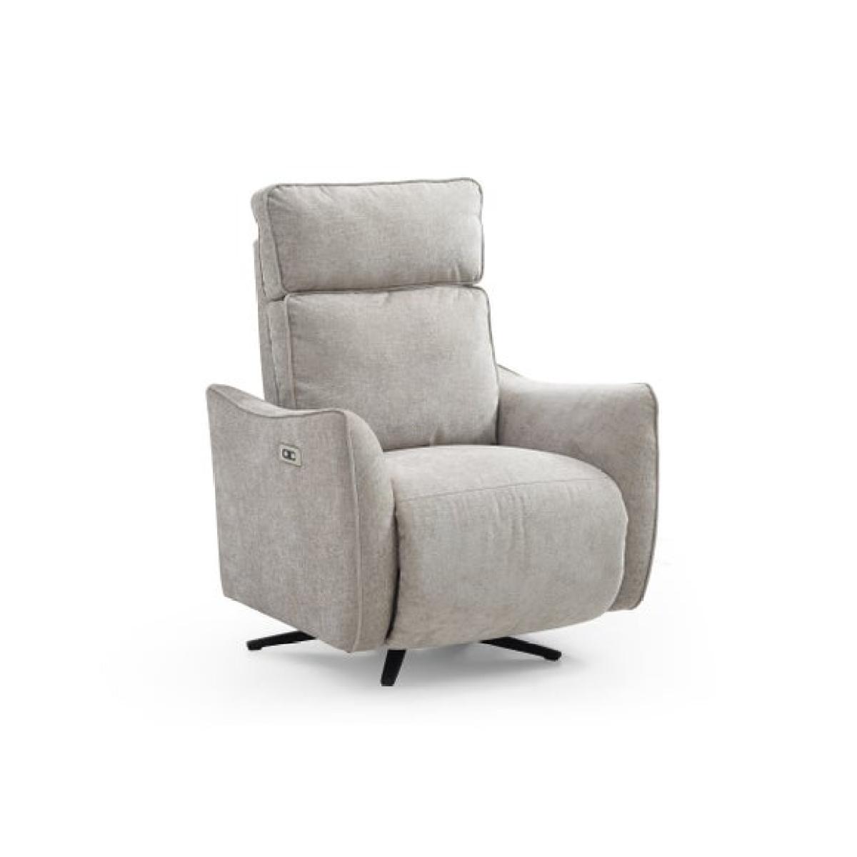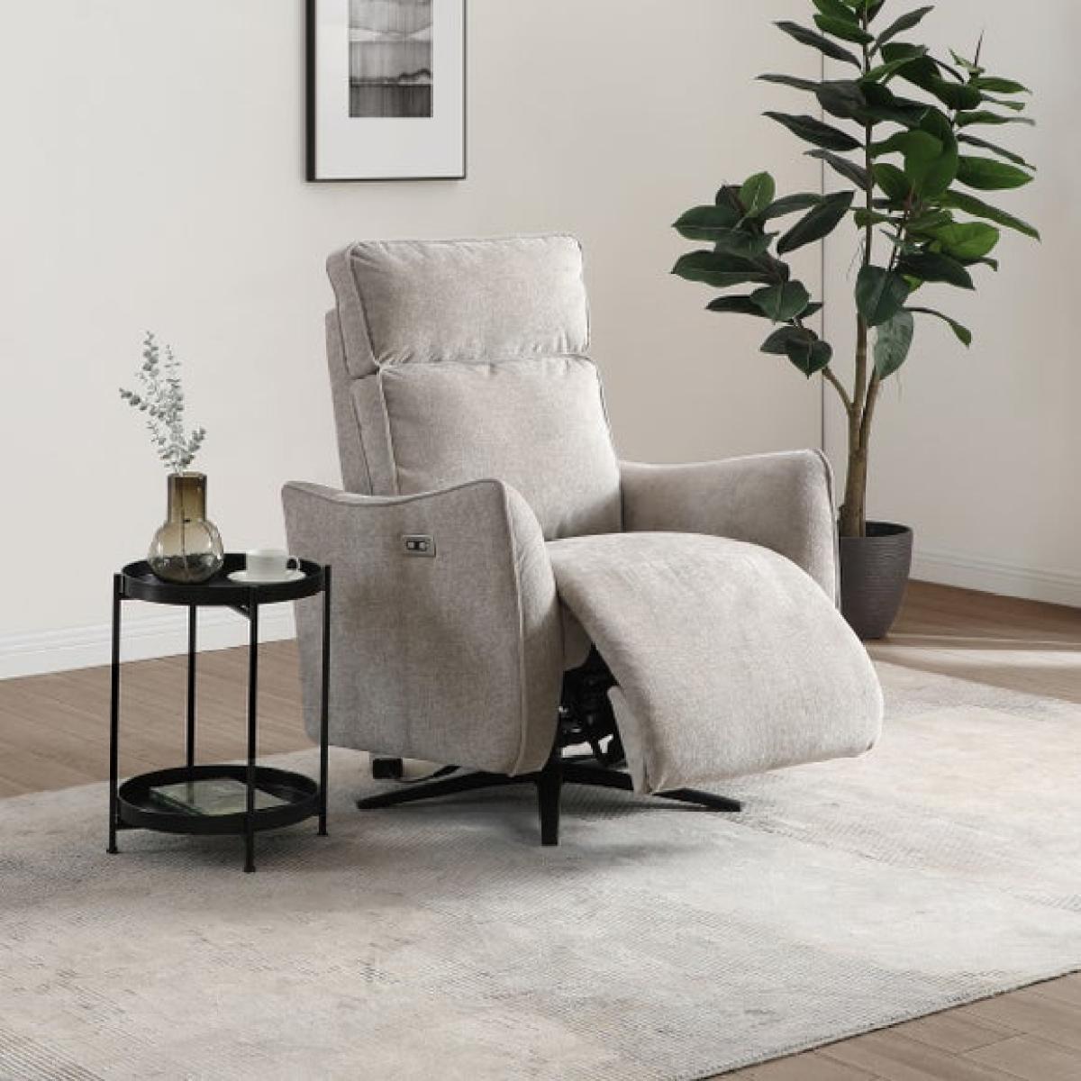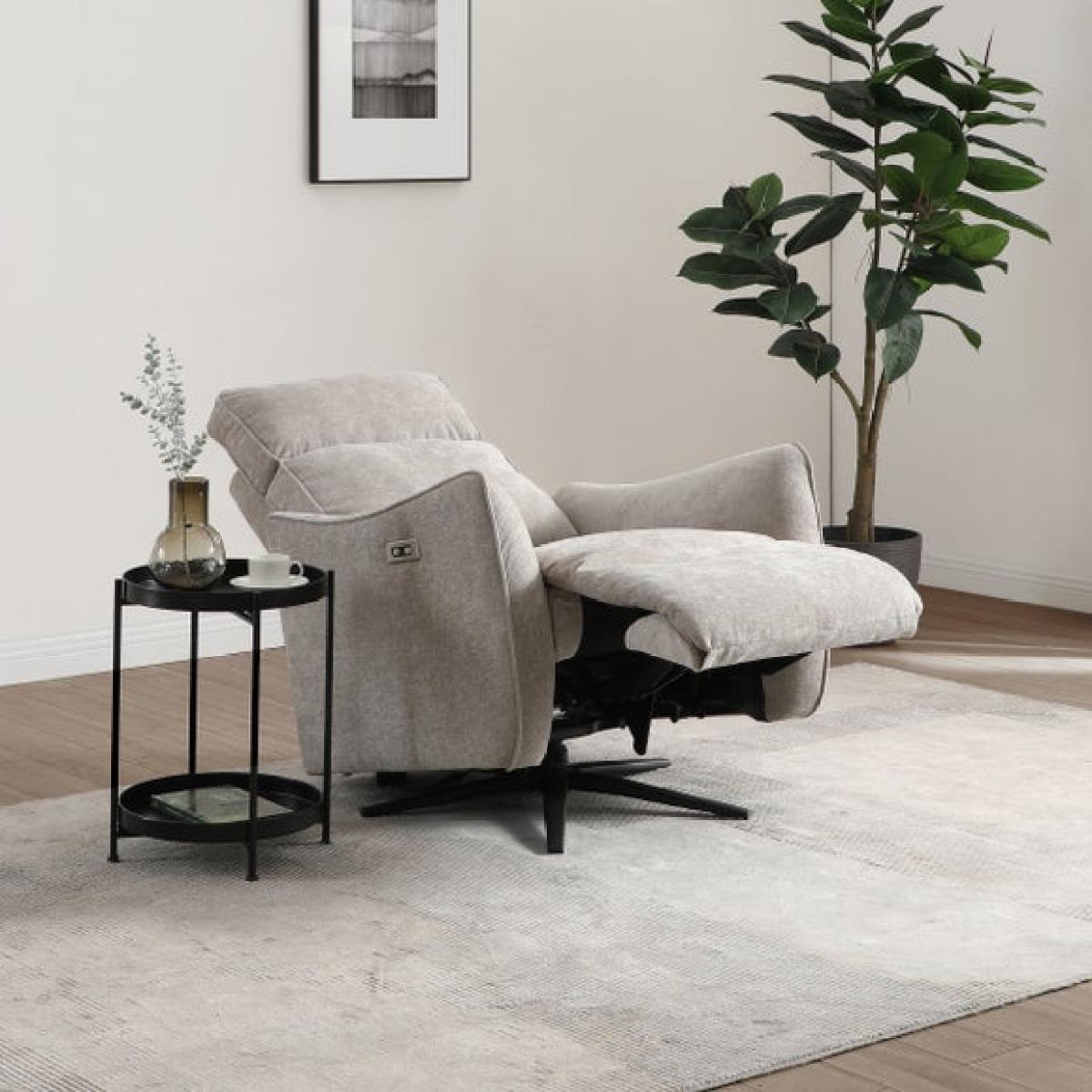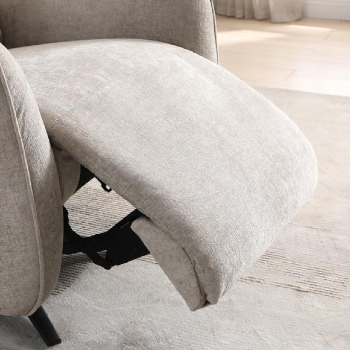 * Electric recliner chair * Smooth swivel base * Plush cushions * Tested up to 135kg Relax in refined comfort with the Emil recliner swivel chair. This elegant recliner boasts an electric mechanism that lets you adjust the back and footrest independently, all while enjoying a smooth swivel motion. The soft chenille fabric in a warm natural tone pairs beautifully with the chair’s sculptural armrests and tailored piping.