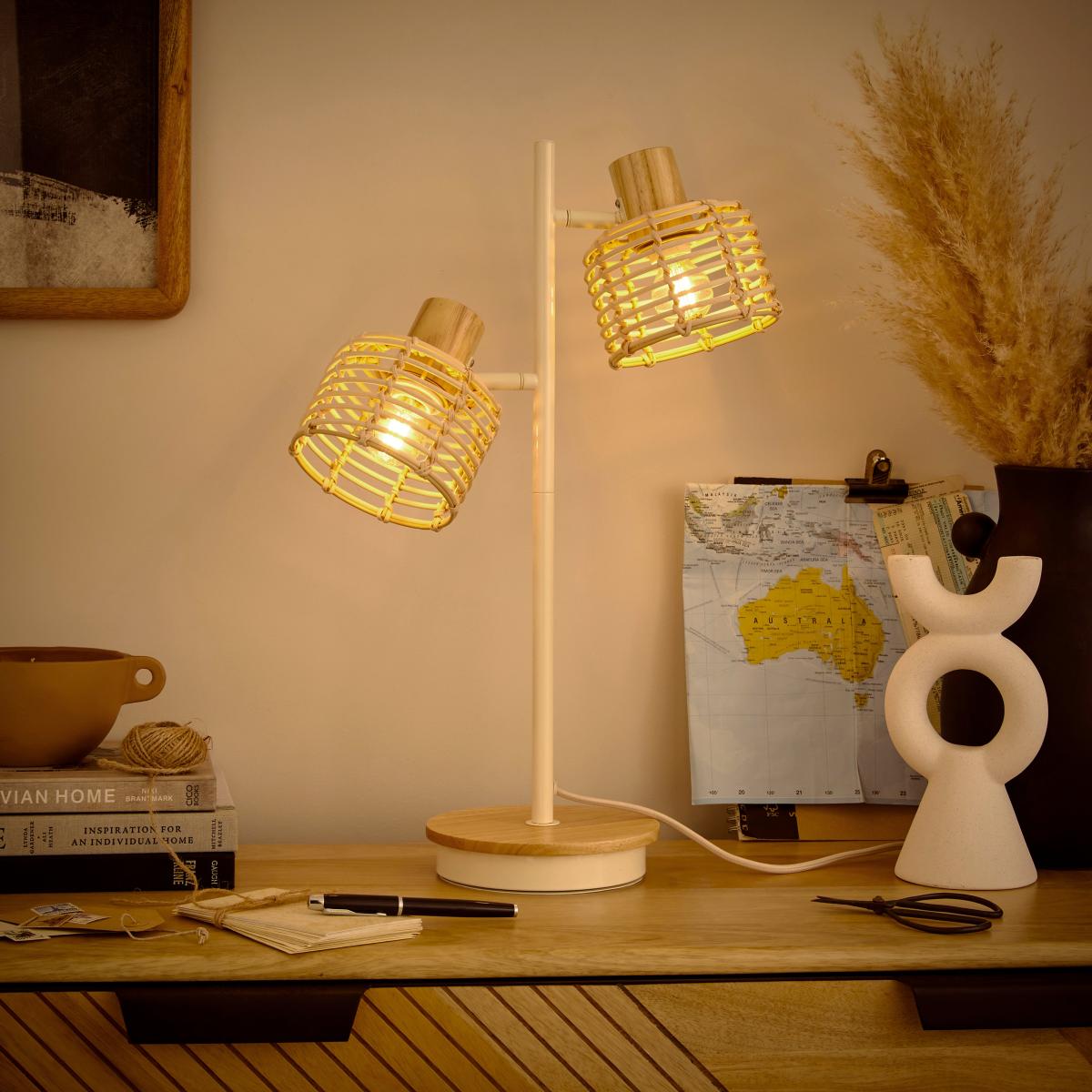 * Charming Design* Handmade with Care* Adjustable Shades* Crafted from FSC Rattan Illuminate your space with the natural beauty of the Emil Rattan 2 Light Adjustable Table Lamp. Handmade with care, it features a gorgeous design crafted from rattan, emitting a decorative light that adds warmth to any room. With adjustable heads, you can customise the lighting to suit your needs, making it perfect for reading or creating ambience.