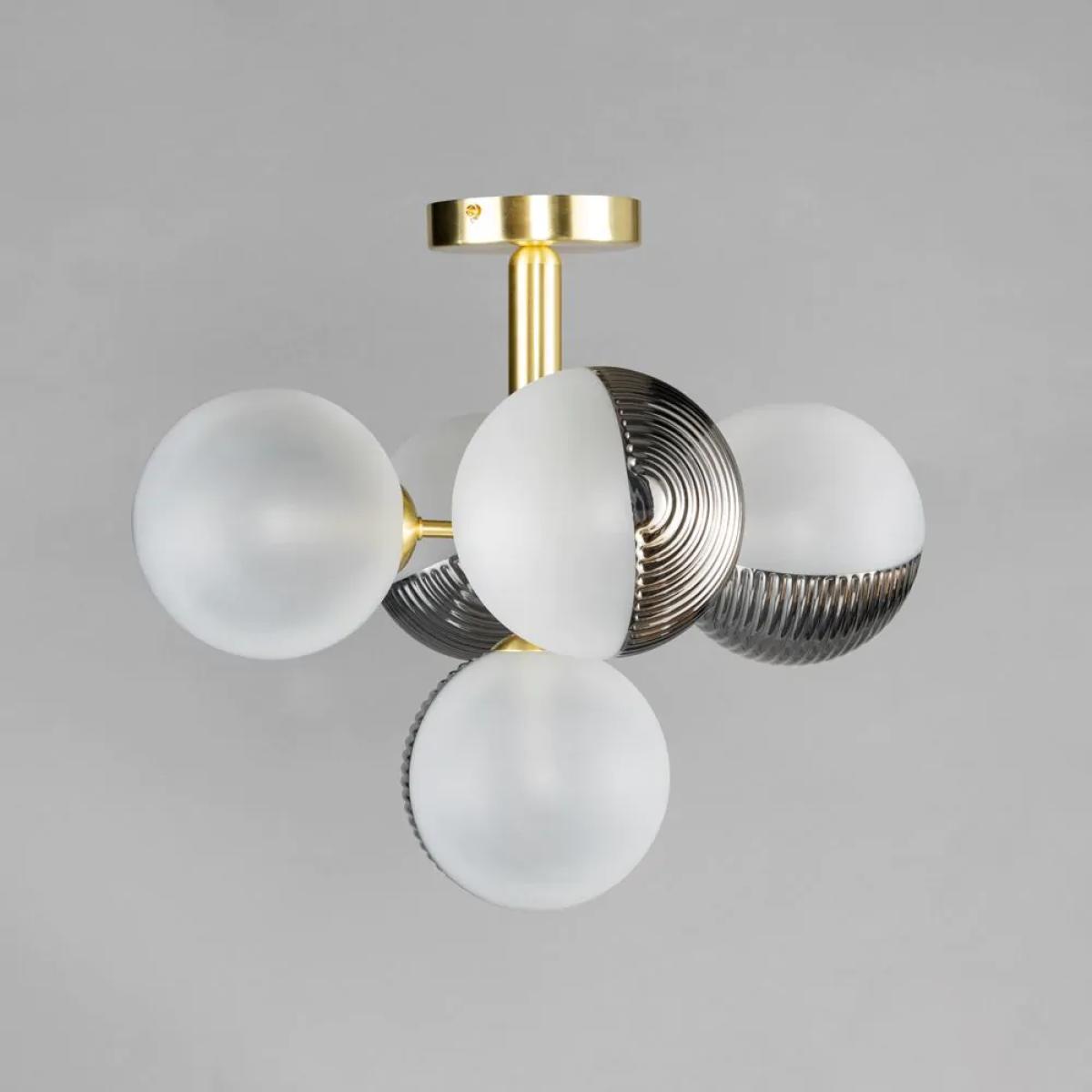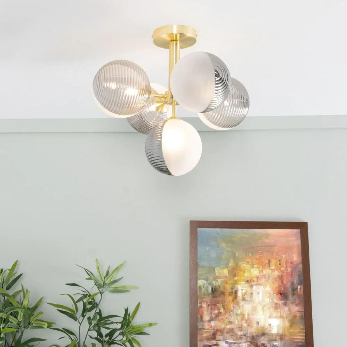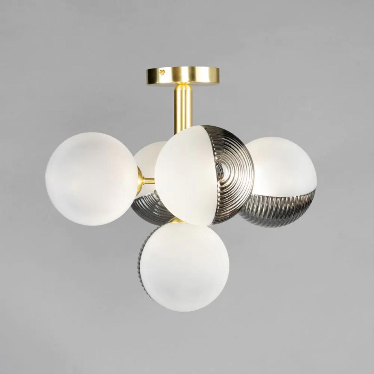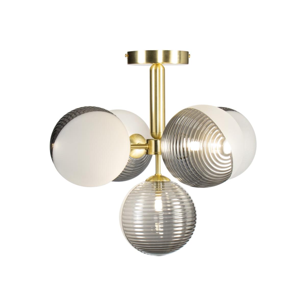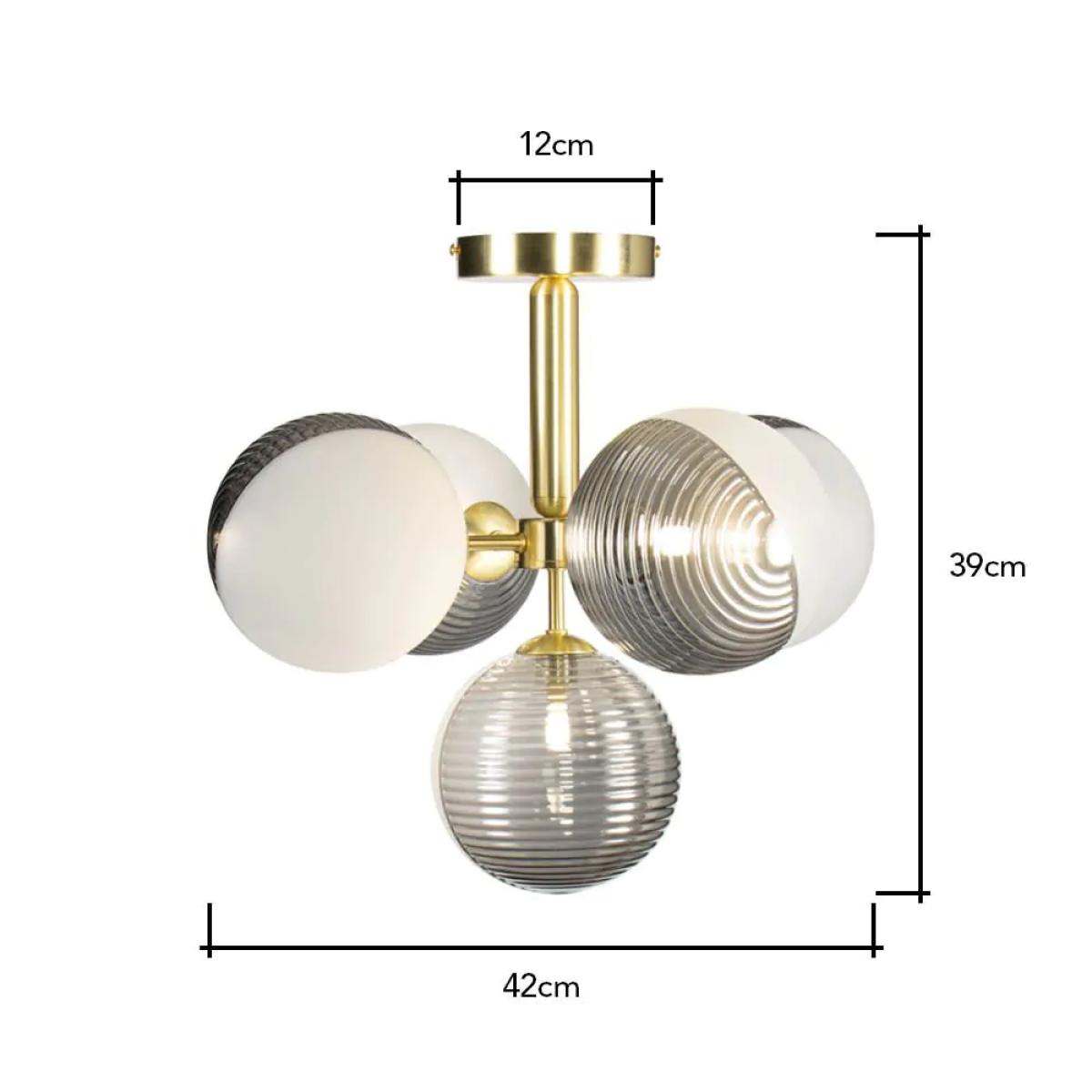 Contemporary lighting design for your interior décor with the Emile Semi Flush Ceiling Light with Smoked and Opal Glass Shades. This ceiling light comes in a beautiful brass finish for an art deco vibe and features a collection of spherical shades for an abstract appearance. It also looks ideal in any hallway, bedroom or landing and has half opal glass half ribbed smoke glass shades for a unique look and an atmospheric glow projected outwards.