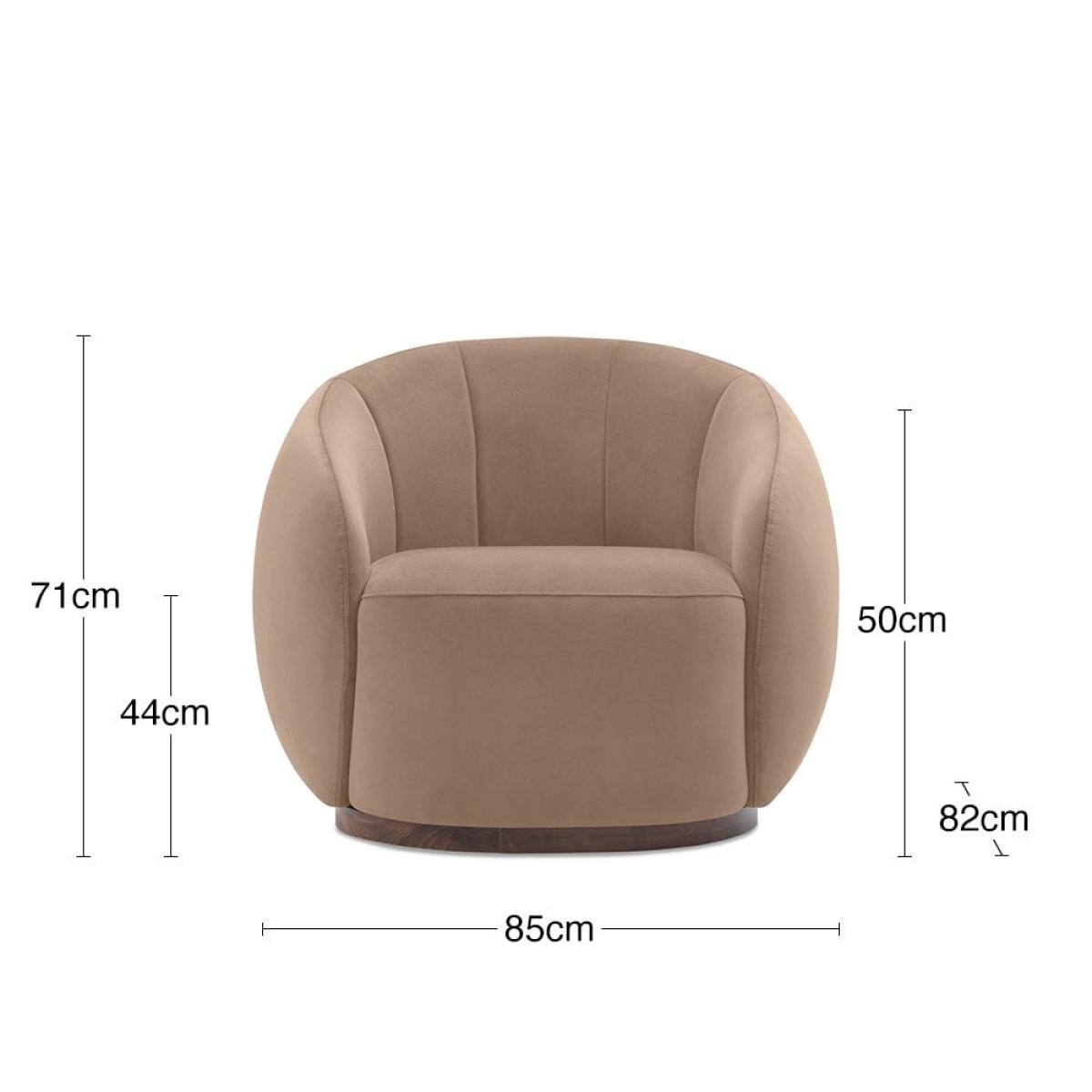 Inspired by 70s Revival, the Emile Velvet Armchair is a modern take on classic retro style. With curved lines and soft velvet upholstery in taupe, the Emile Armchair cocoons you in softness. Supportive, soft, comfortable with swivel function, the Emile is fun furniture design at its finest.  Finished with a wooden base and stitched finish on the backrest, this chair can be paired with natural wood furniture for that cosy relaxed living vibe. For a rich depth of colour and unique softness, our velvet used in this chair is not only of the highest quality but it is made from 100% recycled PET yarns so it is kinder to the environment too.