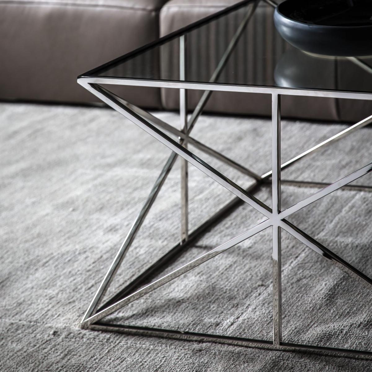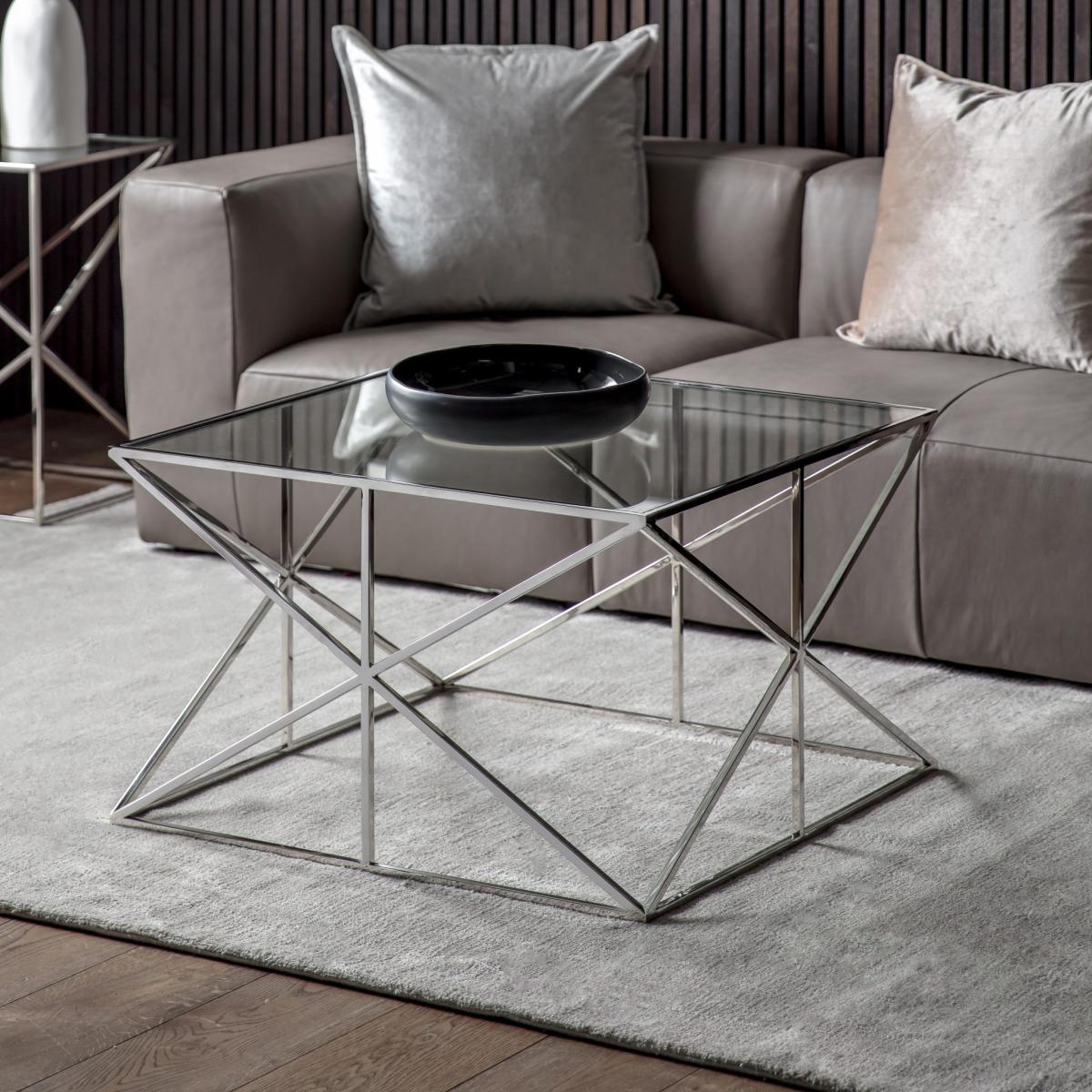 Add a chic sophisticated look to a room with the Parma Coffee Table, with its angular silver metal base and smoked glass top. It looks stunning paired with other pieces from the collection. Parma is also available in gold.