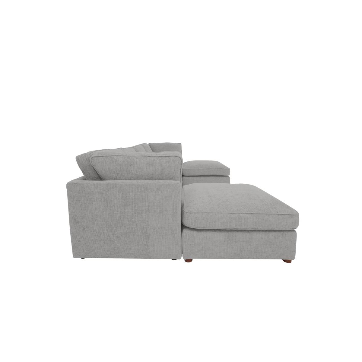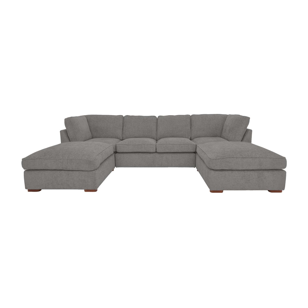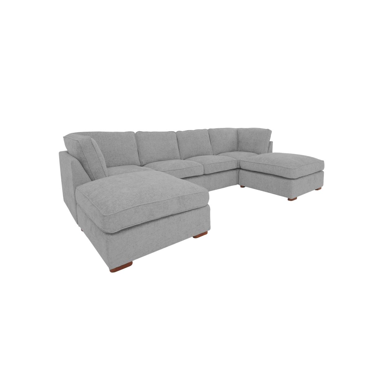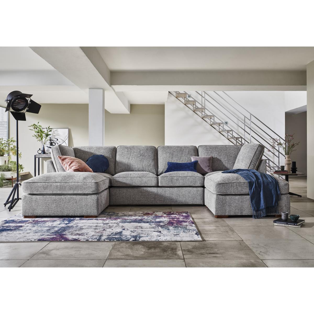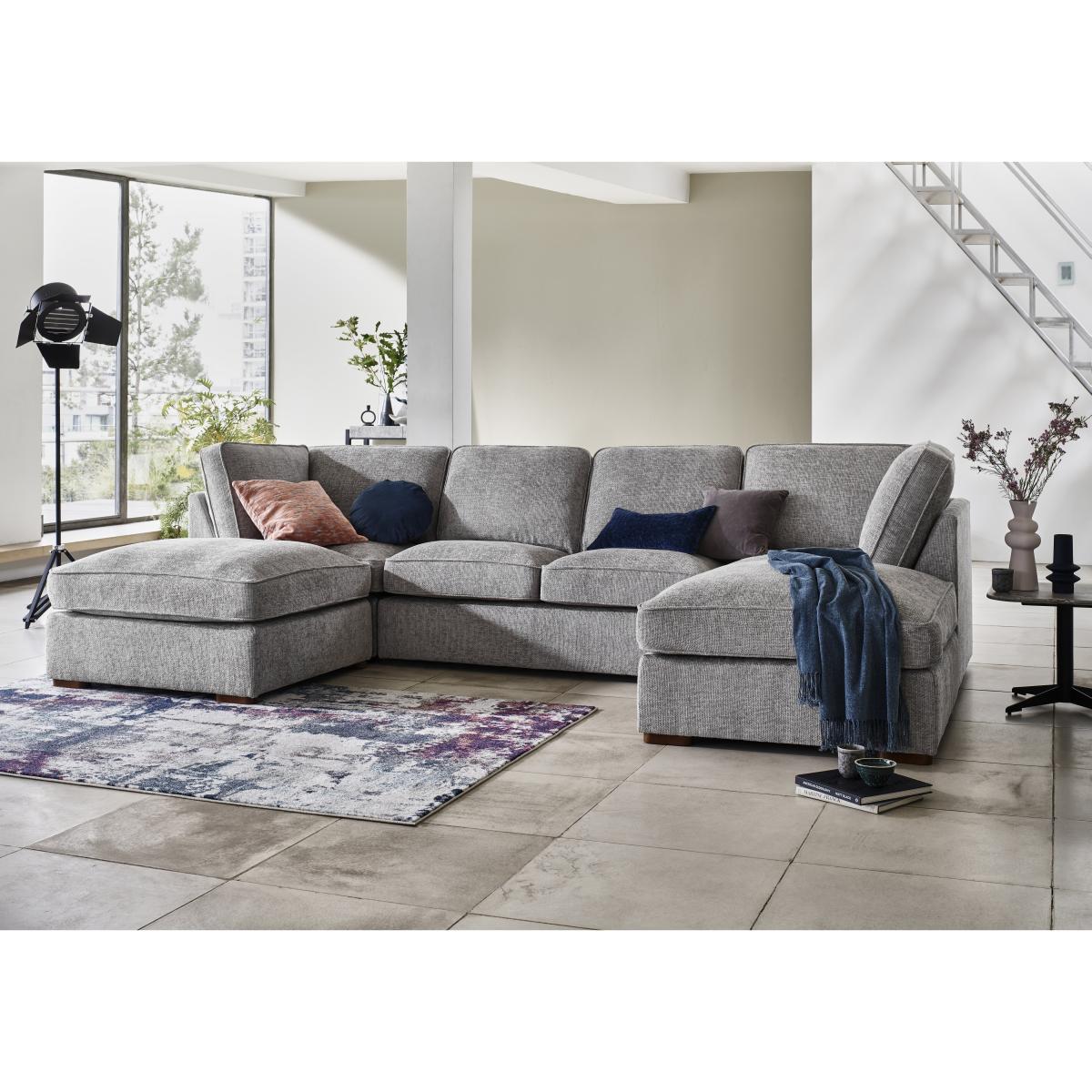 The Emilia range is built for lounging, with sprung seats and squishy cushions that hug you like an old friend. We love the soft hopsack chenille for a tactile upholstery that’s a joy to touch, and the small details like the dark wood feet and curved, cushioned arms are just the cherry on top. And with reversible back cushions, you can reduce wear and extend the life of your sofa or chair. All items in the Emilia range are available with fast delivery, so you can skip the queue and have your perfect sofa delivered sooner than you might think. Handcrafted in the UK exclusively for Furniture Village. Sofas don’t get much more inviting than our chenille-upholstered Emilia large U-shaped corner sofa. It actually has two corners, two chaise ends and super-comfy reversible cushioning. Why you’ll love it This large U-shaped corner sofa is designed for serious relaxation. It’s one of several sizes of U-shaped sofas in the range. Generously proportioned with wide arms and deep seats. With 2 reconfigurable footstools that form the chaise ends. Super-soft, densely woven hopsack chenille upholstery fabric feels so luxurious. Choose from a range of stylish and sophisticated colours. Dark wood feet. Reversible seat and back cushions mean this sofa stays beautiful for longer. Sturdy 9-gauge steel spring seat suspension for exceptional support. Handcrafted exclusively for Furniture Village. Made in the UK. This large U-shaped corner sofa is part of our Emilia range. Need a different size? Take a look at our Emilia standard U-shaped sofas and small U sofas. What you need to know Medium comfort level. Seat suspension: 9-gauge steel springs. Seat cushioning: polyurethane foam. Cushioning is reversible. Back suspension: webbing. Back cushioning: hollow blown fibre. Cushioning is reversible. Arm cushioning: hollow blown fibre. This U-shaped sofa will be delivered in 5 pieces. Please measure carefully to ensure adequate access for our delivery team. Plump, turn and rotate seat and back cushions to promote longer cushion life. Some fabrics can show wear on areas of more use or in direct sunlight. Pile crush and shading are natural characteristics of chenille. Clean regularly using a soft brush or vacuum with the curtain attachment. Deal with any spills promptly. Professional cleaning advised for oil- and grease-based stains. Please read our upholstery care guide for more advice.