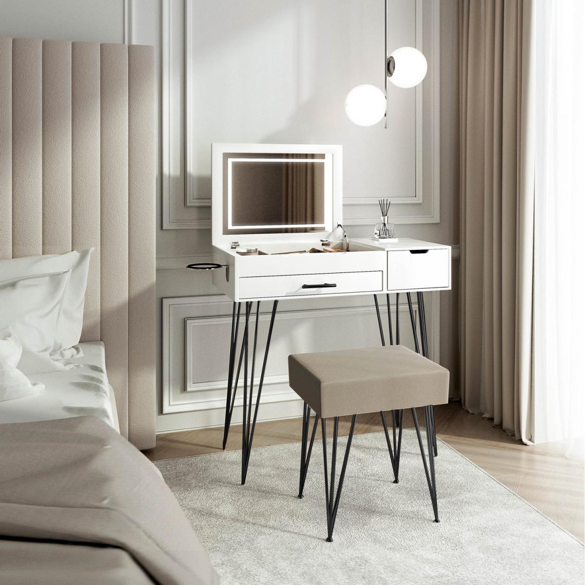 The Emilie flip top dressing table is the perfect solution to keep a space organised and tidy while adding style to your interior. The dressing table will add elegance to any room with the on-trend hairpin legs and drawer handle. Flip the lid of the Emilie to reveal a mirror illuminated with LED light and a nine-compartment makeup organiser, there is a designated space for all your beauty essentials. The makeup organiser is complete with a sleek handle and accompanied by a storage drawer. Getting ready is effortless with the handy hair dryer holder, built-in USB port and universal plug. Complete with a matching padded stool for comfort this dressing table will uplift your home and your getting ready routine. The Emilie flip top dressing table is the perfect solution to keep a space organised and tidy while adding style to your interior. The white dressing table will add elegance to any room with the on-trend black hairpin legs and black drawer handle. Flip the lid of the Emilie to reveal a mirror illuminated with LED light and a nine-compartment makeup organiser, there is a designated space for all your beauty essentials. The makeup organiser is complete with a sleek black handle and accompanied by a storage drawer. Getting ready is effortless with the handy hair dryer holder, built-in USB port and universal plug. Complete with a matching padded stool for comfort this dressing table will uplift your home and your getting ready routine.