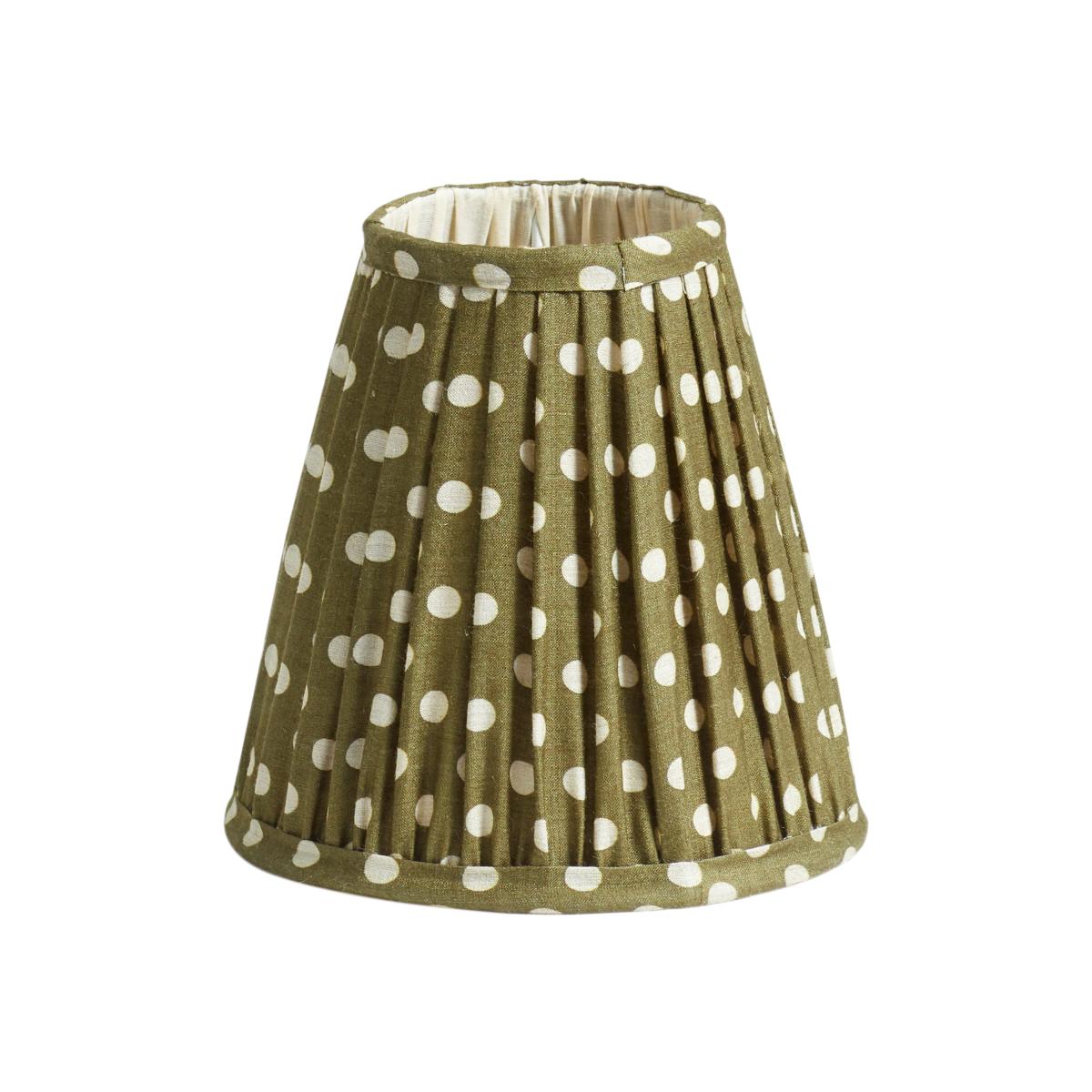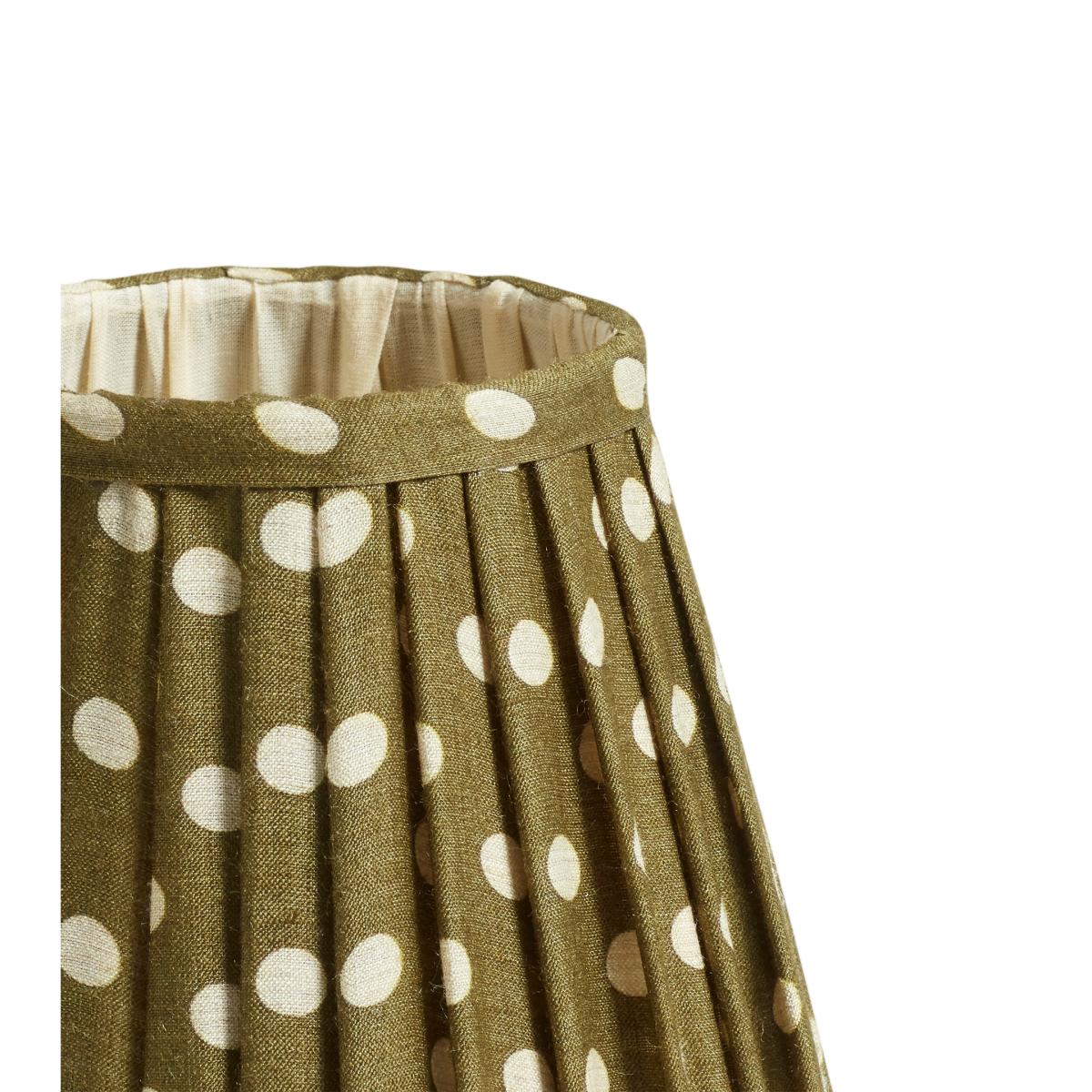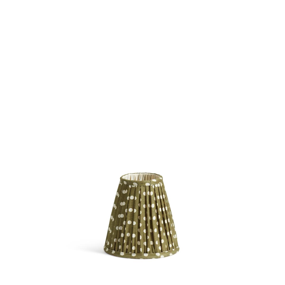 Our cone lampshades are pretty and petite, and this one is all the more so due to its charming spot pattern. Botanical-inspired green tones decorate the body of the lined, pleated silk shade, complete with matching piping. Originally designed to pair with our Ziara and Olira Wireless Table Lamps, this cone shade would work equally well sat atop other petite lamps in your collection and is especially well suited to wall lamps.