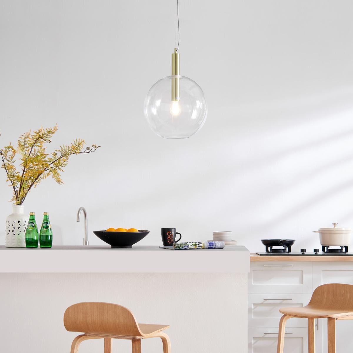 I love this glass pendant in brass as it brings a sleek, modern touch while maintaining a timeless appeal. Its clear glass globe helps diffuse light softly, making it ideal for kitchens, dining areas, or even open-plan living spaces. Pair it with minimalistic or Scandinavian interiors for a fresh, understated look, or combine it with brass accents elsewhere in the room for a cohesive effect. Practical styling tips include hanging it at varying heights over a kitchen island or dining table to create visual interest, and keeping surrounding accessories simple to allow the pendant’s clean design to stand out. This light truly complements contemporary and transitional interiors, adding a touch of elegance without overwhelming the space.
