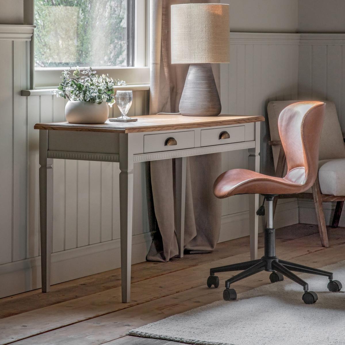 I love this piece because of its versatile, timeless appeal and the rich taupe finish that adds warmth to any space. It works particularly well in cosy home offices, vintage-inspired interiors, or traditional studies, but can also complement modern minimal schemes with its clean lines. For styling, keep the top clutter-free with a few well-chosen accessories like a decorative lamp, a small plant, or organisers in complementary tones. Pairing it with a soft fabric chair or a vintage-inspired piece can add character and comfort while maintaining its practical function. Its two drawers offer useful storage, making it both stylish and functional.