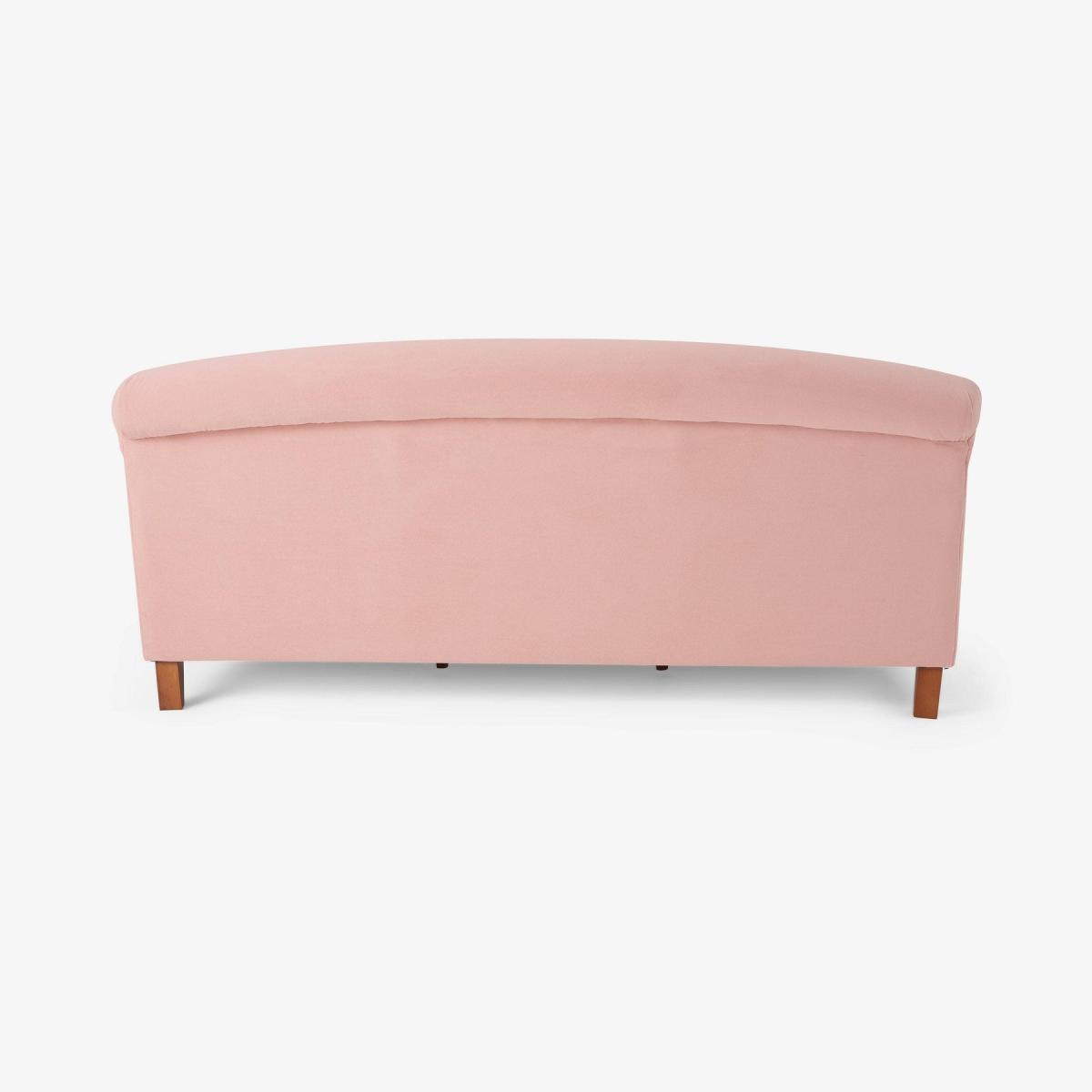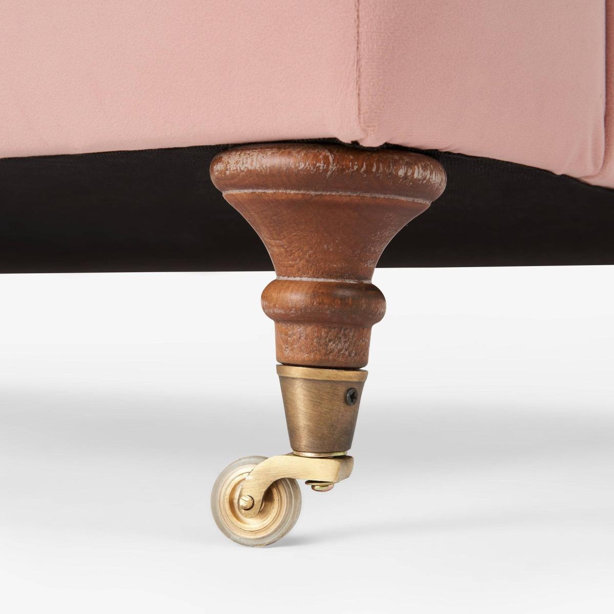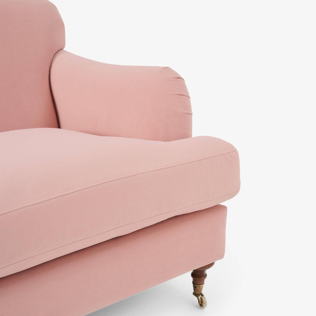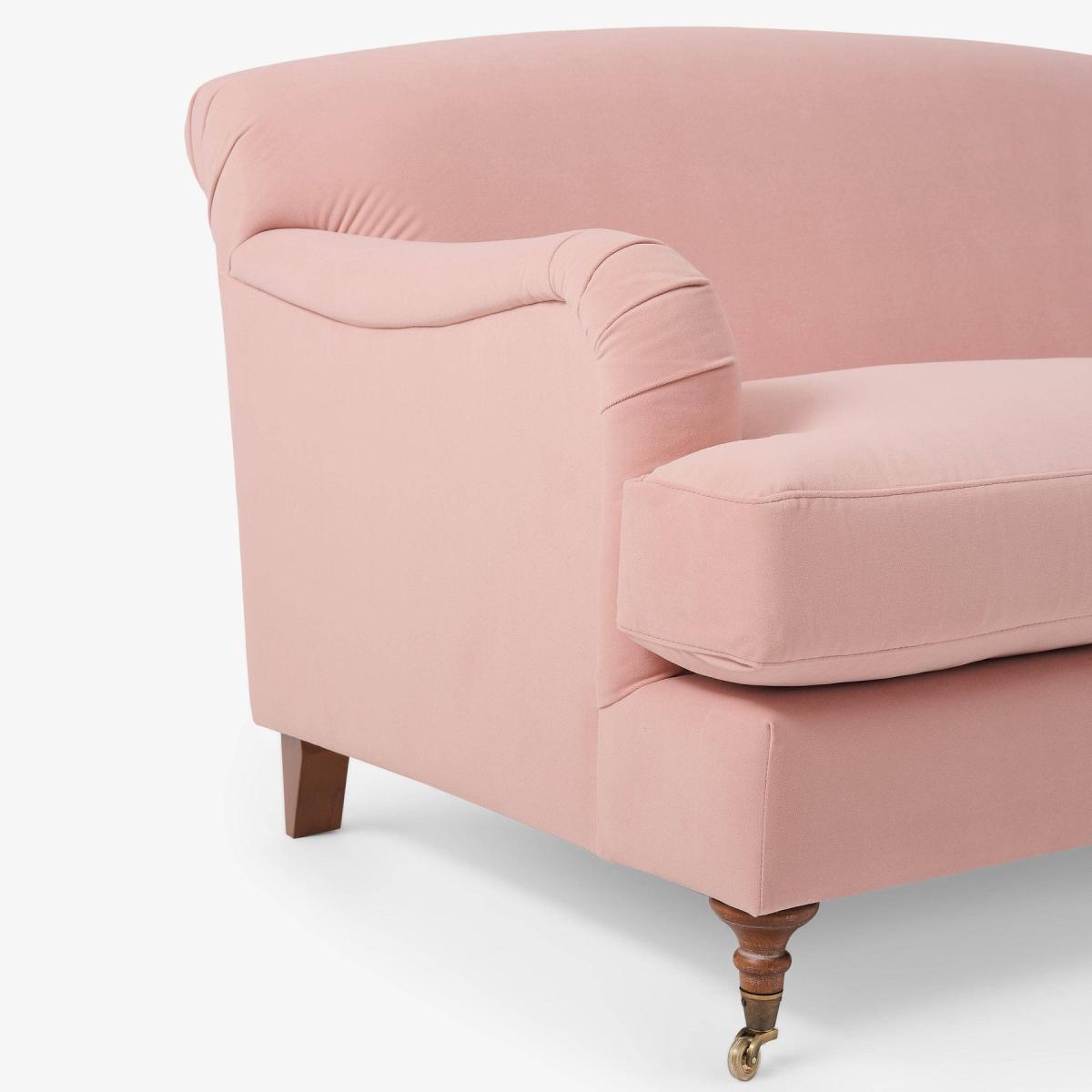 You’ve just arrived at your dream sofa destination; meet Emin, our 2-seater sofa upholstered in blush-pink velvet. With its classic mid-century shape that will stand out in any room, this sofa is an instant classic. The frame is made of hornbeam wood with foam filling for plenty of softness and pleated round arms for sophisticated charm. Finished with two age-effect-turned wooden legs in front and two block legs at its back, Emin also comes with stunning bronze castors for a timelessly elegant look and wide, soft cushion seats. This impeccable sofa comes with two detachable seat cushions with removable covers for any spills. Emin comes with a verified flame retardant certificate that complies with UK safety regulations. Also available is a matching armchair with a button-back design.